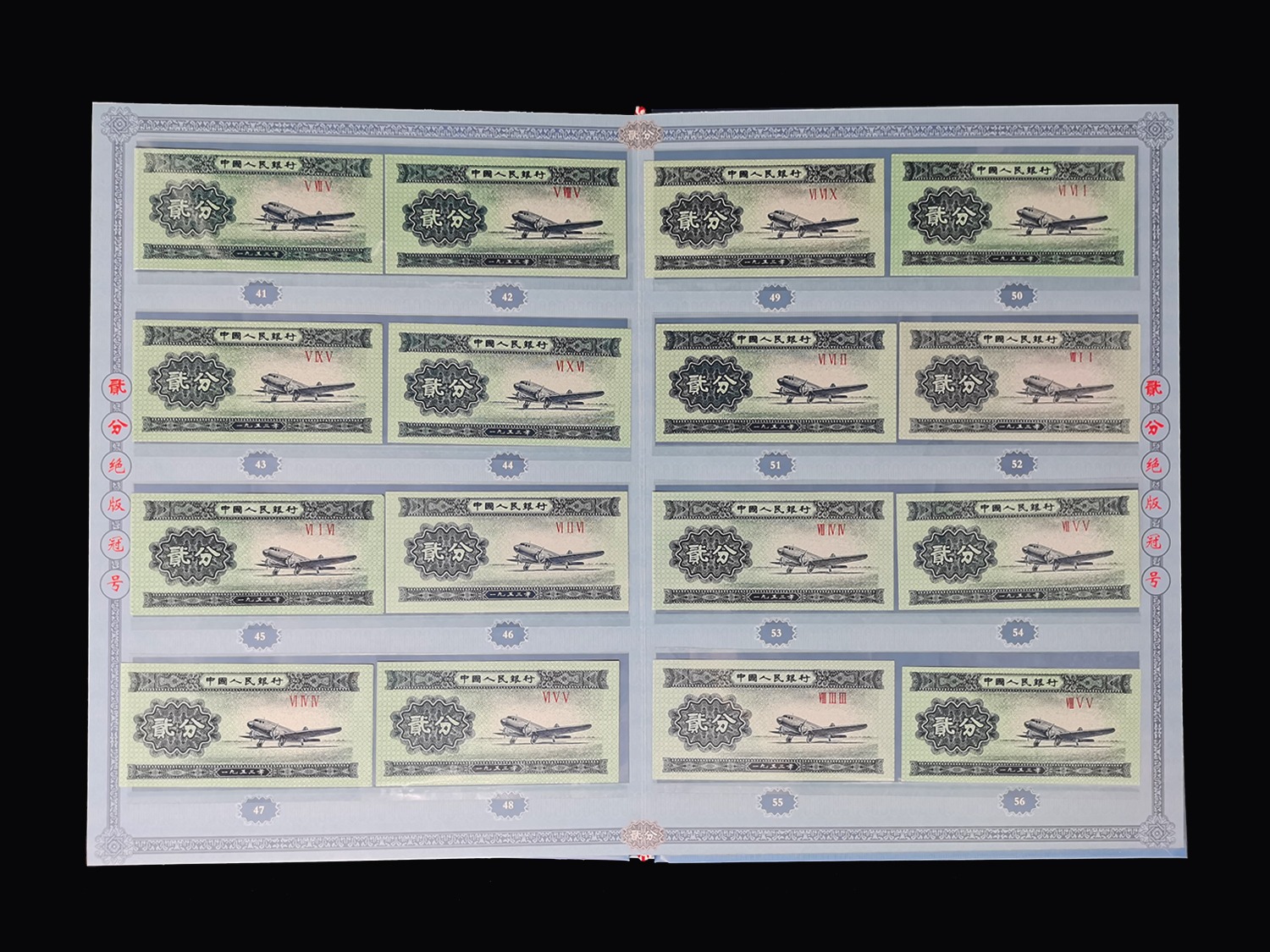 2分纸币绝版冠号!全套共60个三罗马冠号!二分纸币早已退出流通,早期号券销毁较多留存数量极少,且分布零散,需要全国各地的藏友联合才能完成冠号收藏,因此收藏难度极大,目前全套数量不足万套!收录了目前所能找到的,并且品相完好的2分纸币,成套数量不多,非常珍贵!