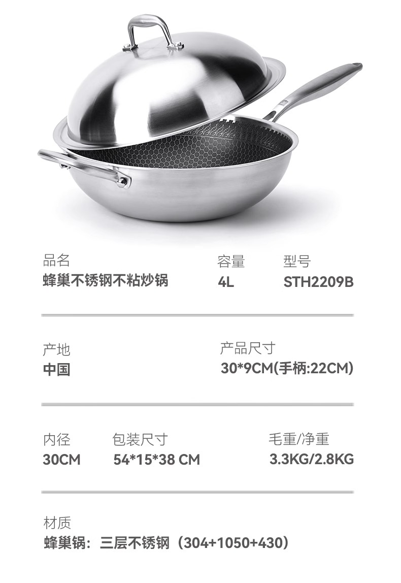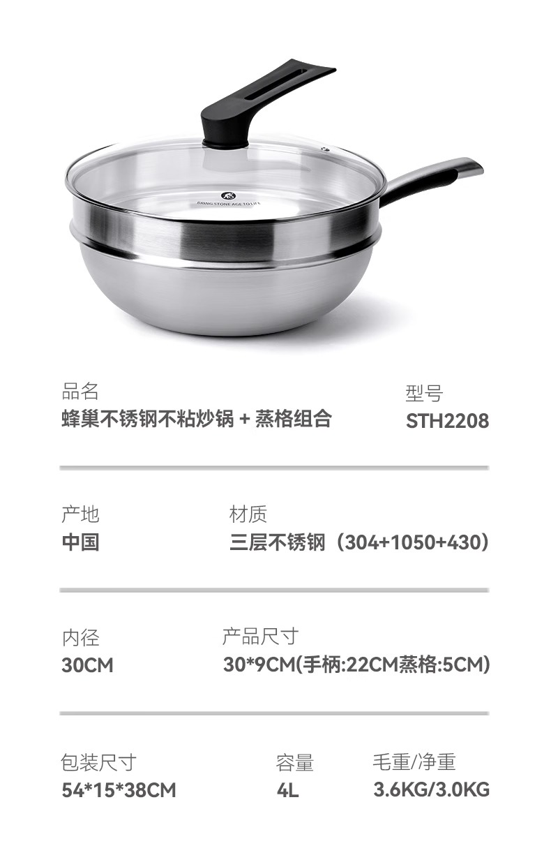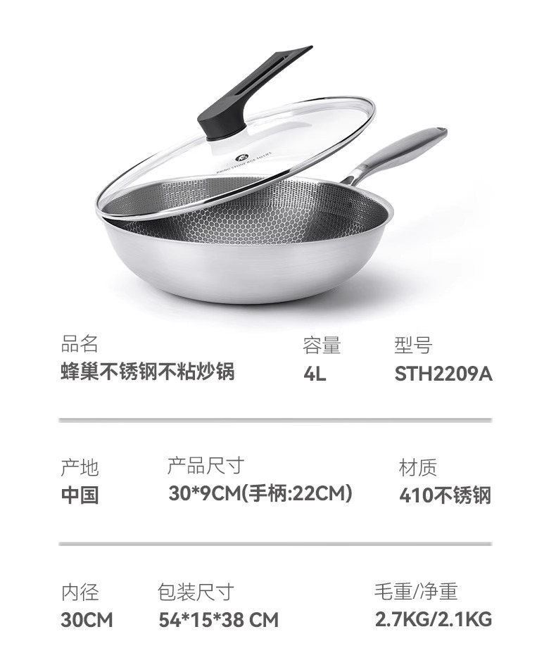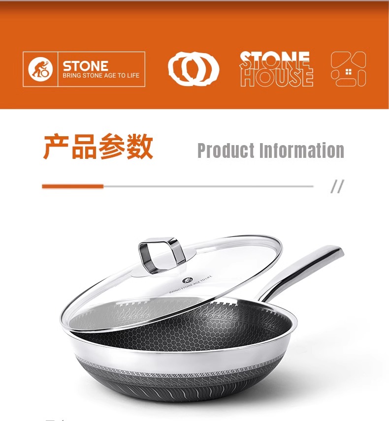 【自营】司顿-蜂巢不锈钢不粘炒锅 银色
