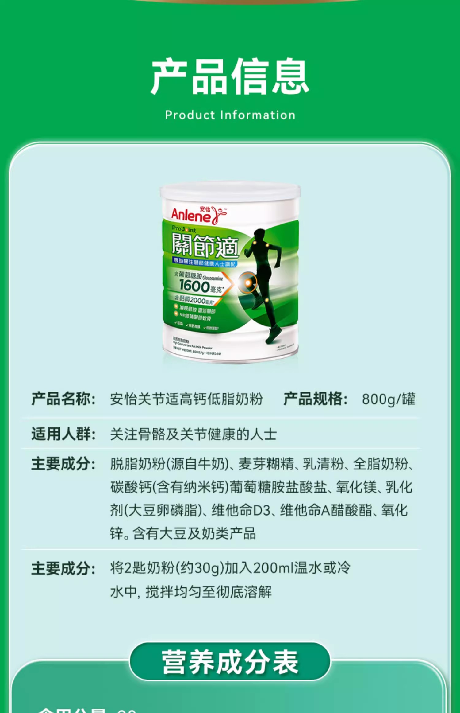 安怡Anlene 关节适高钙低脂成人奶粉 800g