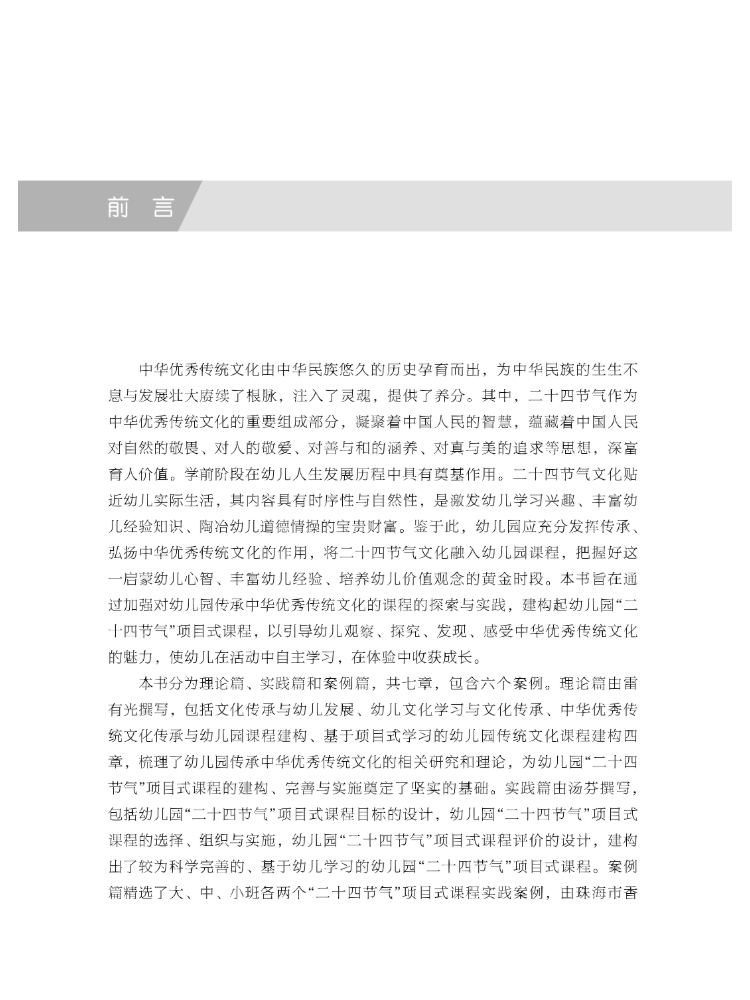 本书为广东省(2021—2023)汤芬学前名师工作室成果、广东省(2024—2026)汤芬幼儿园名园长工作室成果、广东省“十三五”重点规划课题研究成果。本书围绕“幼儿是如何学习文化的?在幼儿阶段传承中华优秀传统文化的有效方式是什么?幼儿园应如何建构传承中华优秀传统文化的园本课程?”这三个关键问题展开,以“文化内容”为基础、强调“项目式学习”的幼儿园传统文化课程,将儿童的文化学习作为切入点,以儿童文化学习的内在机制为底层逻辑,系统梳理了幼儿园传承中华优秀传统文化的相关理论与成果。中华优秀传统文化承载着中华民族五千年文明的历史传统,是中华民族传承和发展的根基,也是一个儿童成长为“中国人”的精神源泉。“二十四节气”作为中华优秀传统文化的重要组成部分,凝聚着中国人民的智慧结晶,蕴藏着敬天爱人的深刻哲理,对启蒙幼儿心智、增长幼儿经验、培养幼儿的价值观念具有重要的教育价值和功能。