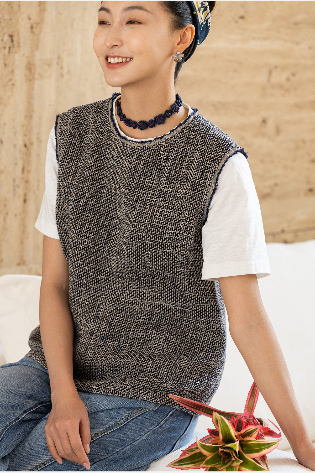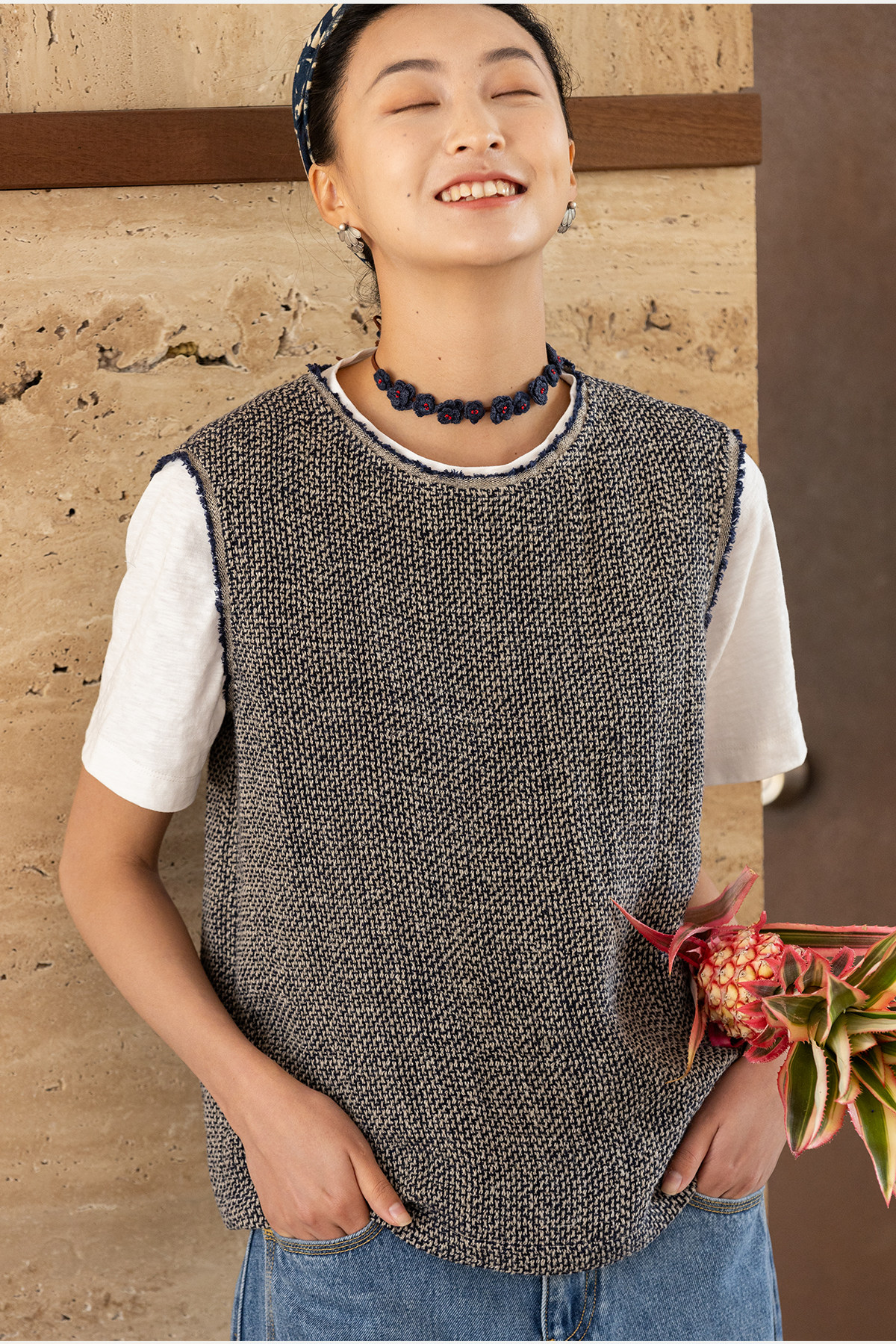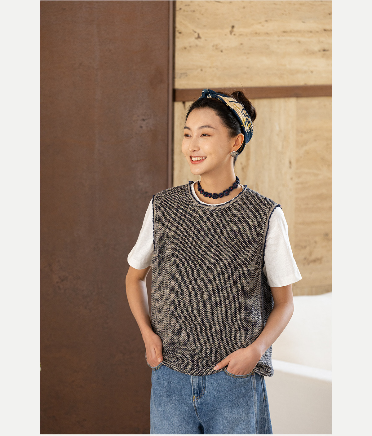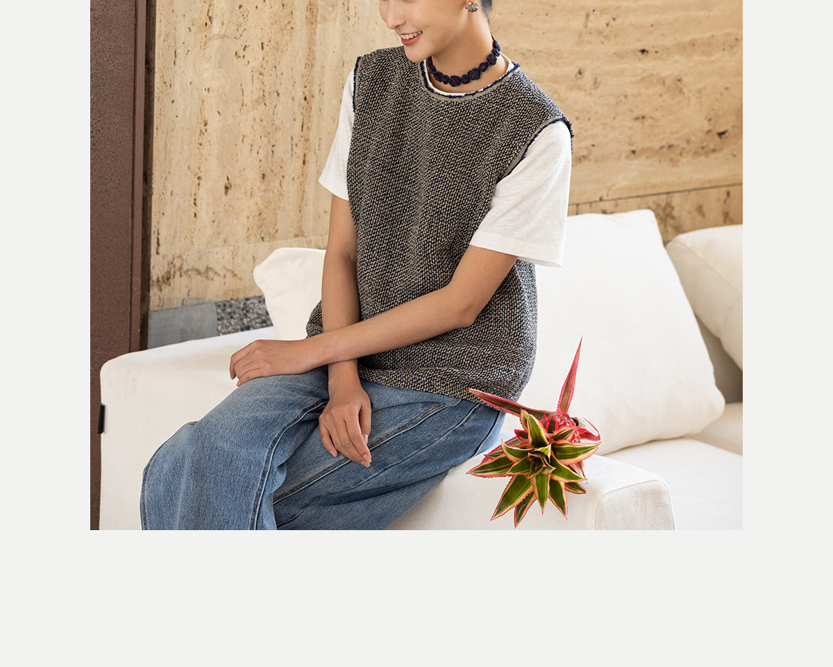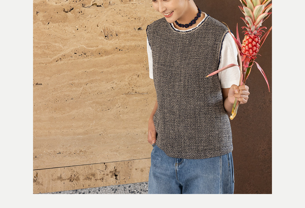 牧衣游原创 精细亚麻马夹女新款质朴肌理文艺圆领套头上衣 欣语