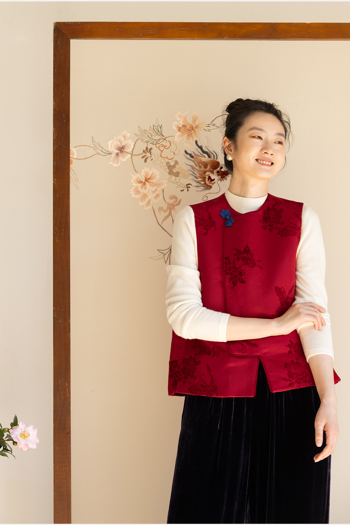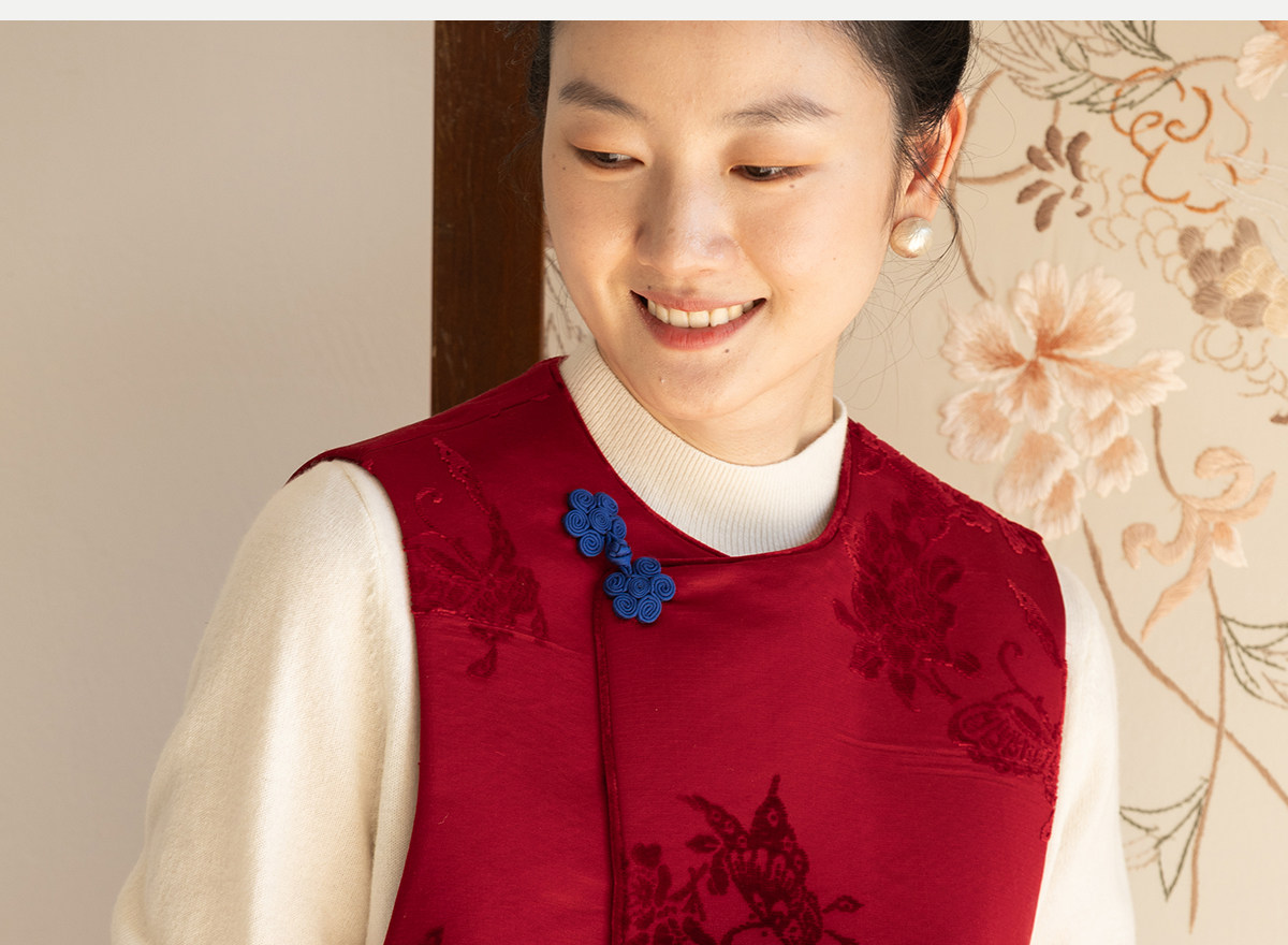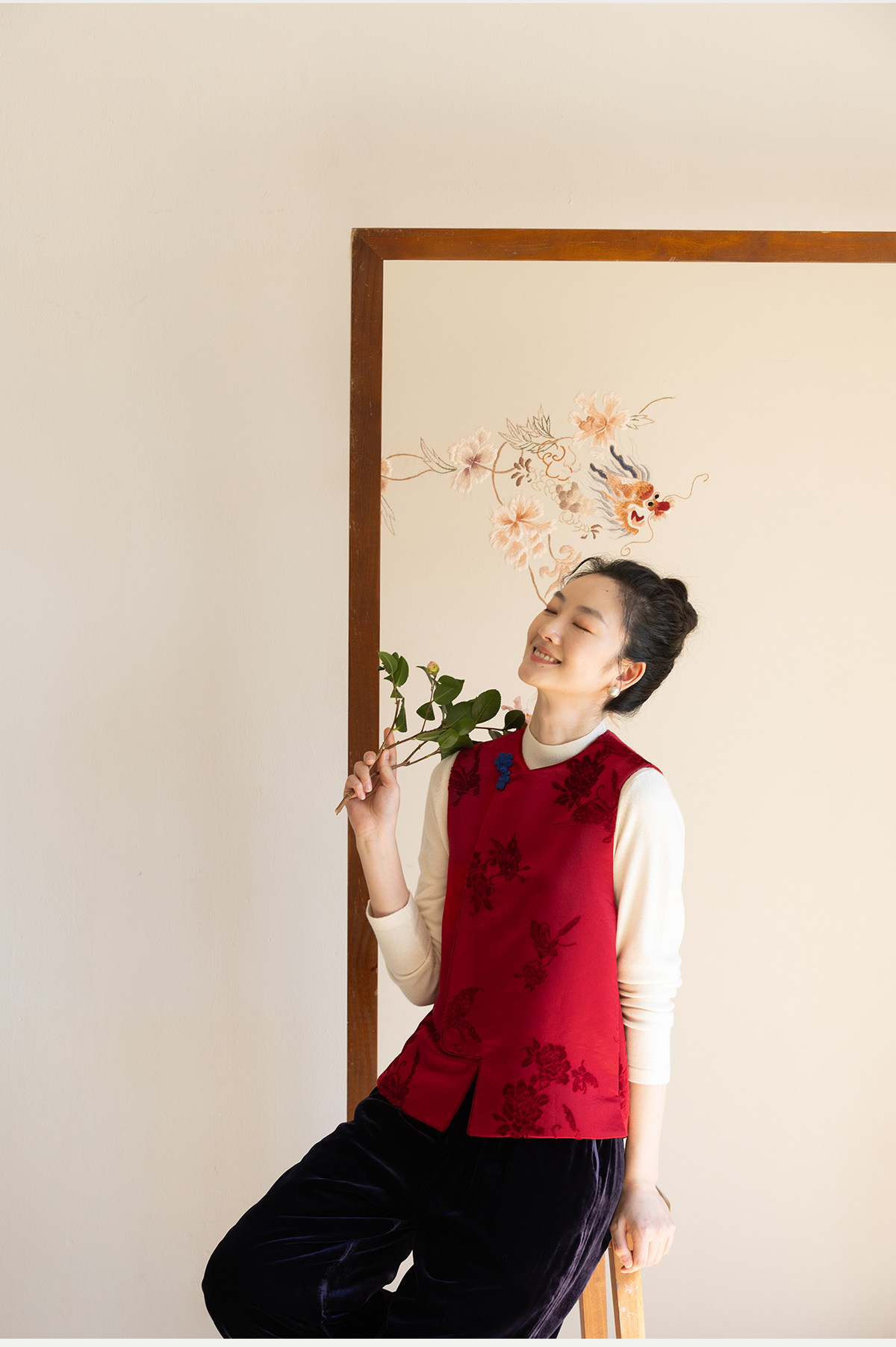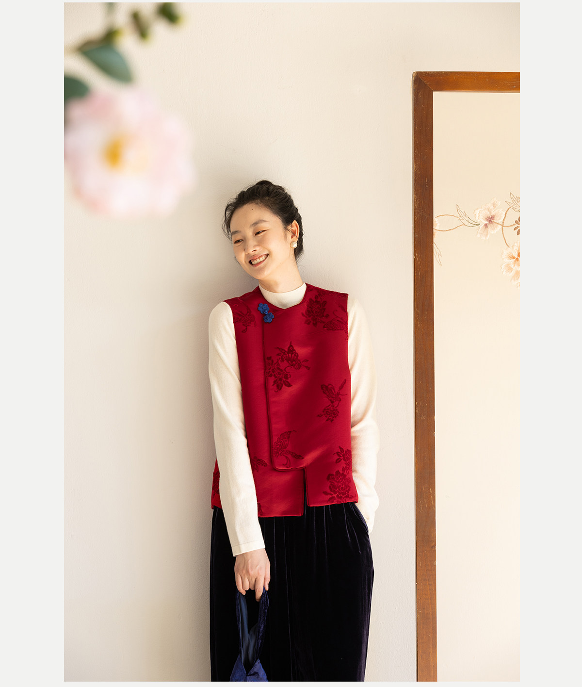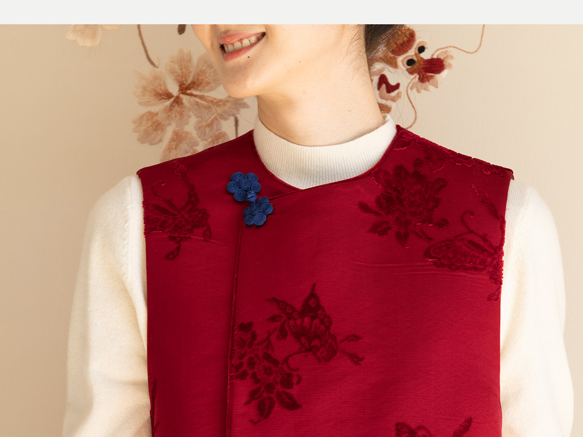 牧衣游原创 45姆米重磅非遗漳缎真丝浮雕马夹中式红色年服 喜柿
