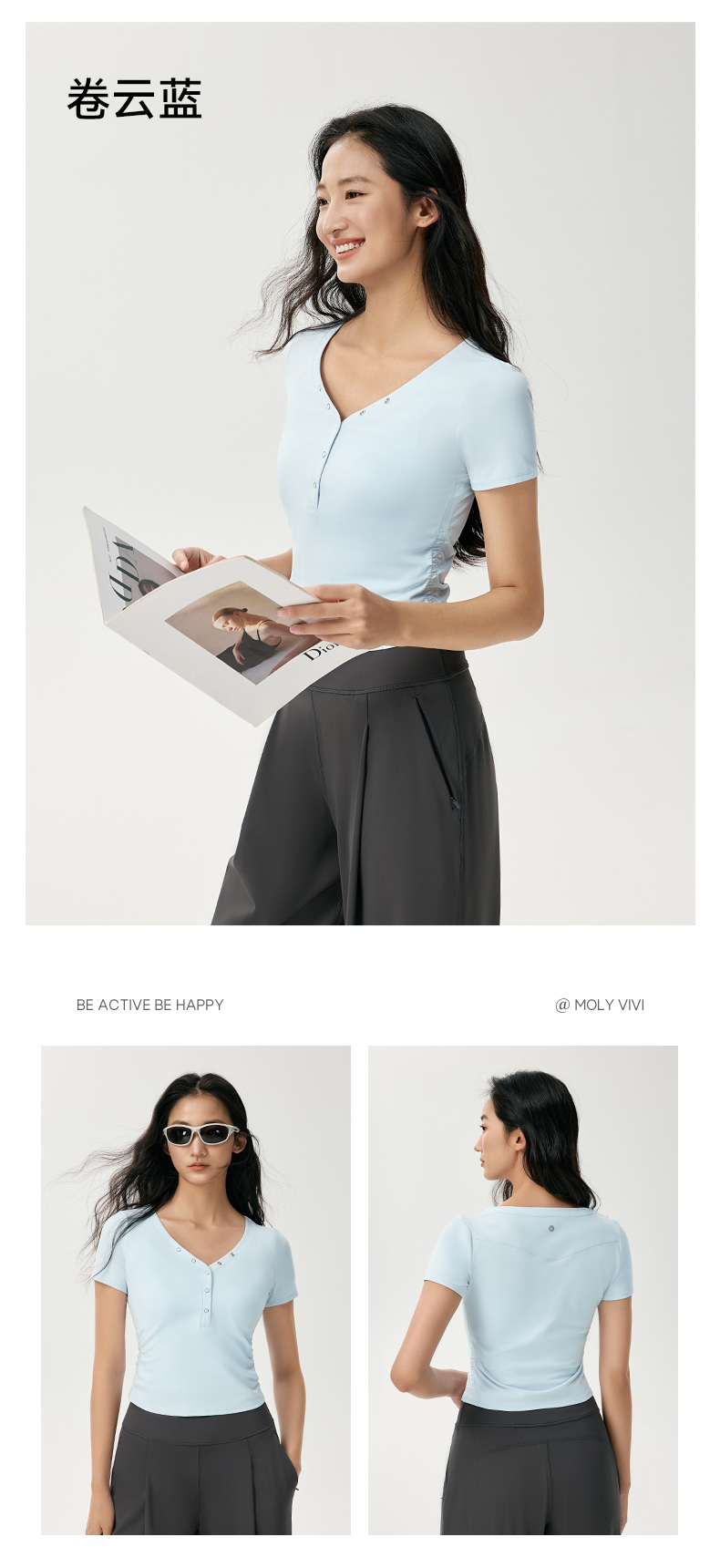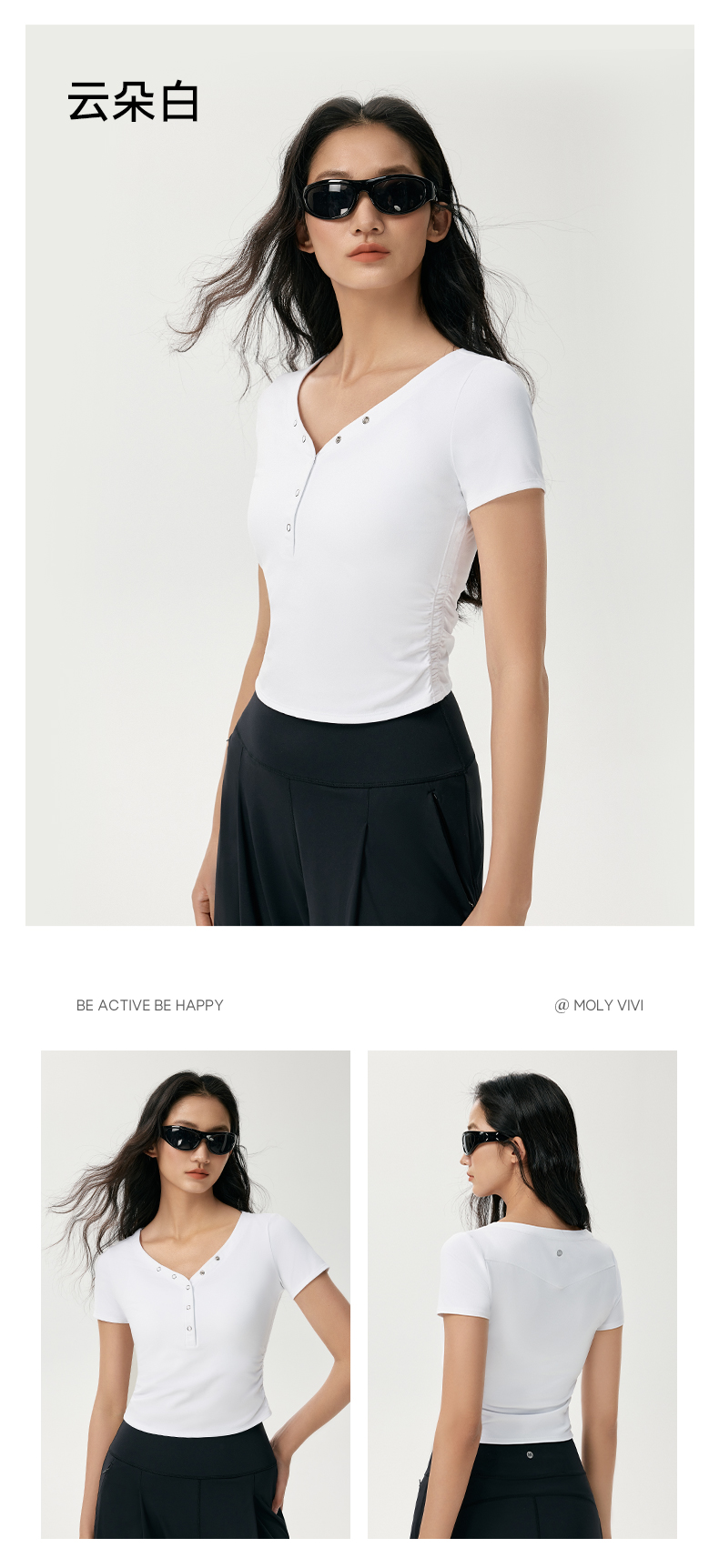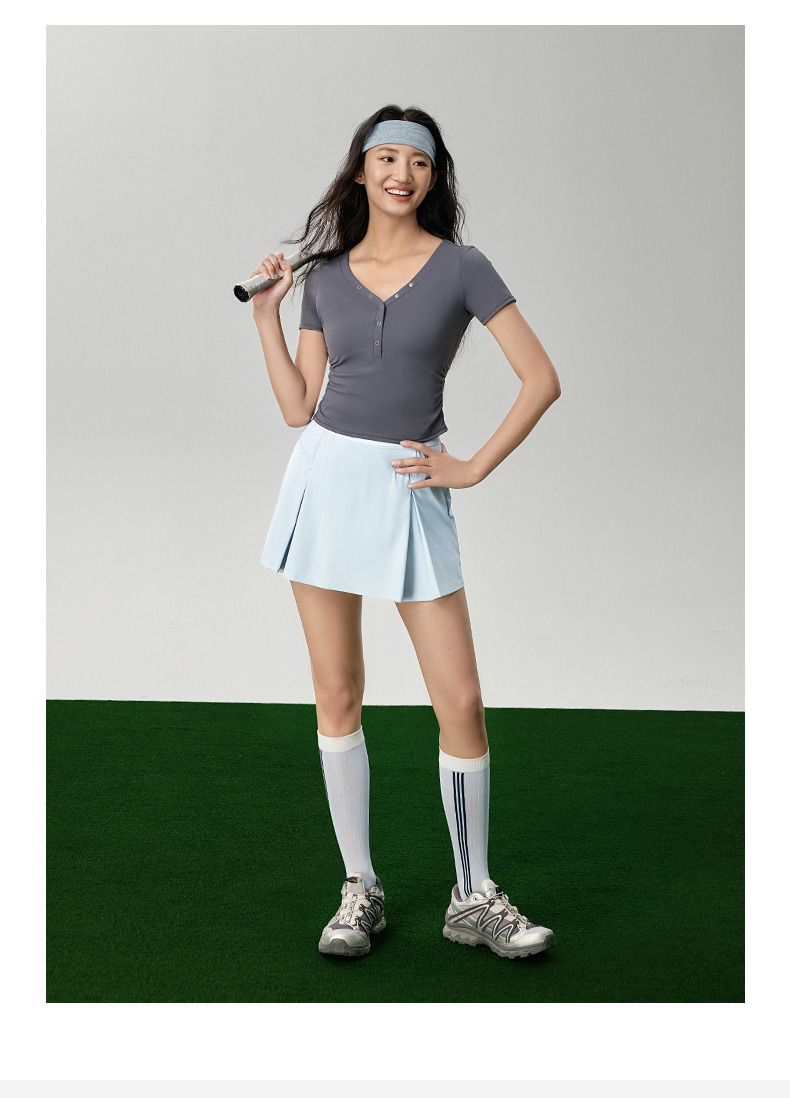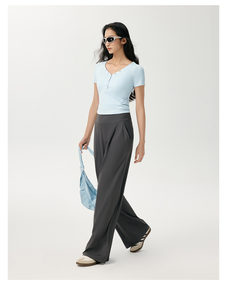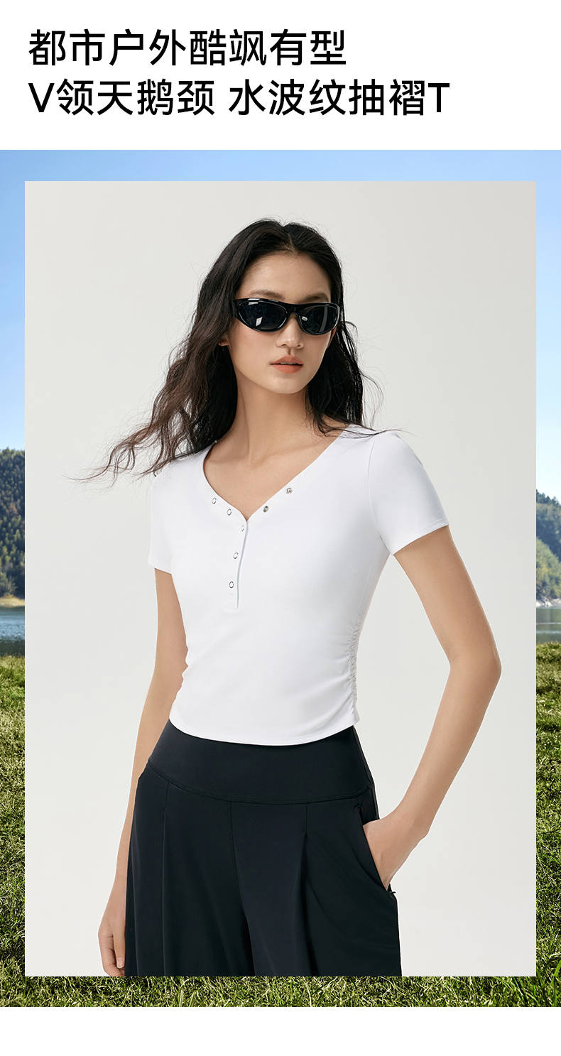 魔力薇薇V领水波纹抽褶T恤女短袖2026夏新款轻薄磨毛显瘦运动上衣