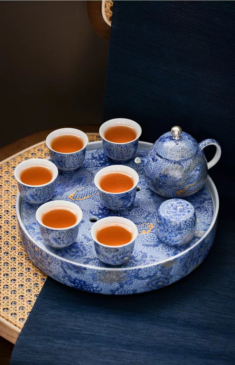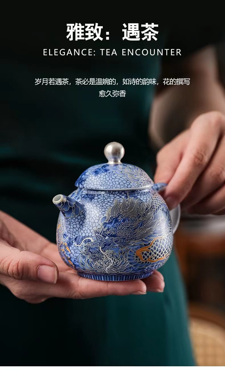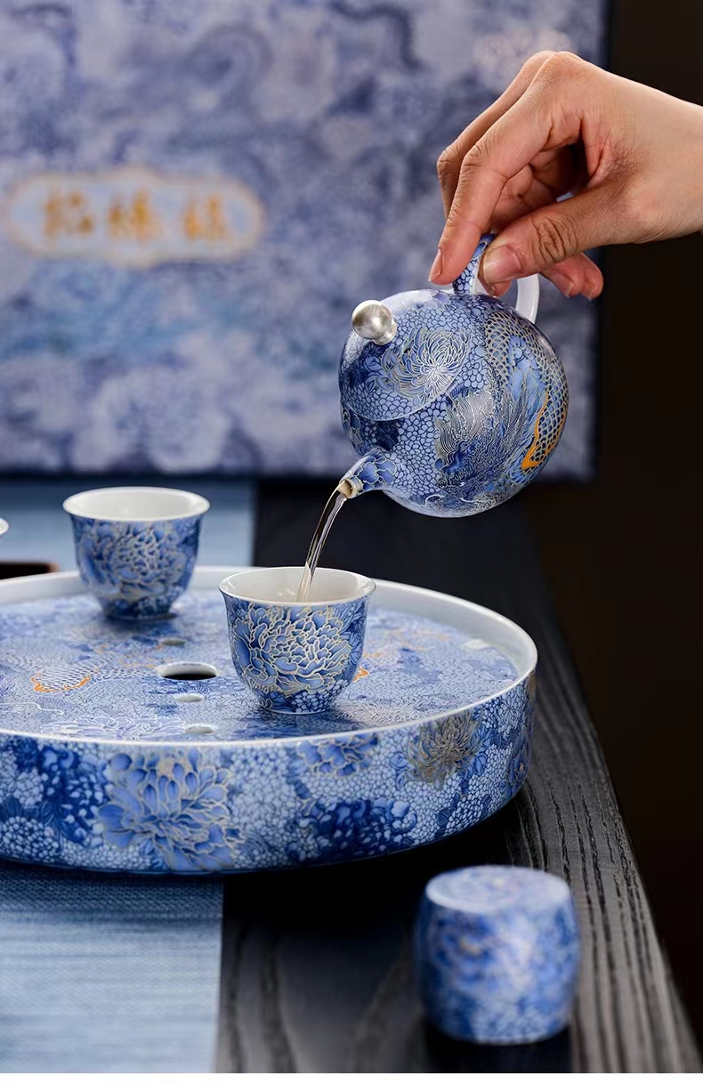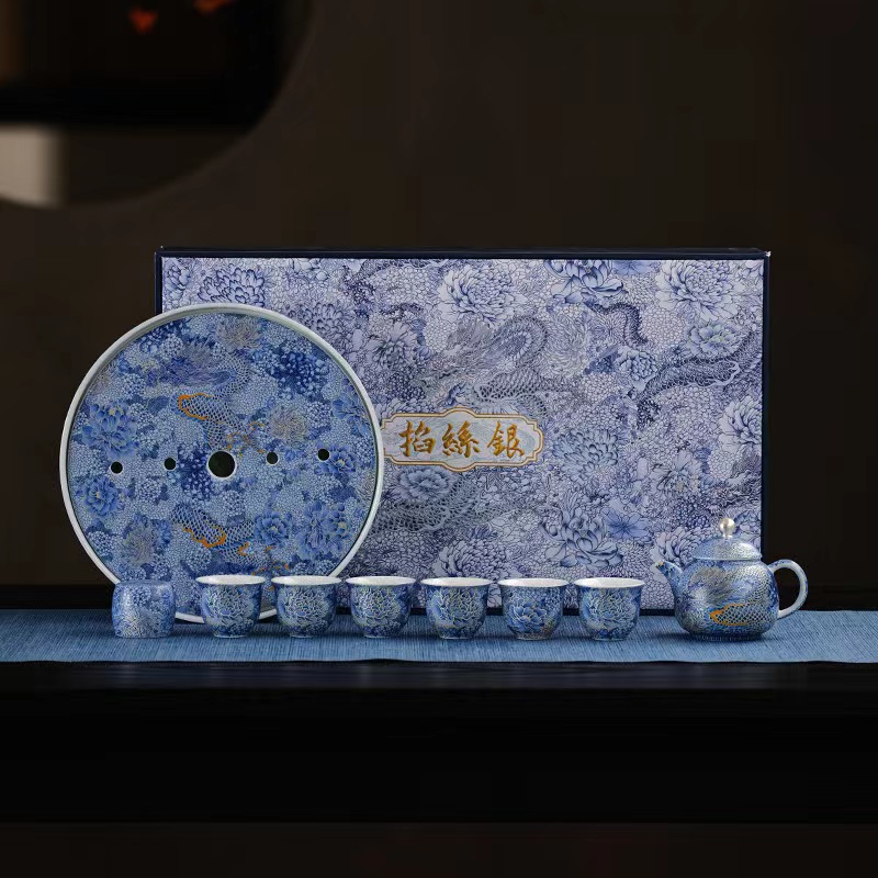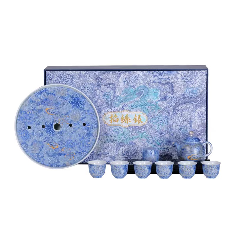 腾龙盛世999纯银掐丝珐琅青花12头茶器套装