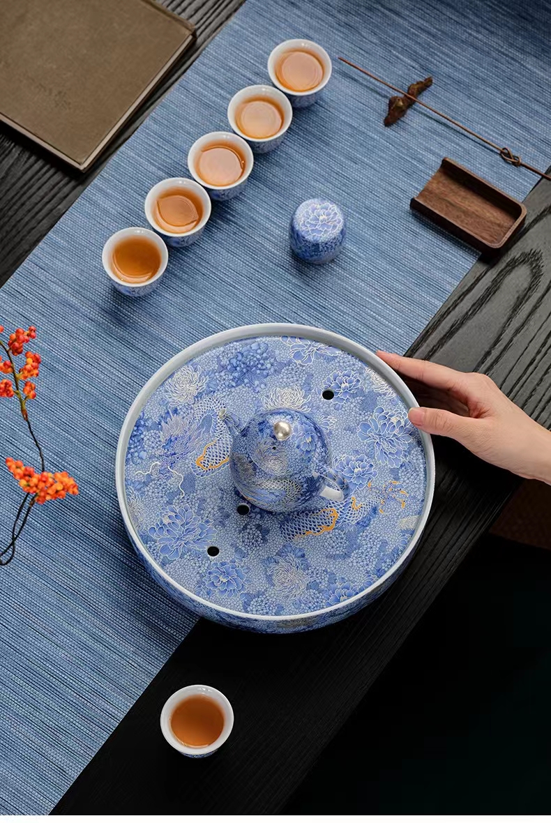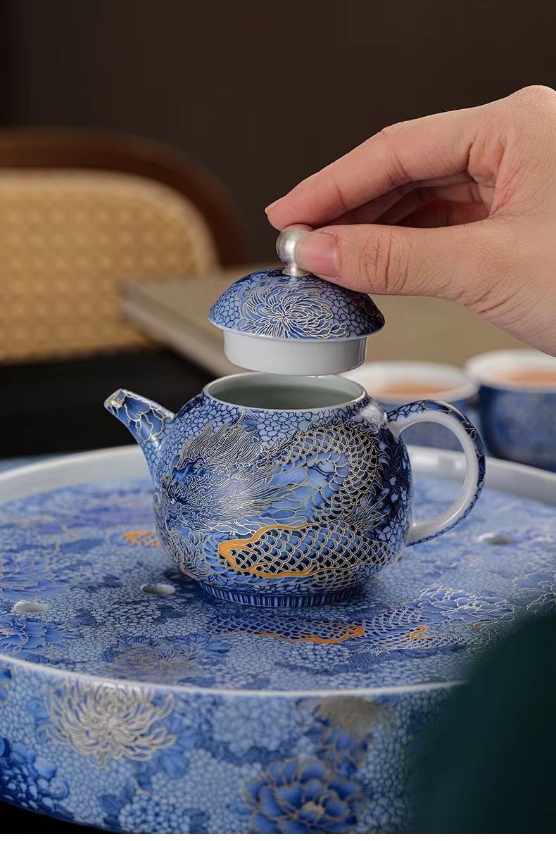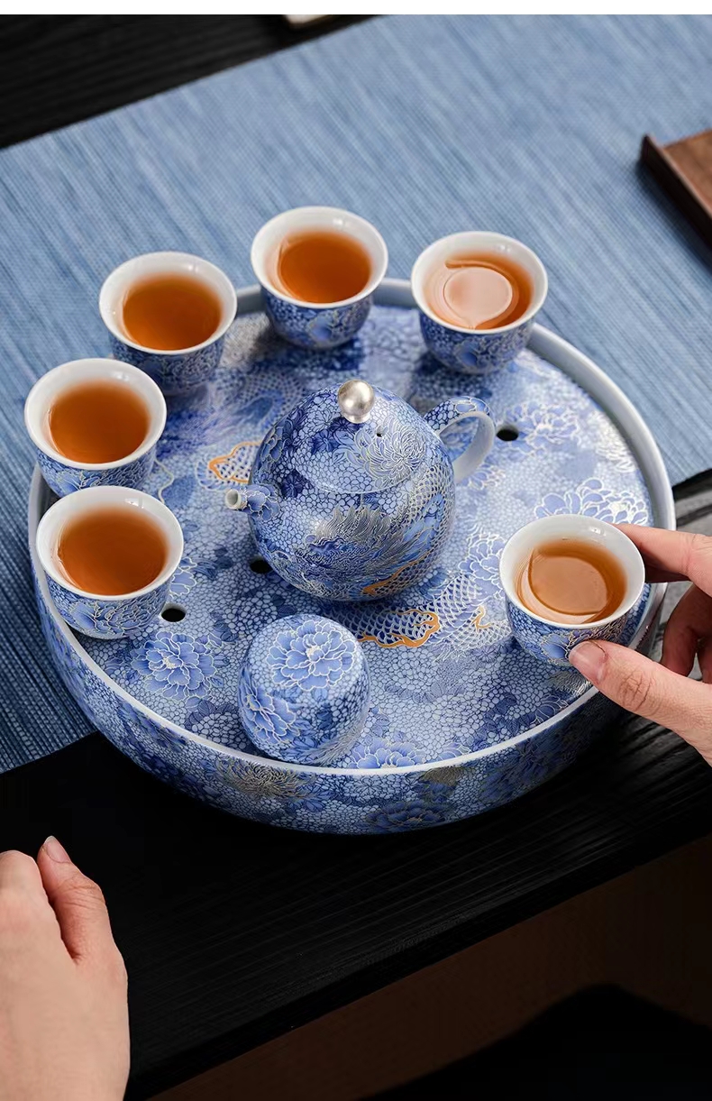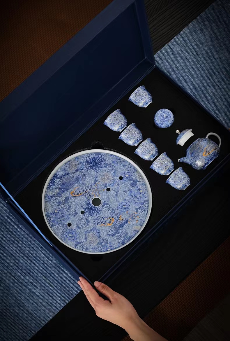 腾龙盛世999纯银掐丝珐琅青花12头茶器套装