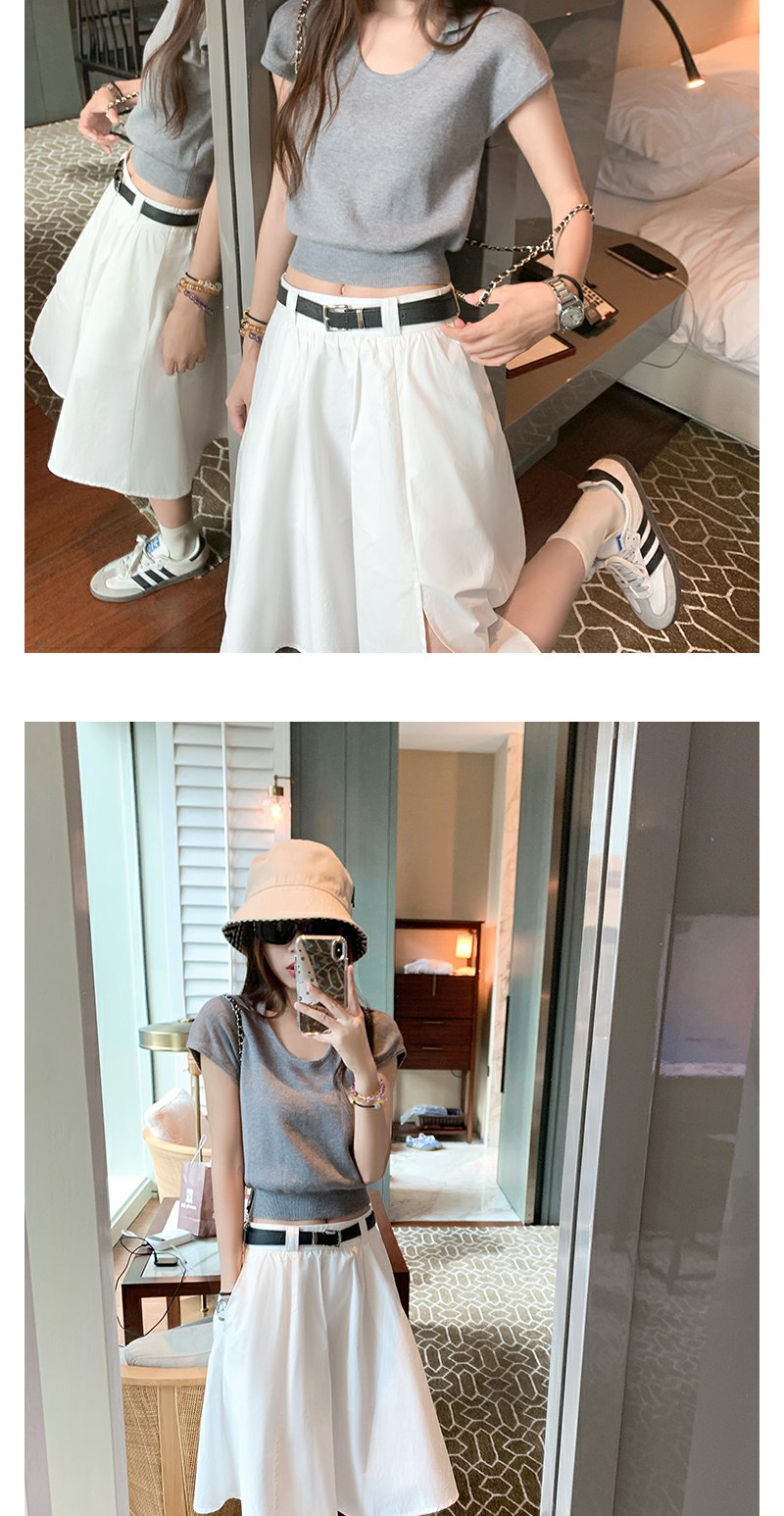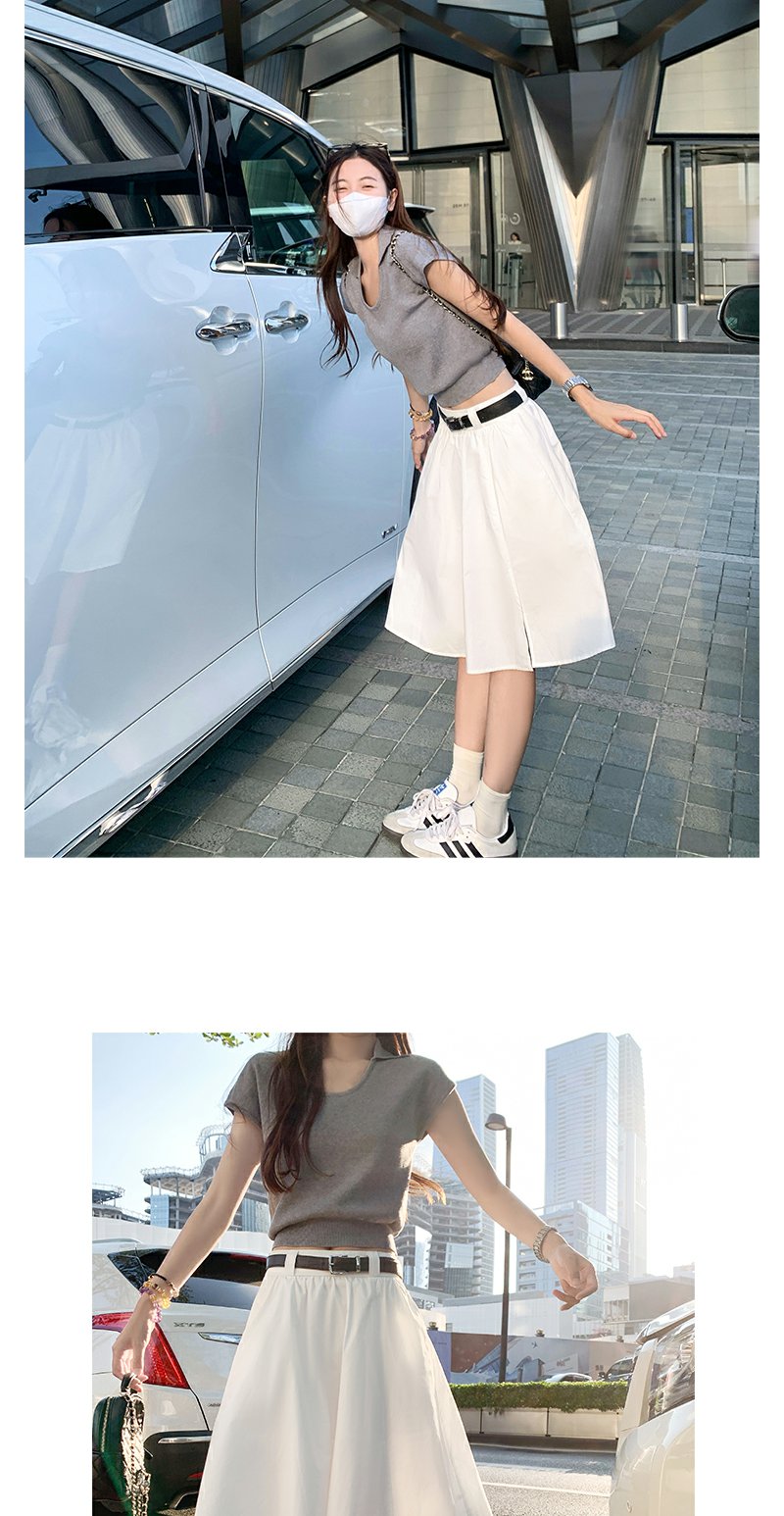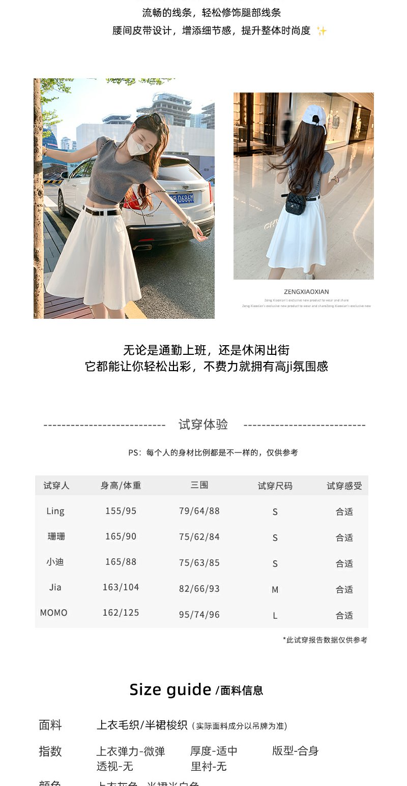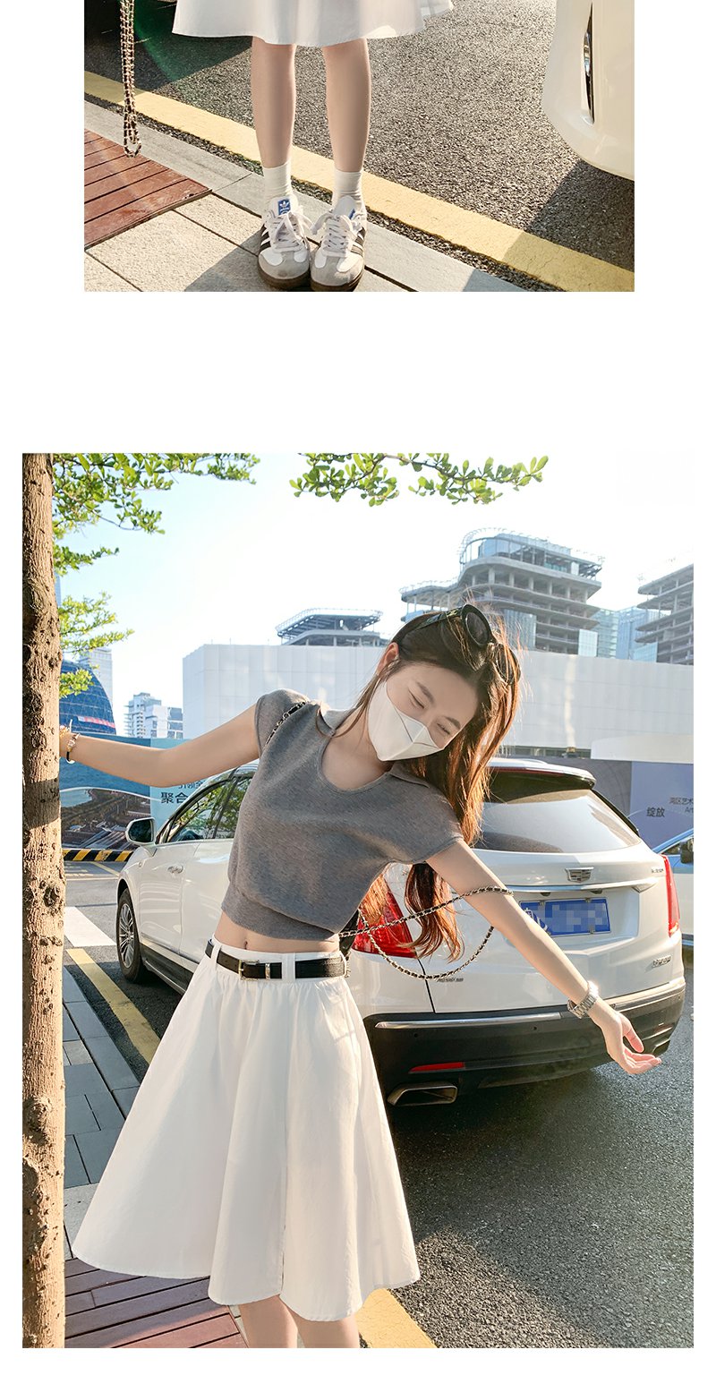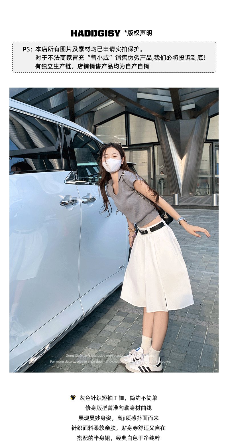 <曾小咸推荐>灰色u领针织正肩短袖t恤女+白色半裙