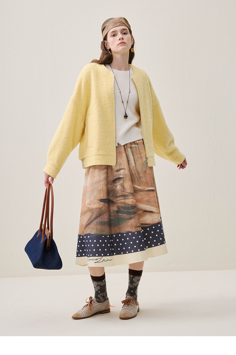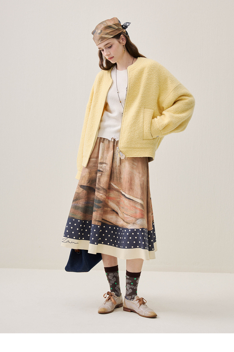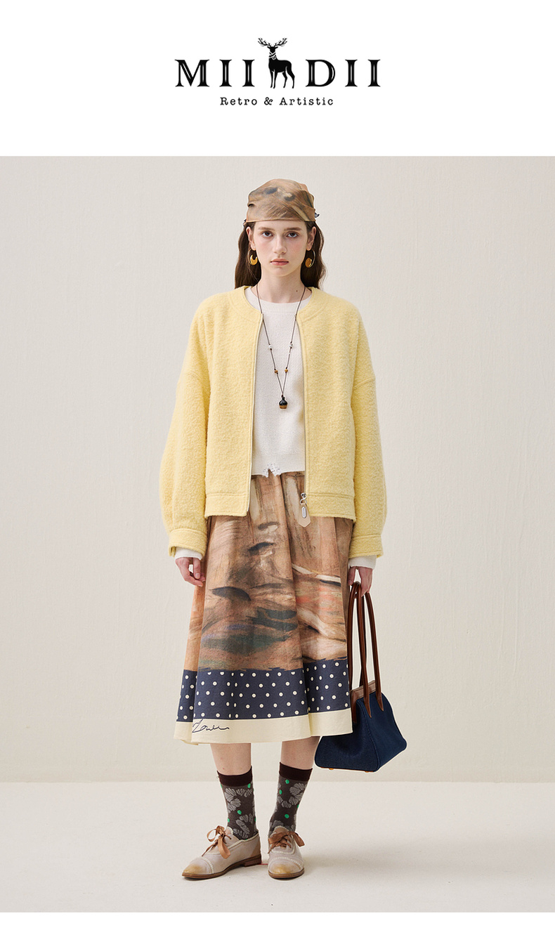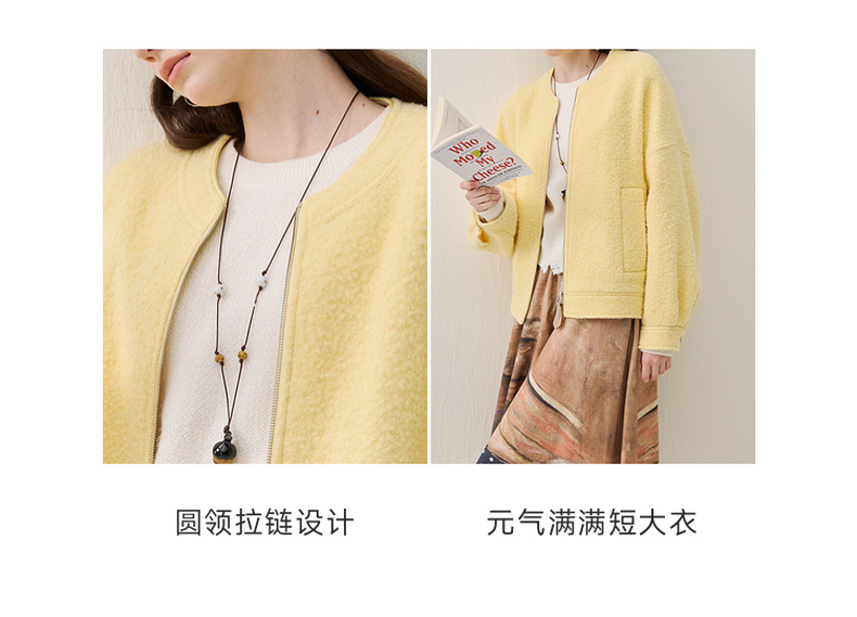 谜底短款大衣长袖2025冬季新品柔软舒适后幅拼接印花女254MD1651