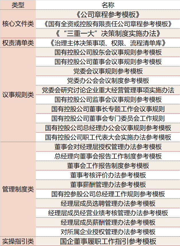 【正在研究中】《党委前置研究清单》《国有股东授权清单》《董事会决策事项清单》《经理层权责事项清单》《职工民主管理事项清单》《尽职容错免责事项清单》。