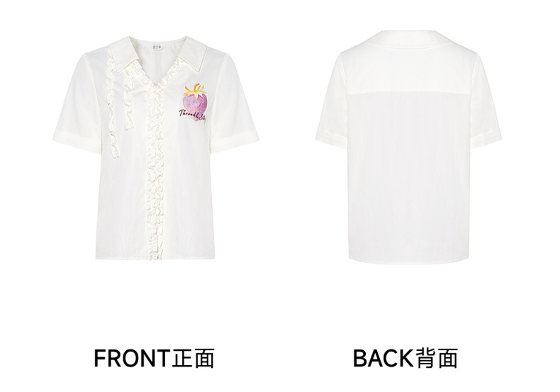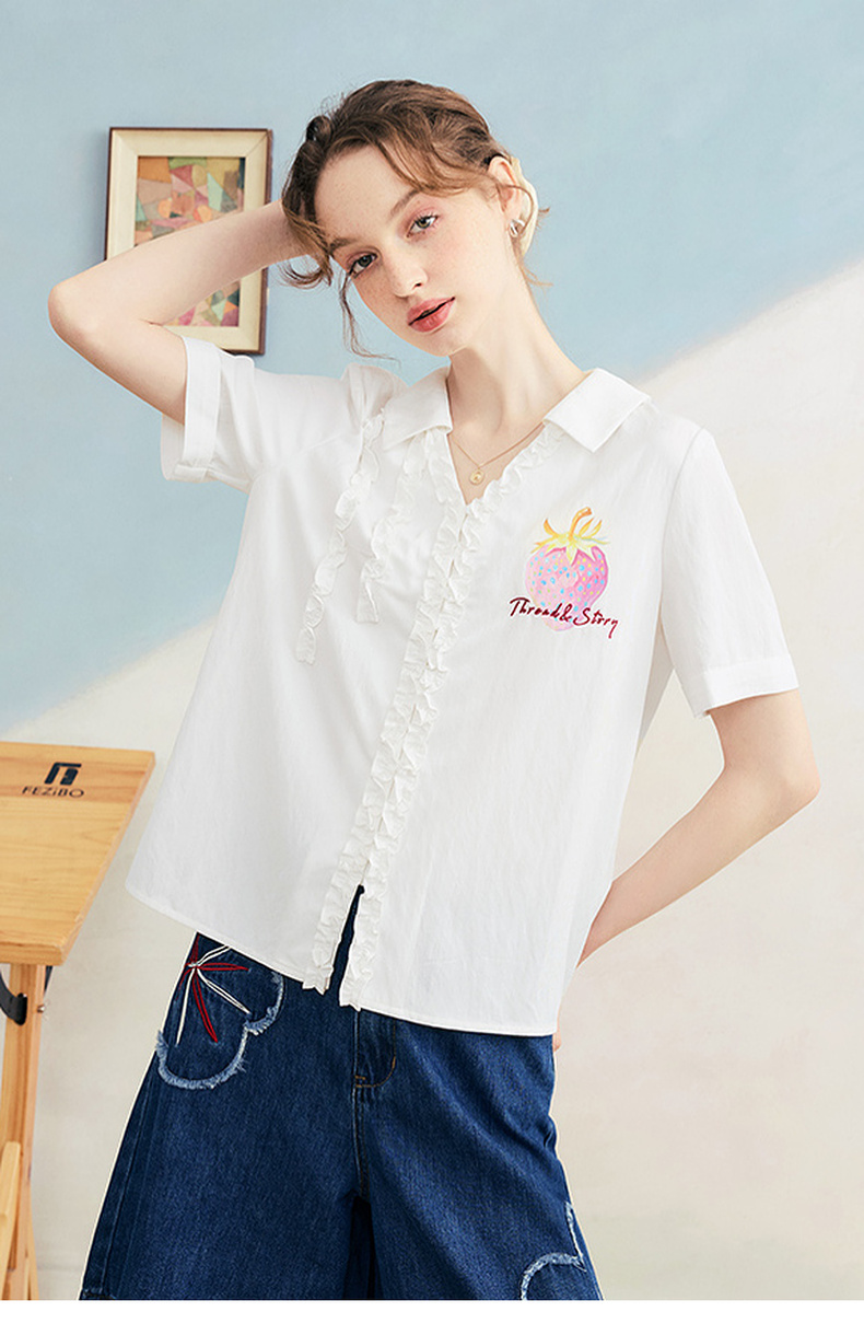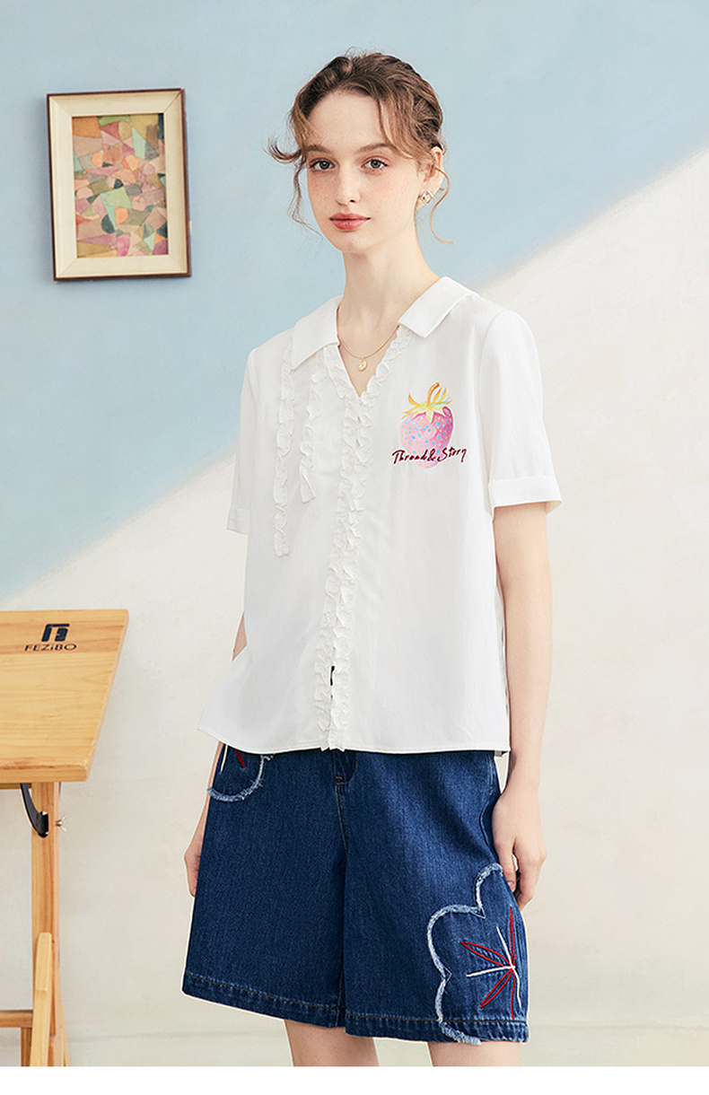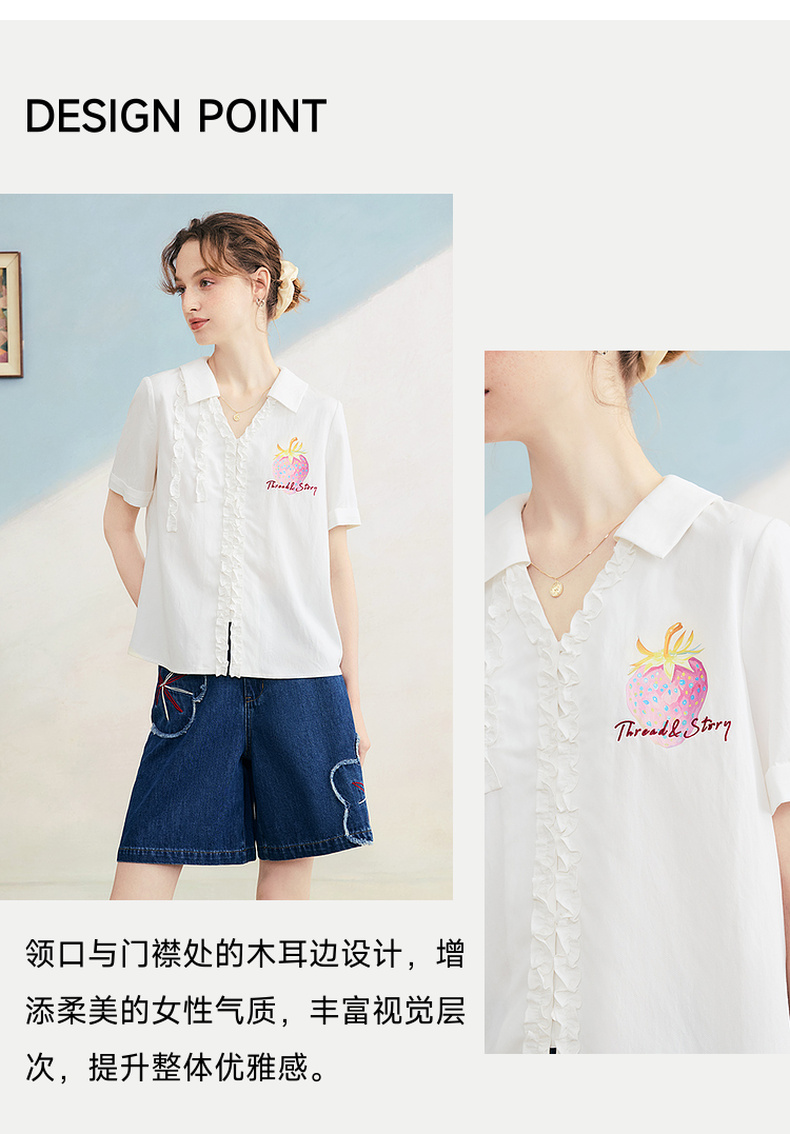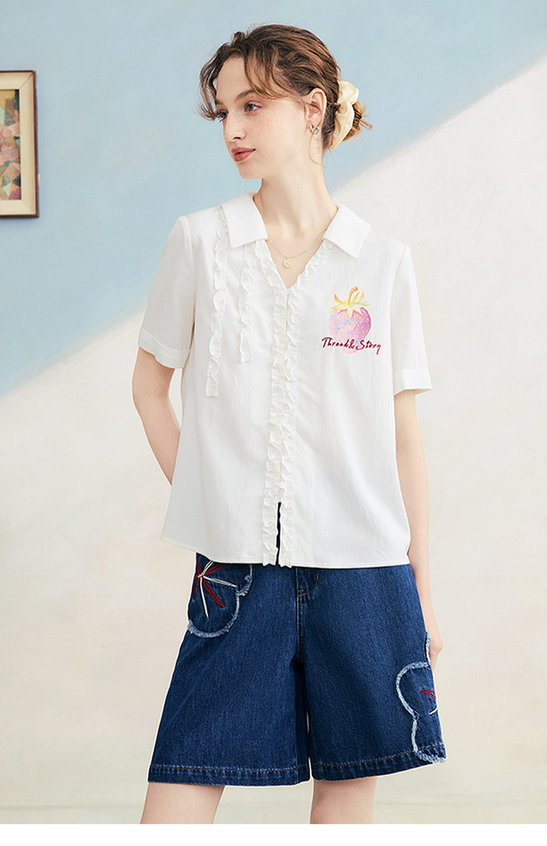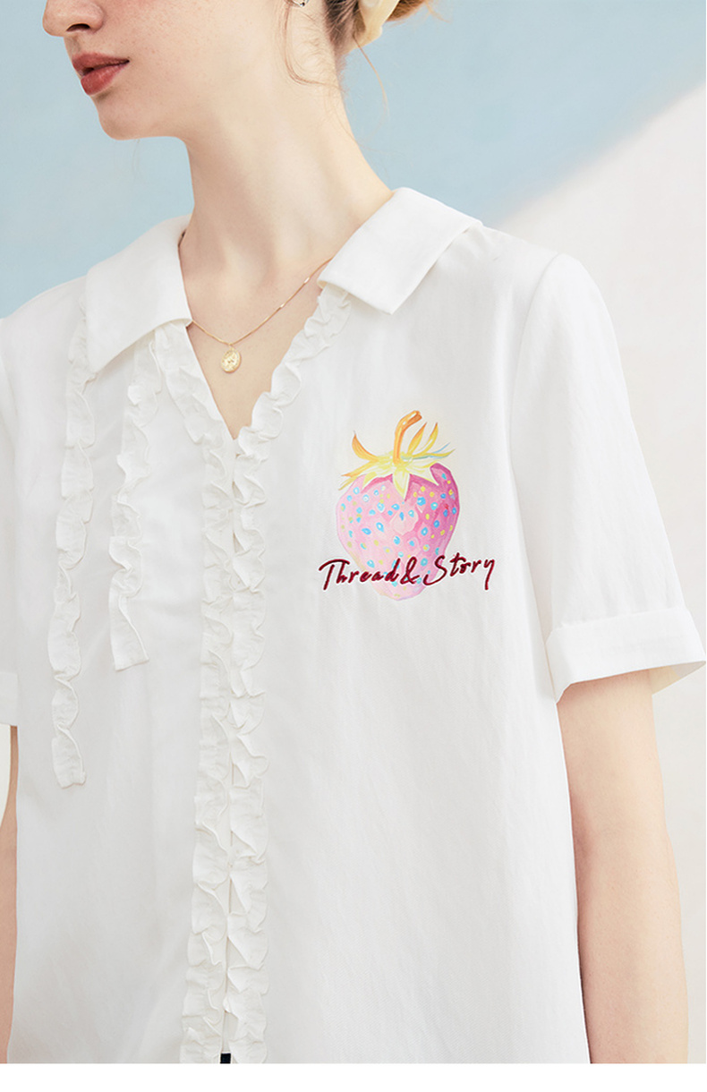 两三事 草莓软糖 2025夏季新款可爱草莓印花木耳边拼接短袖衬衫女