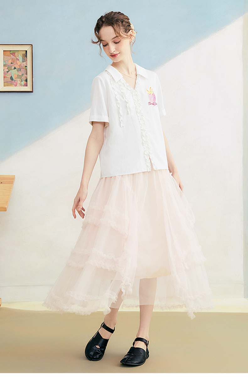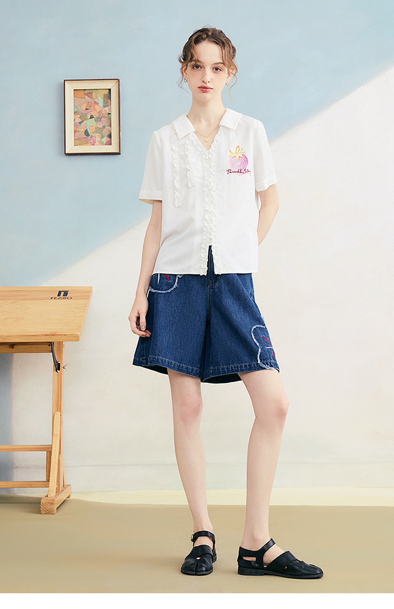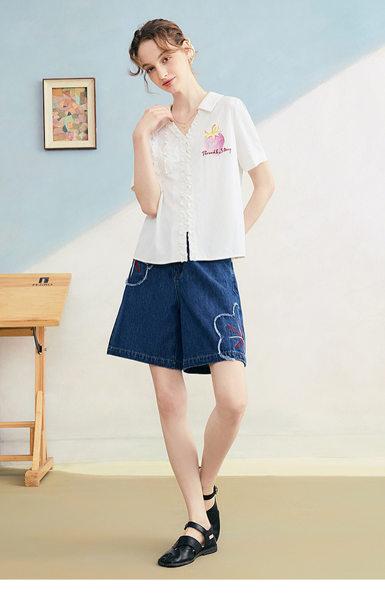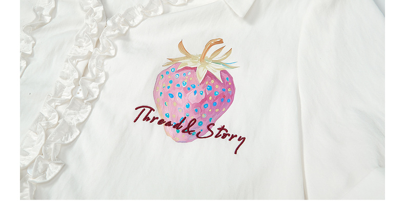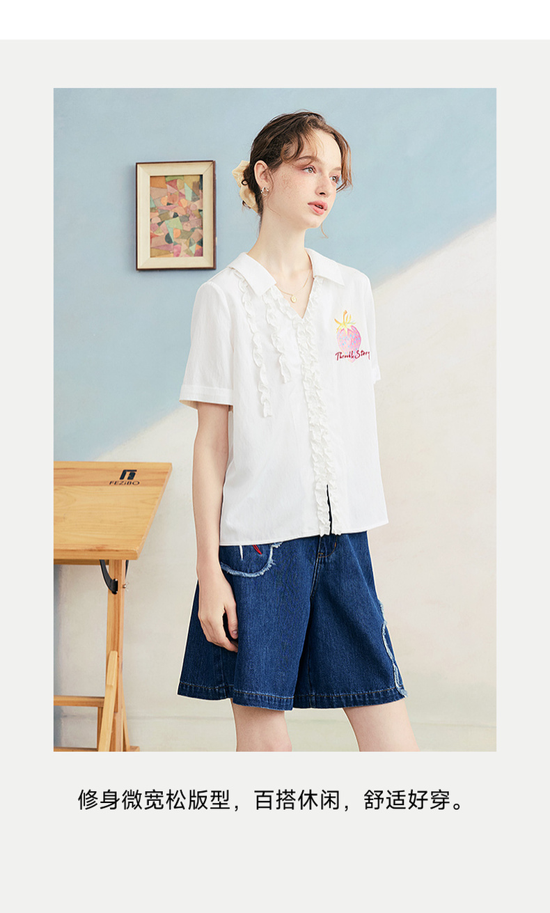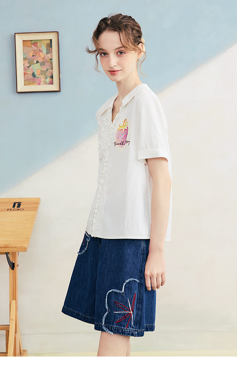 两三事 草莓软糖 2025夏季新款可爱草莓印花木耳边拼接短袖衬衫女