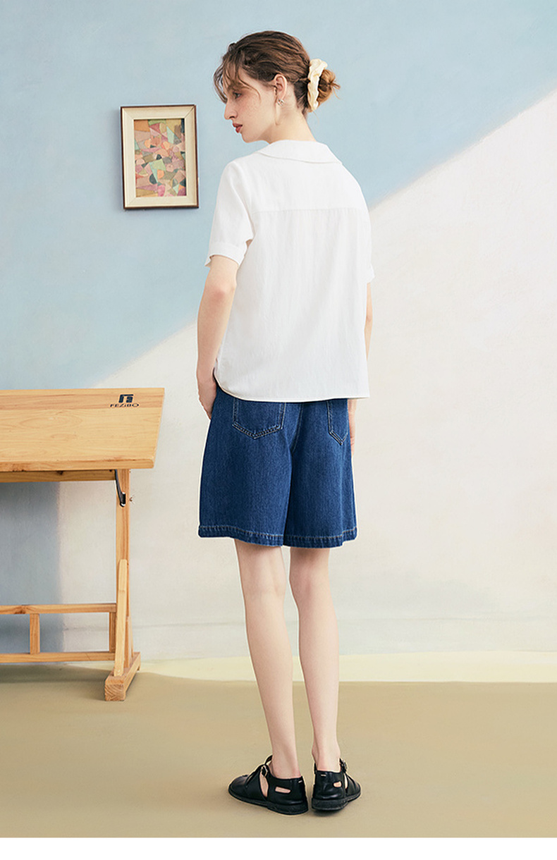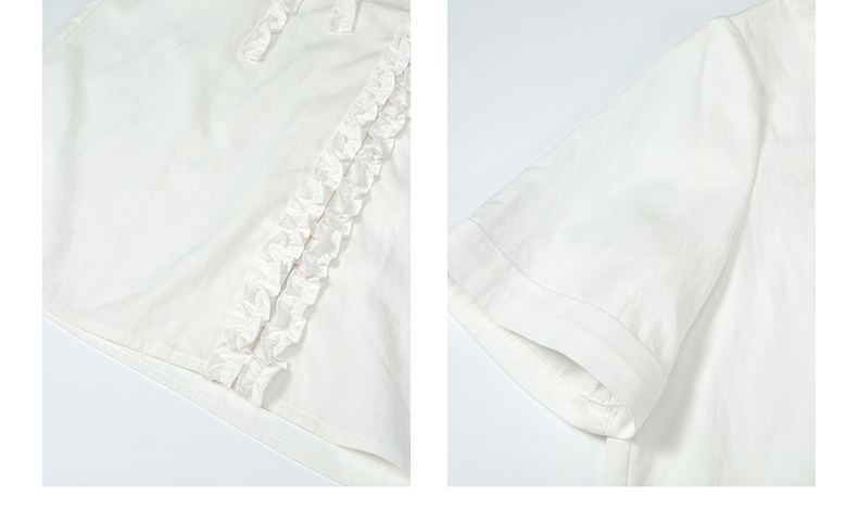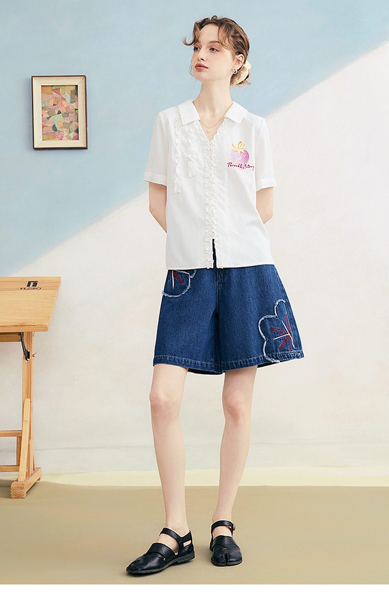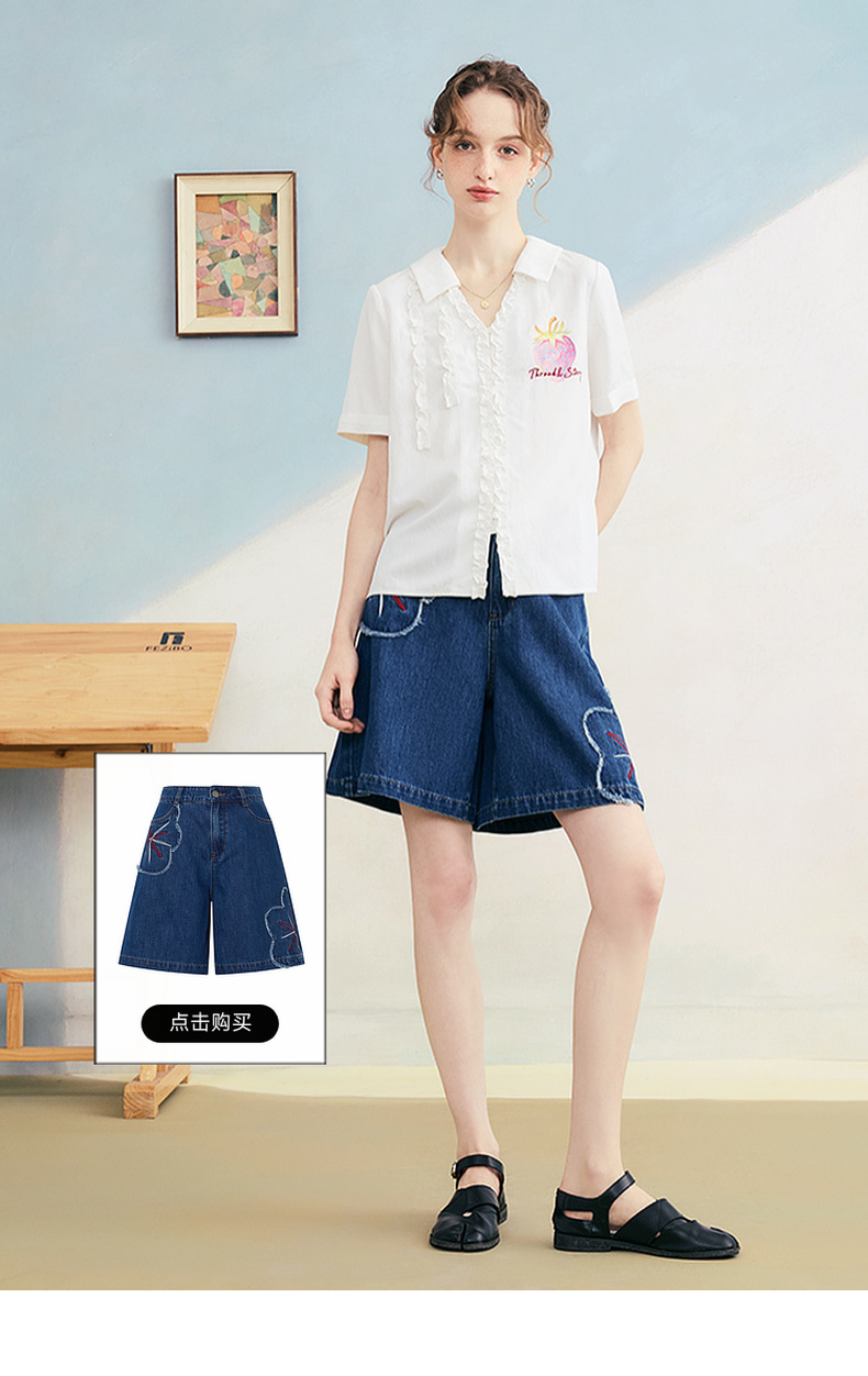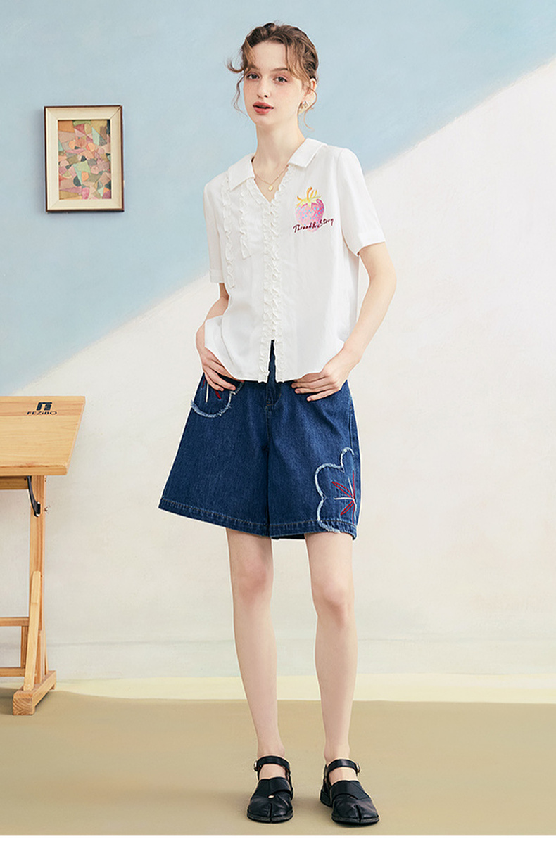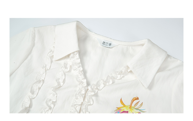 两三事 草莓软糖 2025夏季新款可爱草莓印花木耳边拼接短袖衬衫女