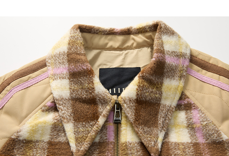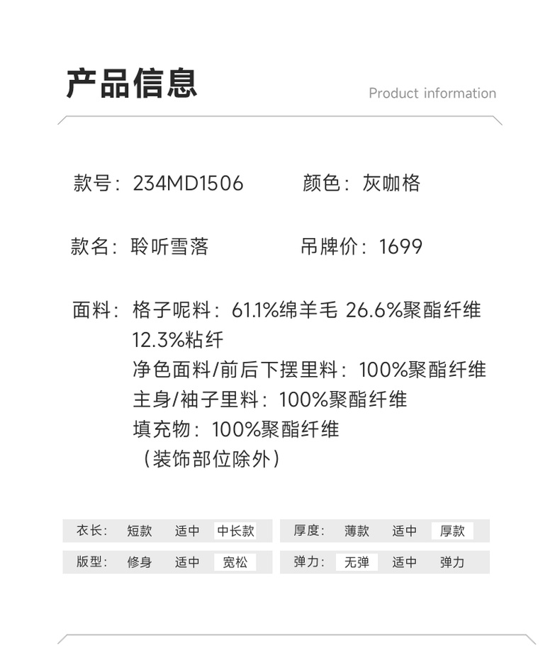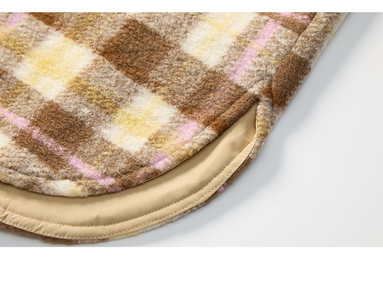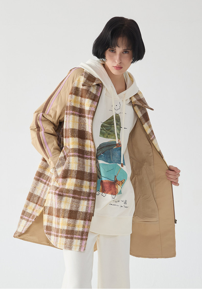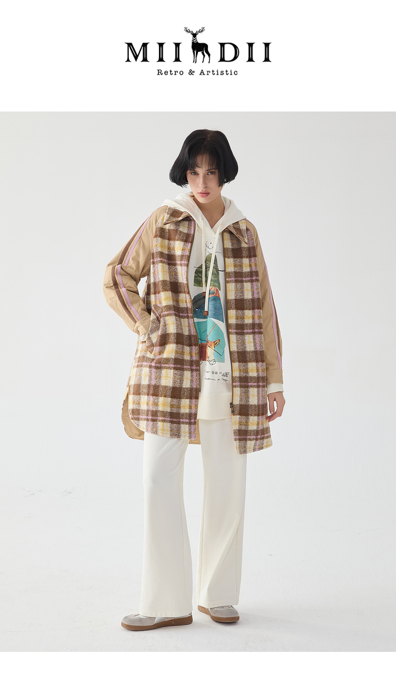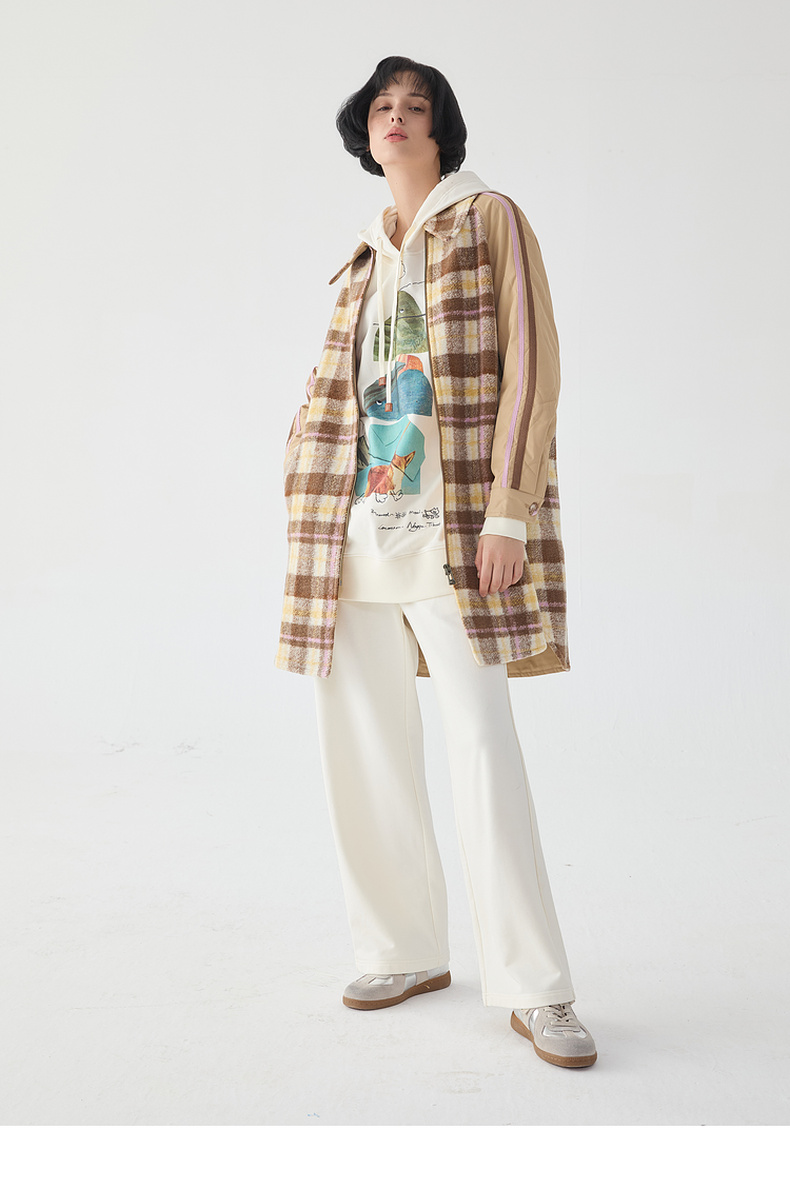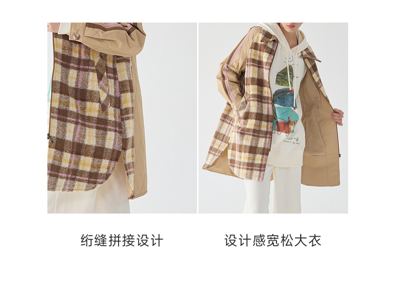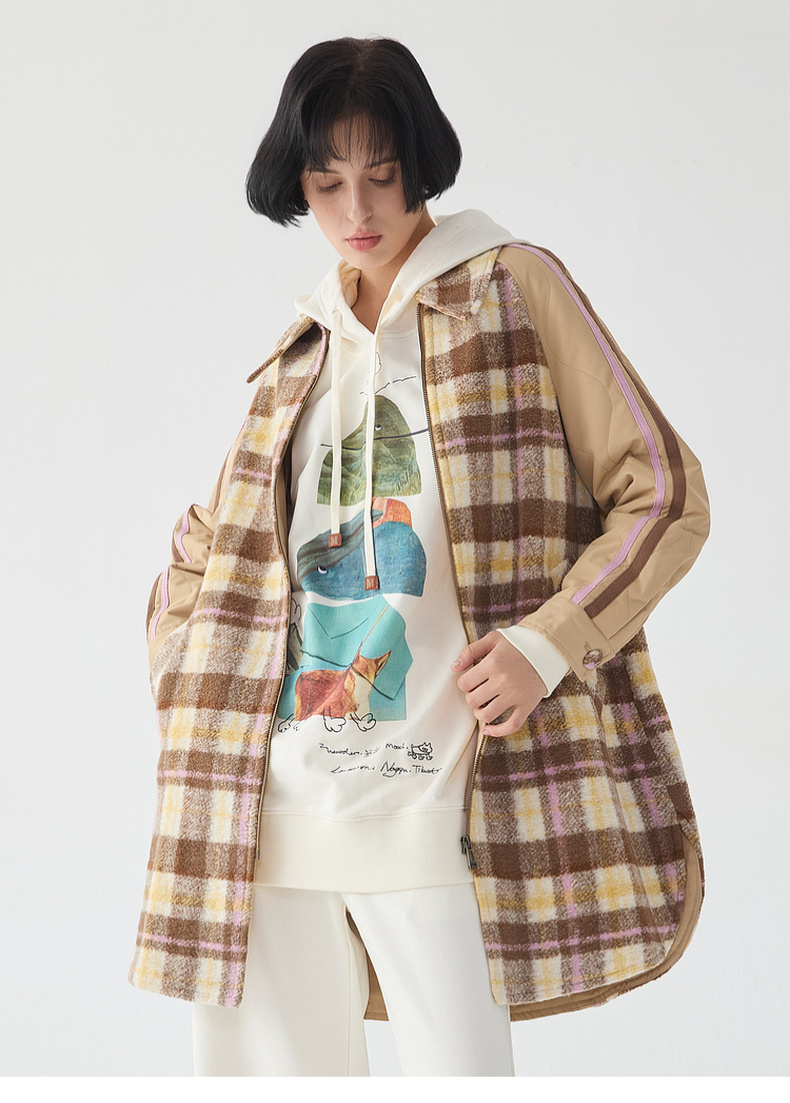 谜底宽松中长款大衣女2023冬新品复古格纹拼接毛呢外套234MD1506