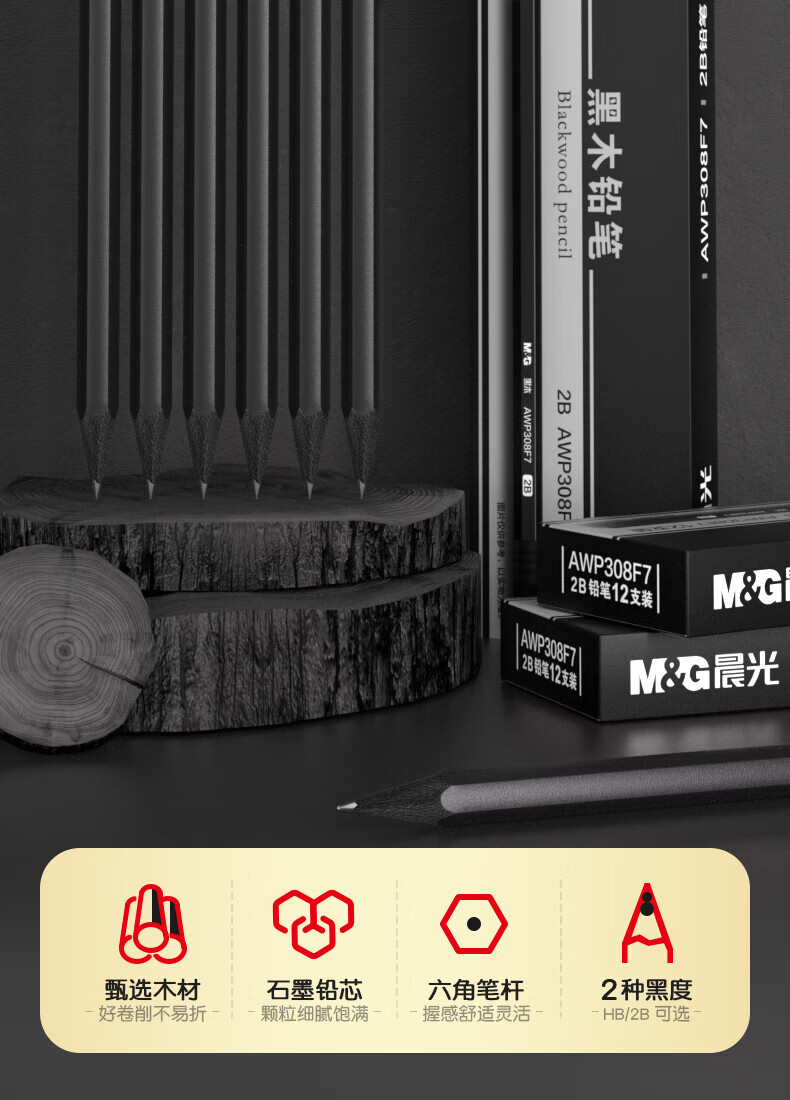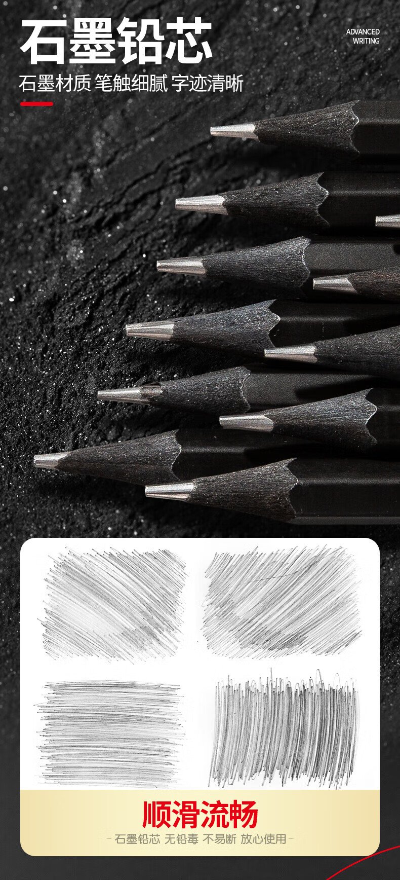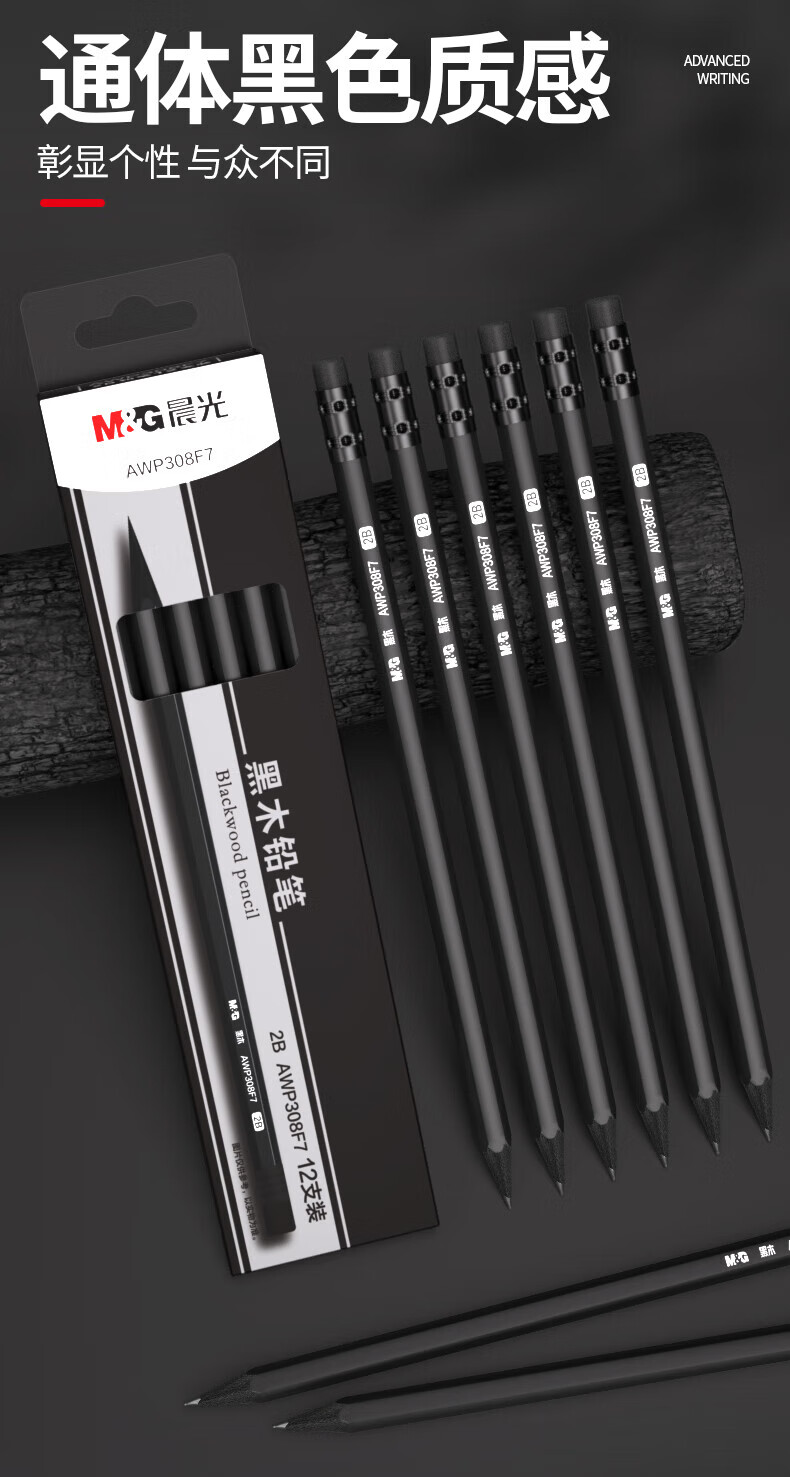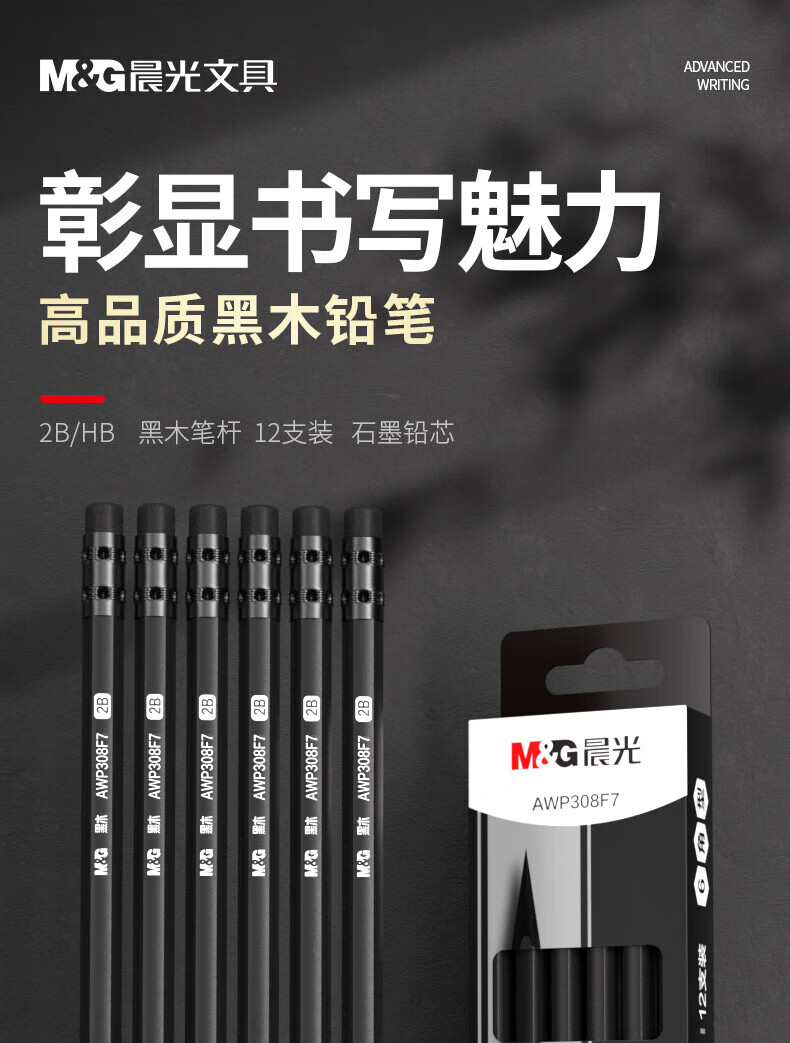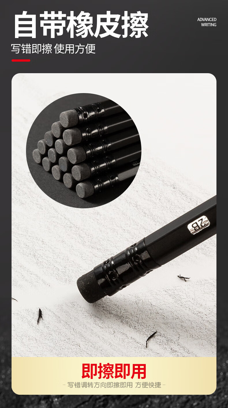 晨光2BHB铅笔黑木抽条六角木杆铅笔带橡皮头学生书写美术素描绘图12支(规格自选)