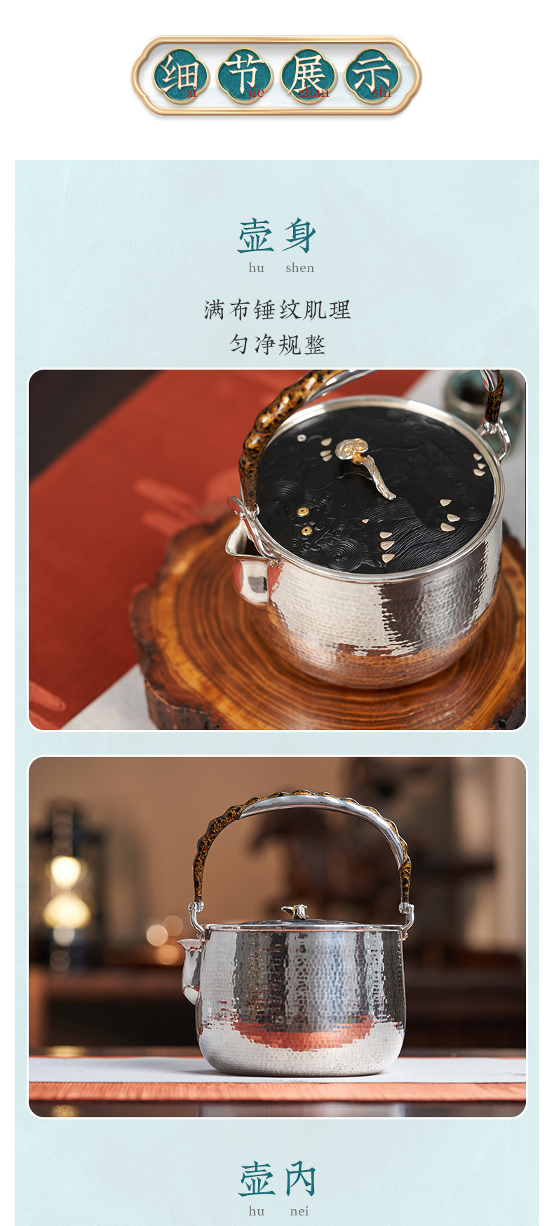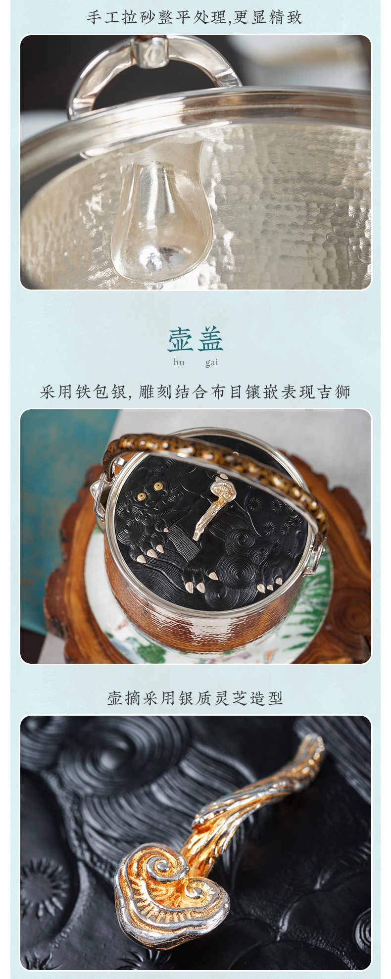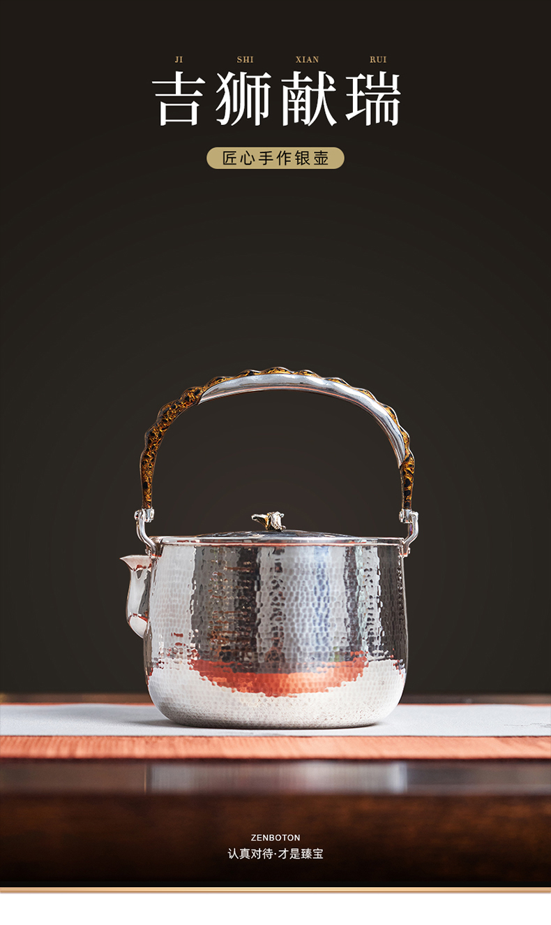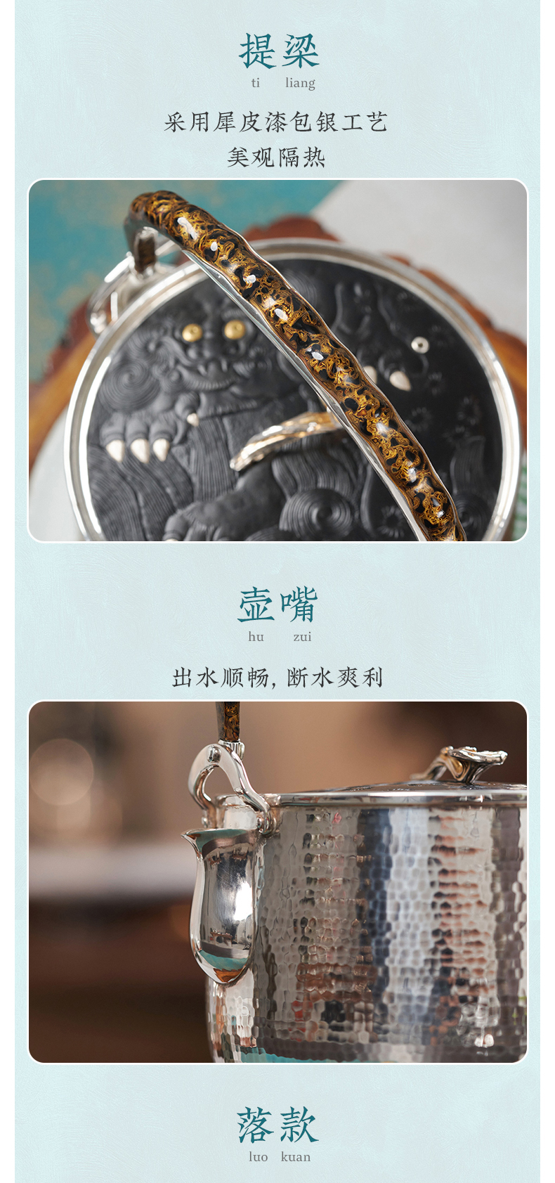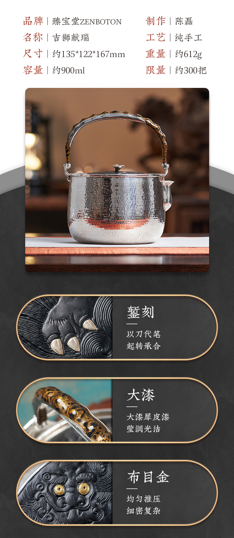 臻宝堂银壶 纯银烧水壶纯手工浮雕布目金大漆提梁茶壶 吉狮献瑞 900ml