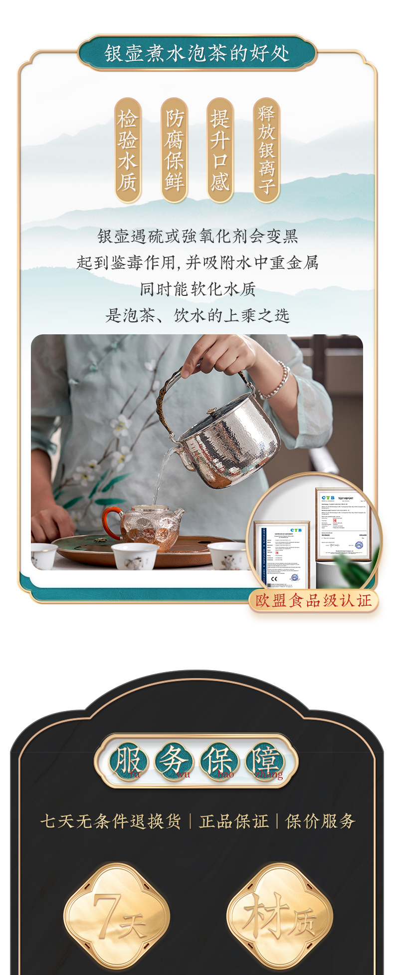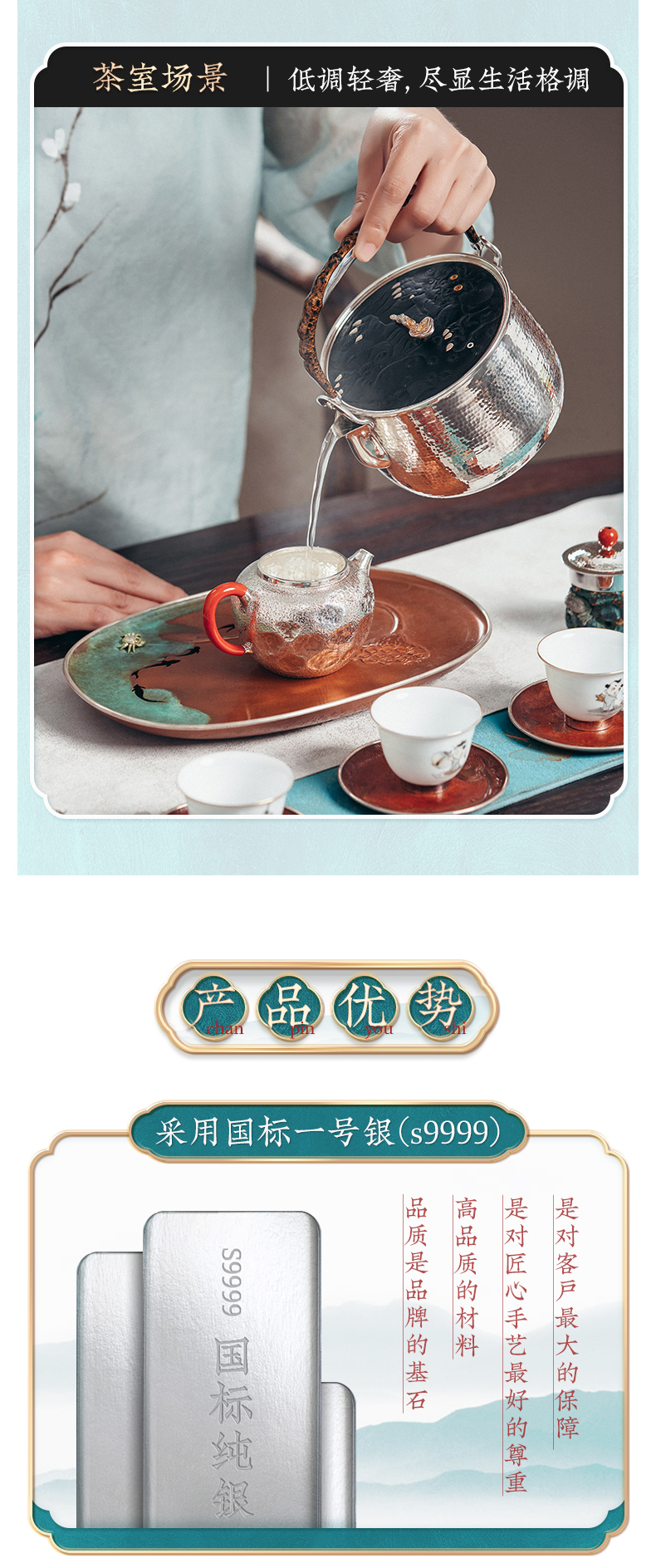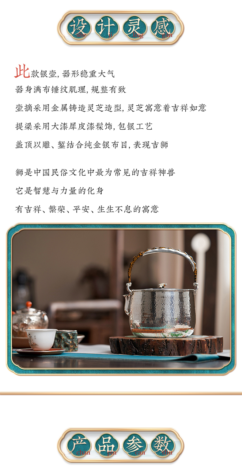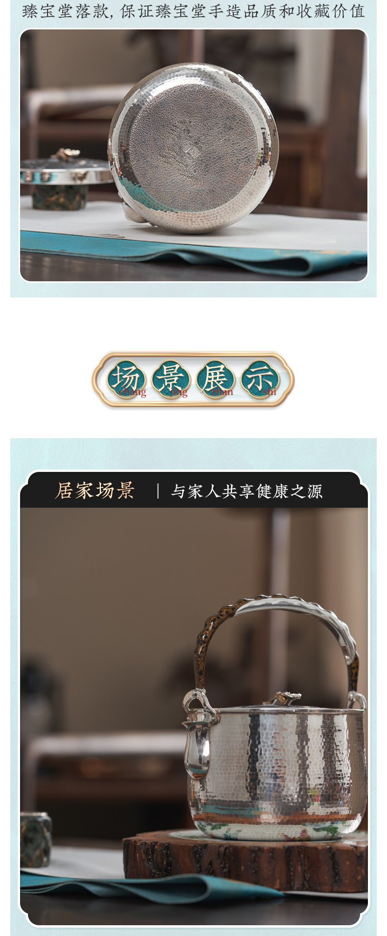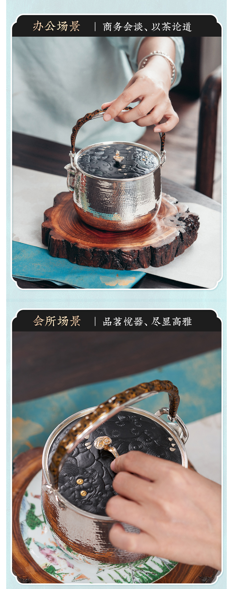 臻宝堂银壶 纯银烧水壶纯手工浮雕布目金大漆提梁茶壶 吉狮献瑞 900ml