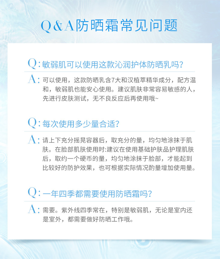 柔润护体防晒液~这款真的太适合敏感肌了!首先它其中含有7种和汉纯植物精粹!成分非常非常安心!其次它不是强效的化学防晒,而是物理防晒!更加的温和亲肤!并且一年四季、全身都适用!