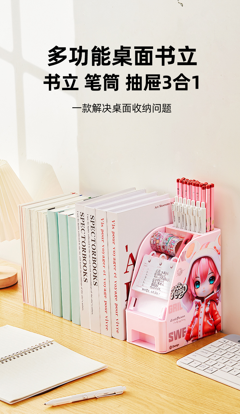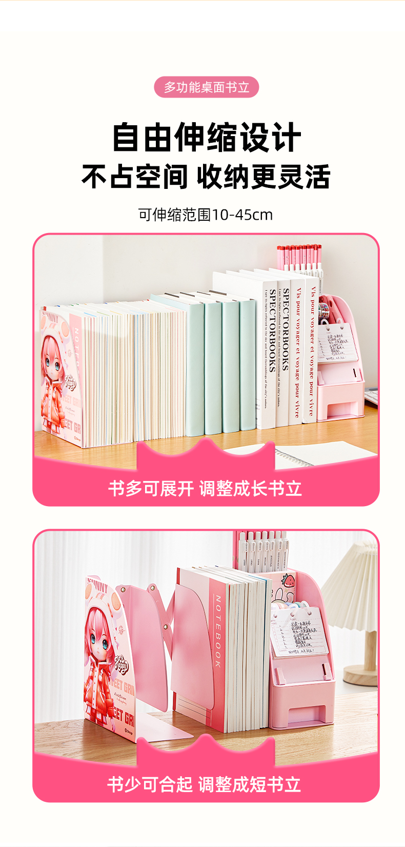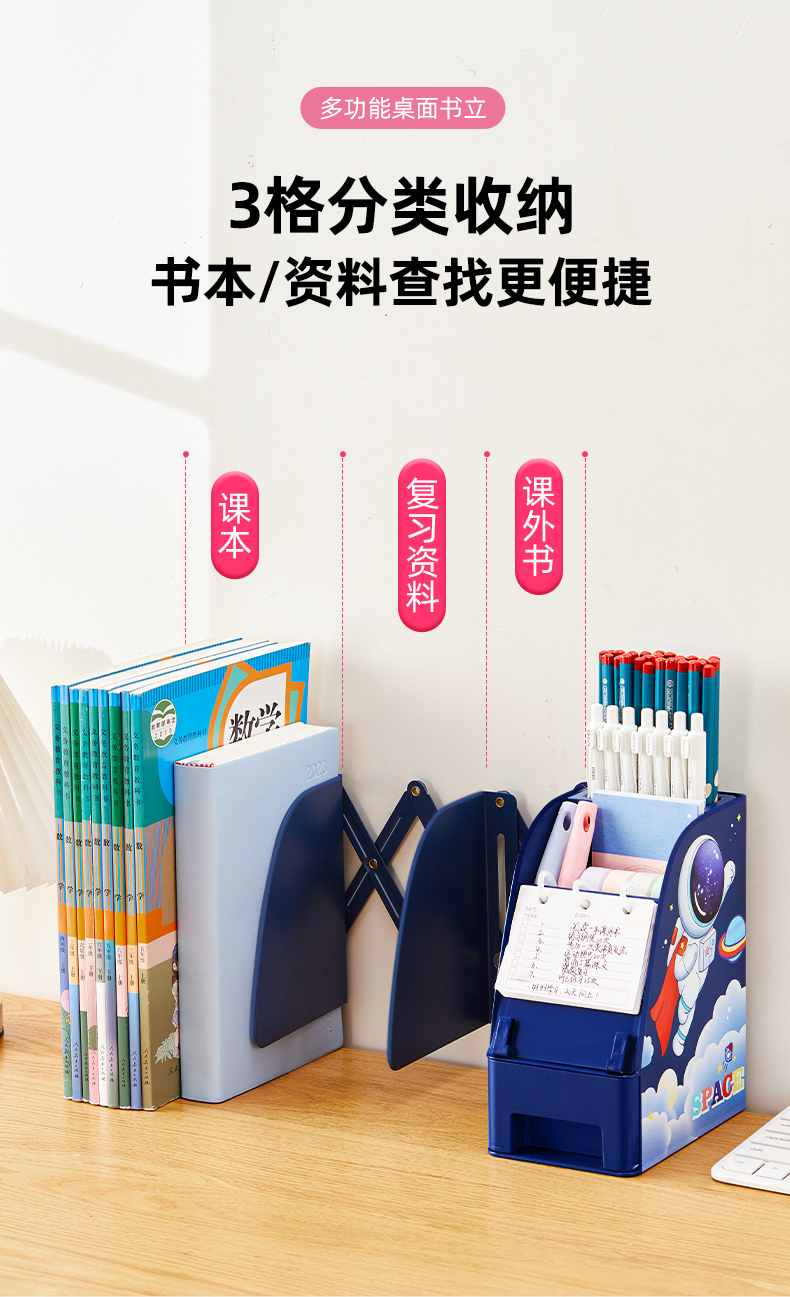 猫太子书立架桌面可伸缩书立多功能书本收纳置物架带笔筒抽屉一体高中生书夹折叠固定书本立架小学生放书神器
