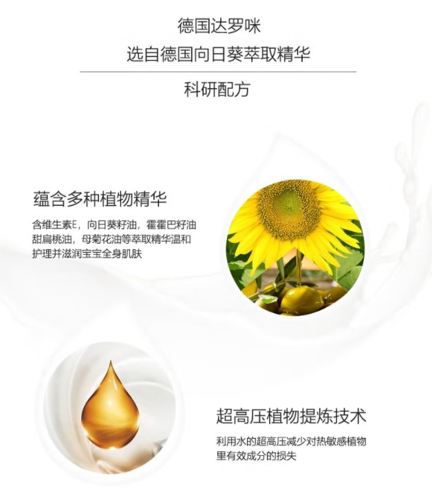 温和滋养护理宝宝肌肤。天然保湿因子,亲肤易吸收,给肌肤持久柔润感,有效舒缓肌肤发红发痒等不适症状,形成保护膜,增强肌肤防御力,减少肌肤问题发生。