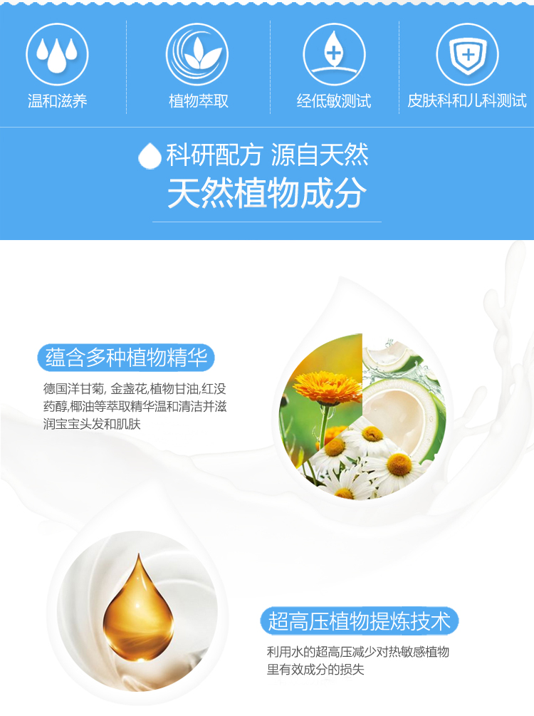 PH5.5亲肤弱酸性配方,温和呵护宝宝娇嫩肌肤,不含MIT/CIT防腐剂、矿物油、色素等易致敏成分,使用舒适更放心!