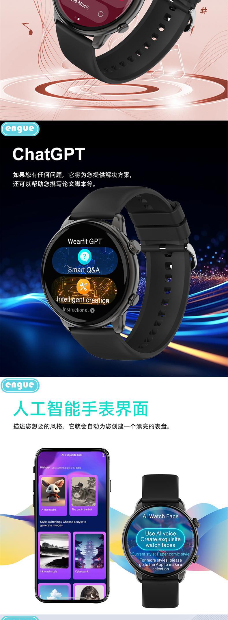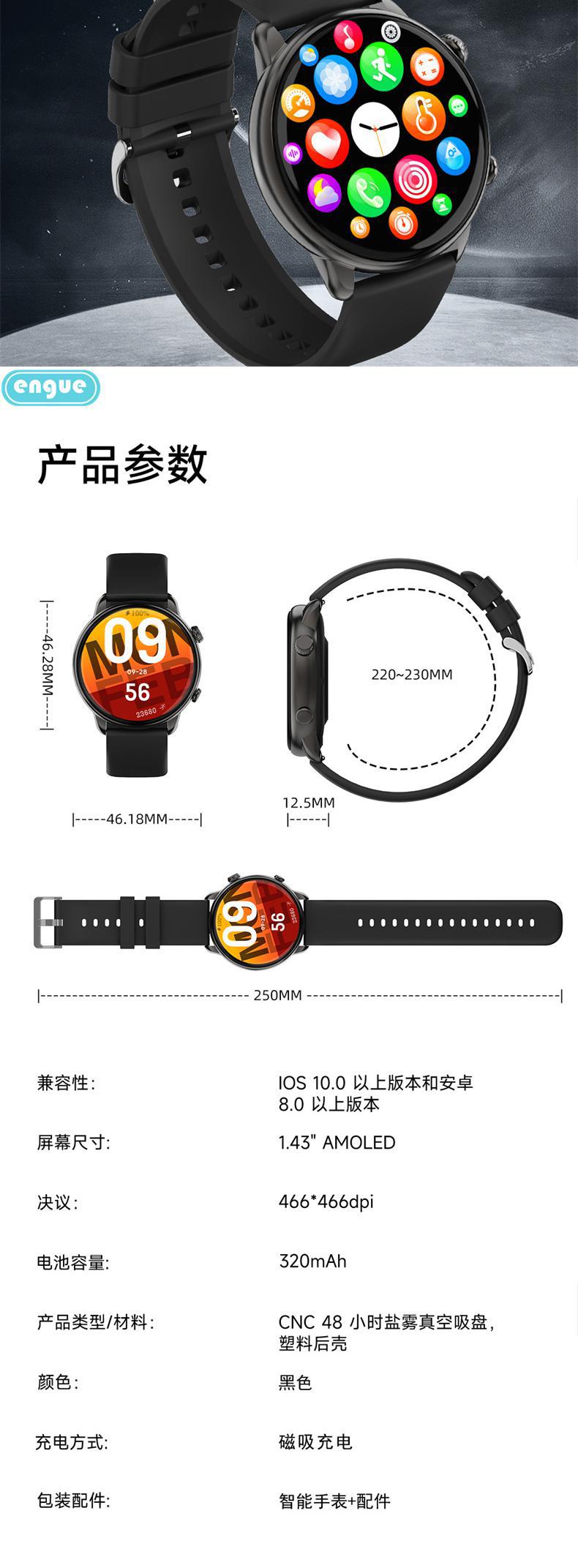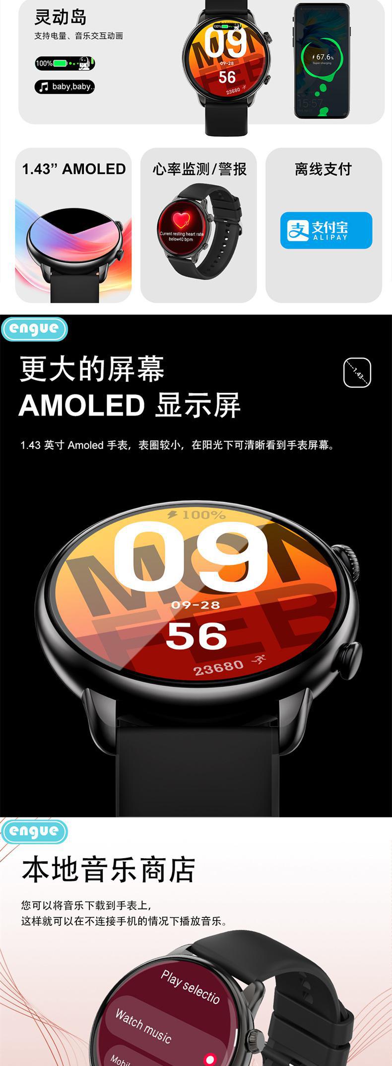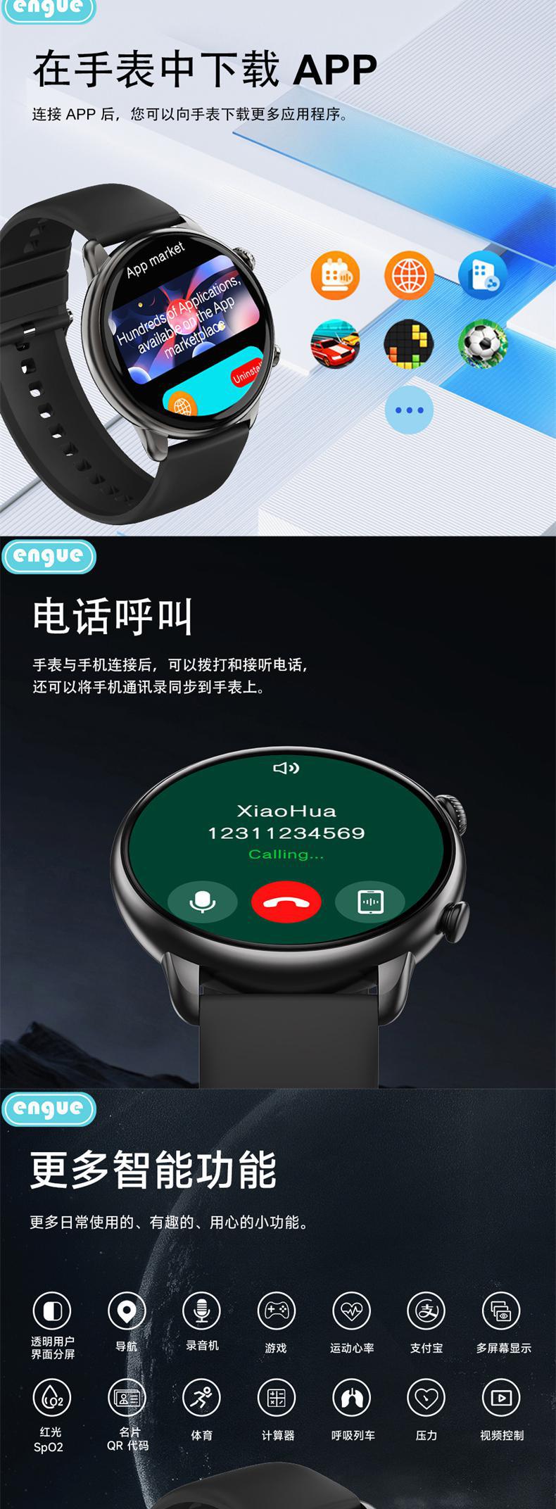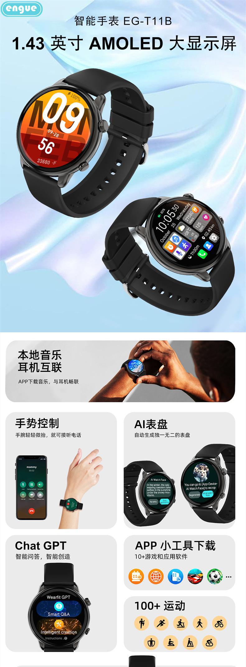 engue恩谷全触屏心率智能手表EG-T11B全触屏操作运动监测手机通知