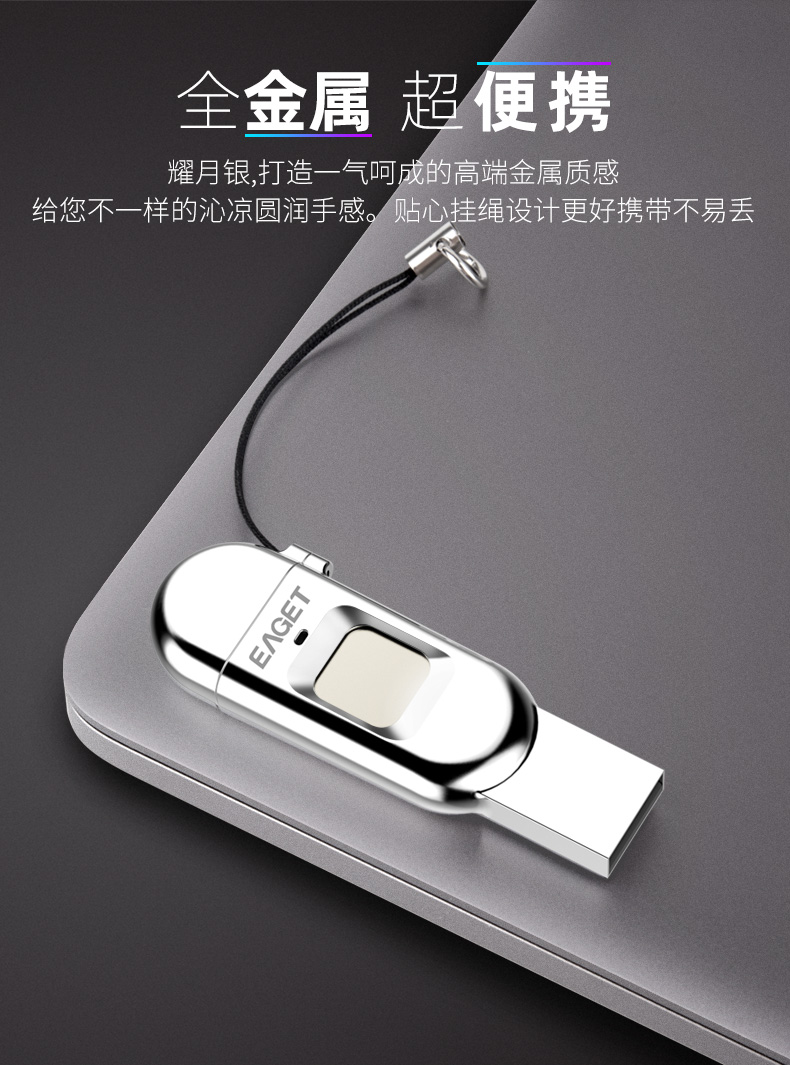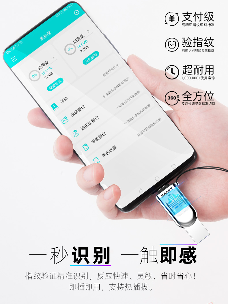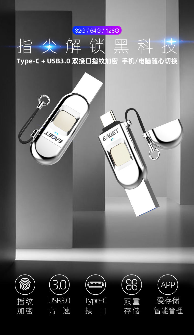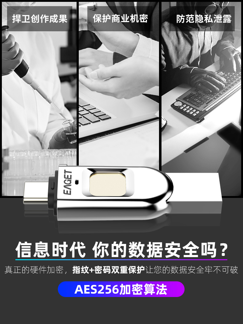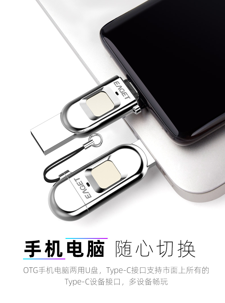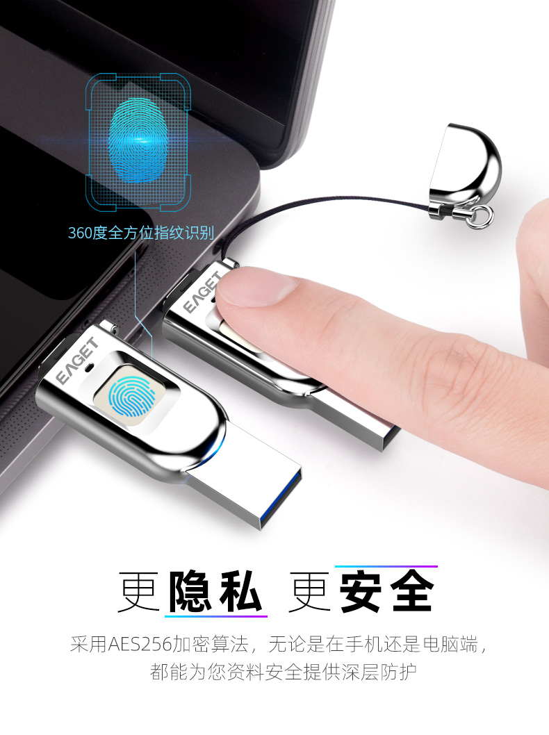 忆捷32GB Type-C USB3.1 HF-C01指纹加密手机U盘 双接口手机电脑多用 隐私安全保护 商务娱乐优盘