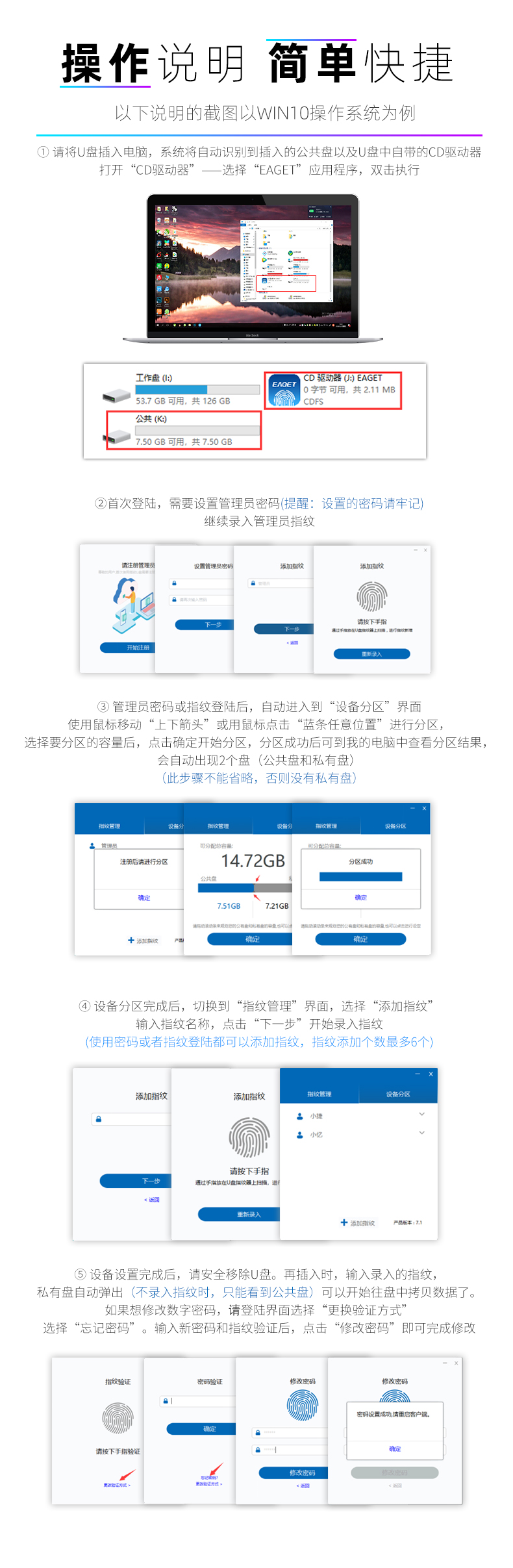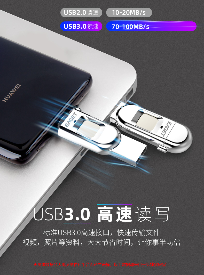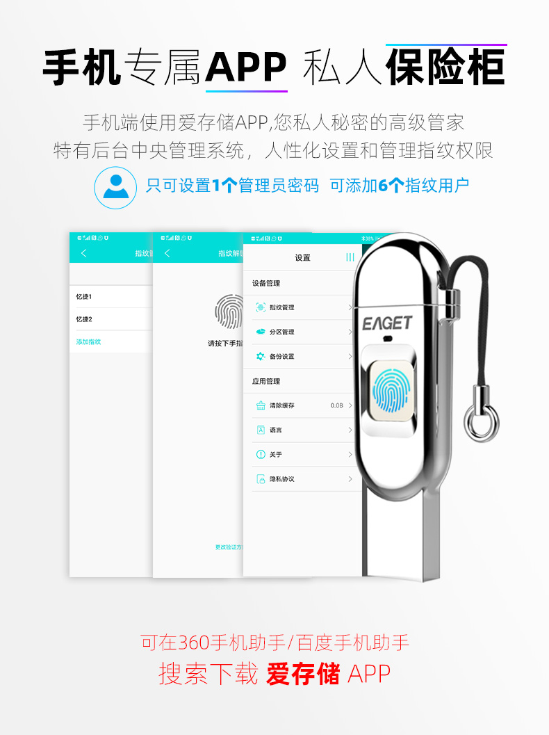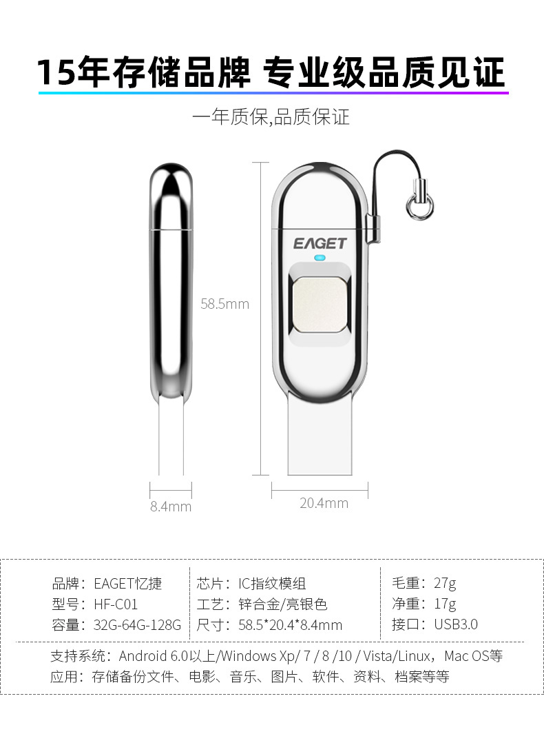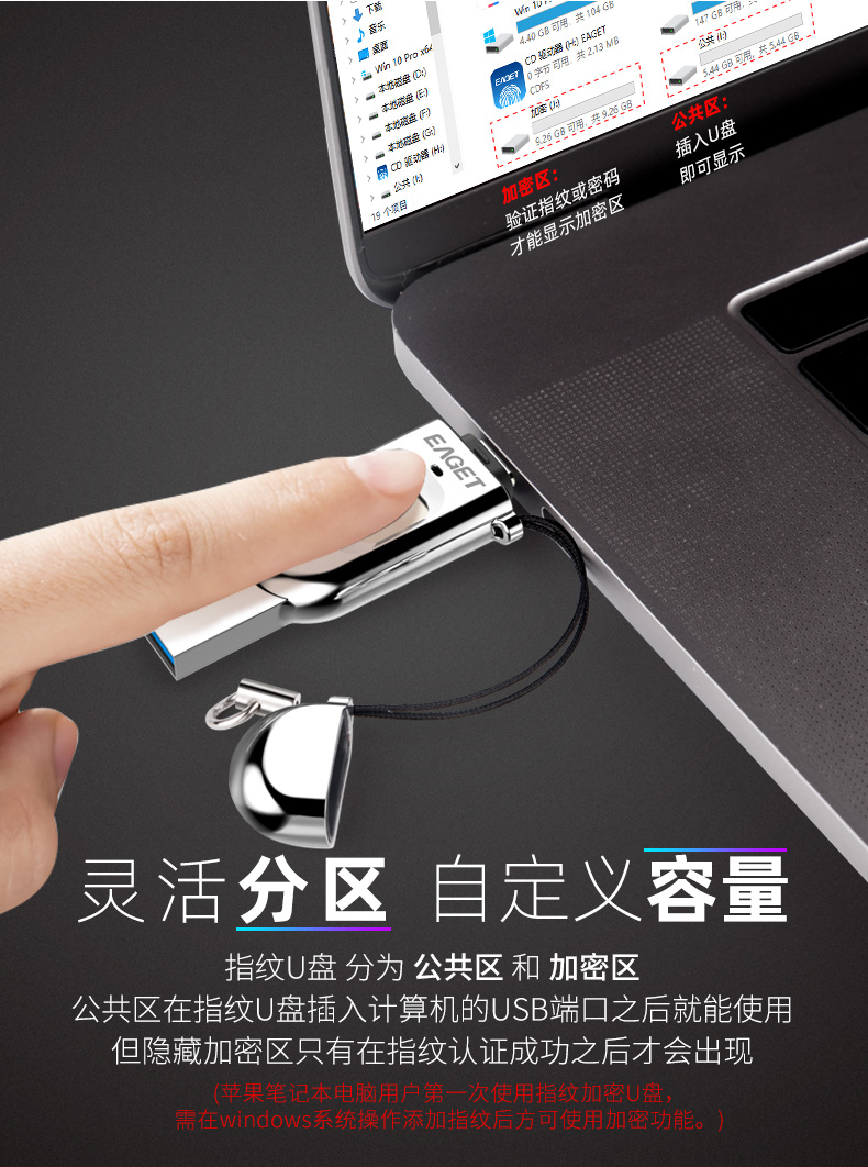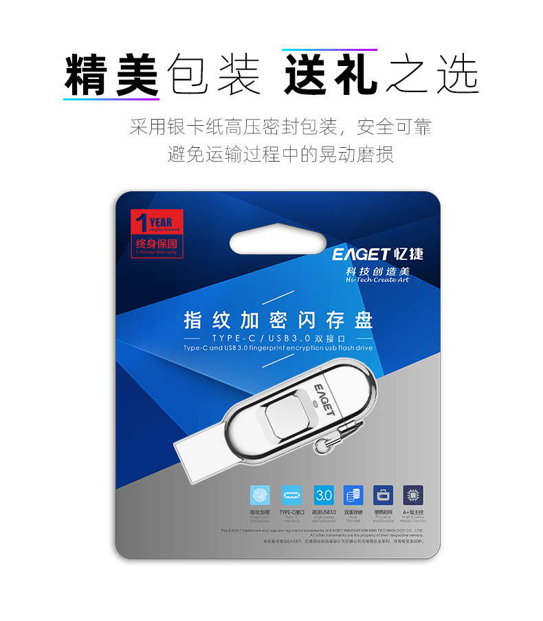 忆捷32GB Type-C USB3.1 HF-C01指纹加密手机U盘 双接口手机电脑多用 隐私安全保护 商务娱乐优盘