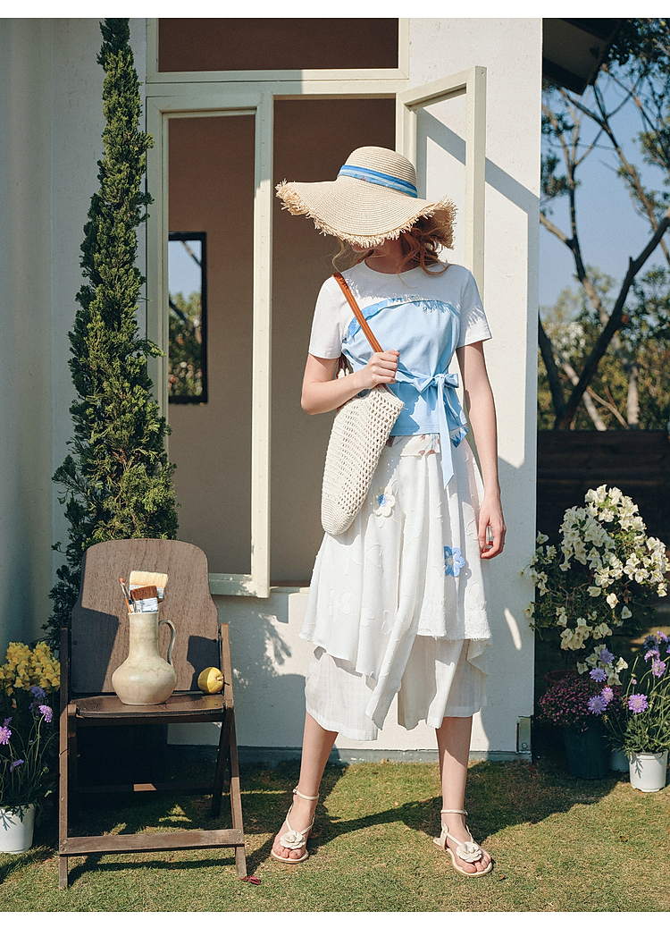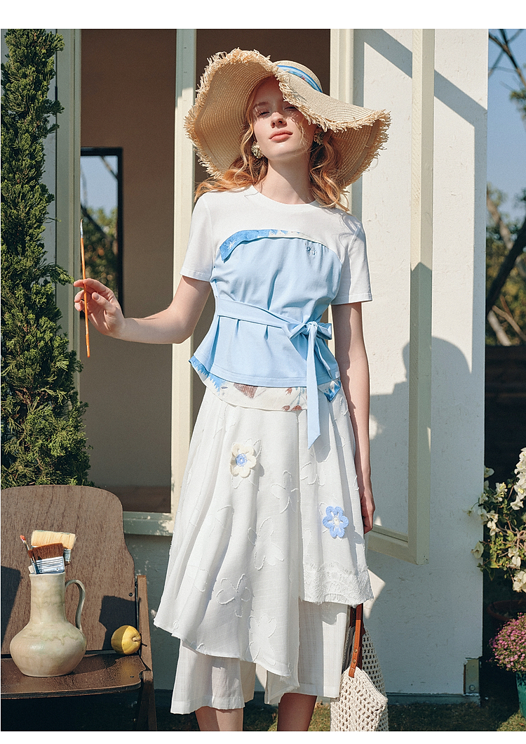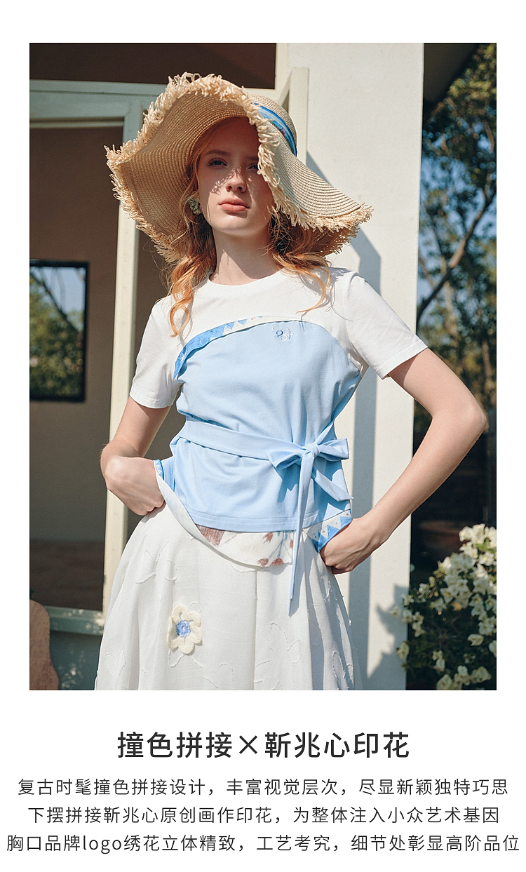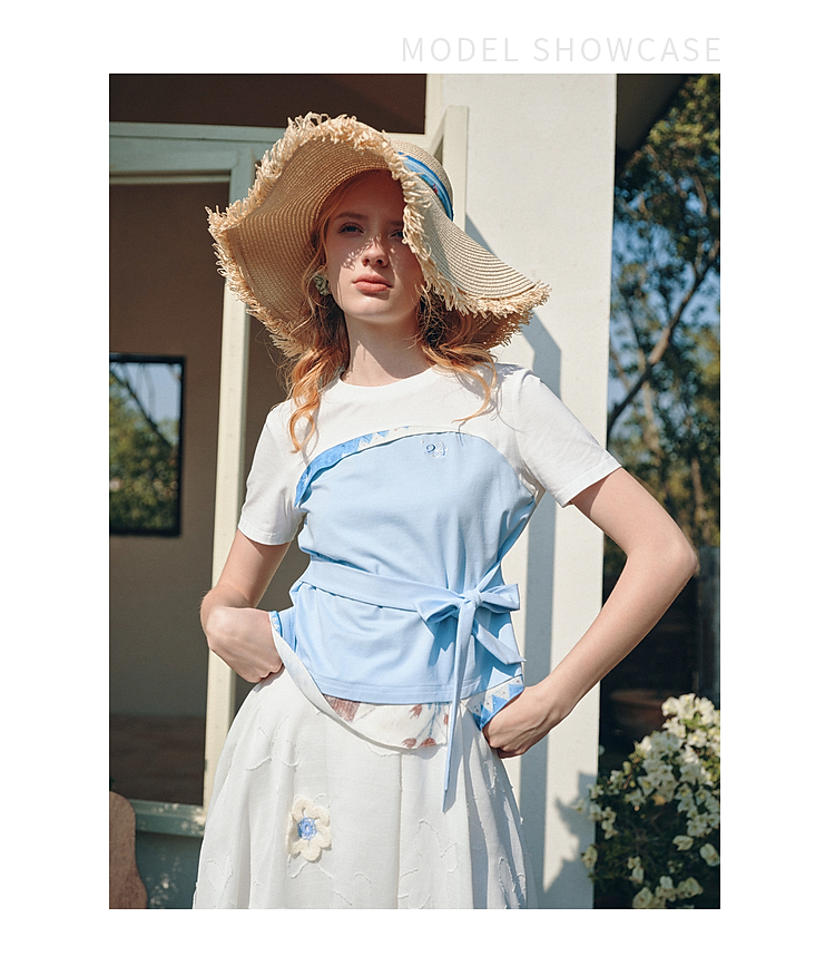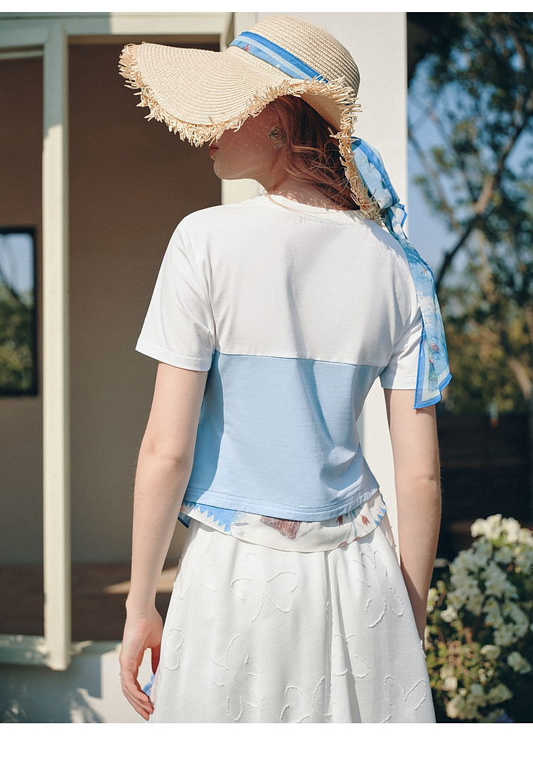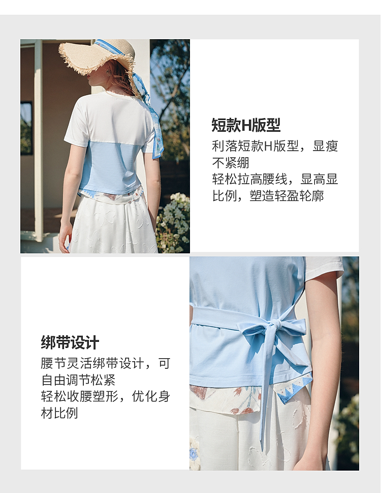 两三事 白昼梦境 2026夏季新款小清新撞色印花绑带短款t恤女