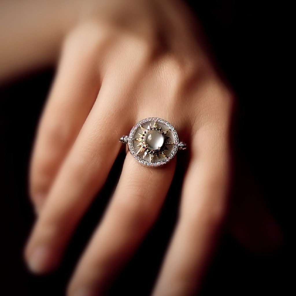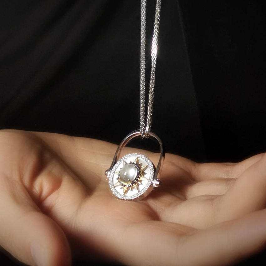 精心挑选一颗极品的白玻璃种翡翠小蛋面,强荧光、通透、散发极强刚性光泽。这颗小白蛋,显露出玻璃种翡翠独有光芒。这光芒明亮、耀眼,却不张扬。如温润委婉的白衣少女,显露着腹有诗书气自华的优雅气质。极为符合我心目中,幸运星的明亮、清澈与璀璨。