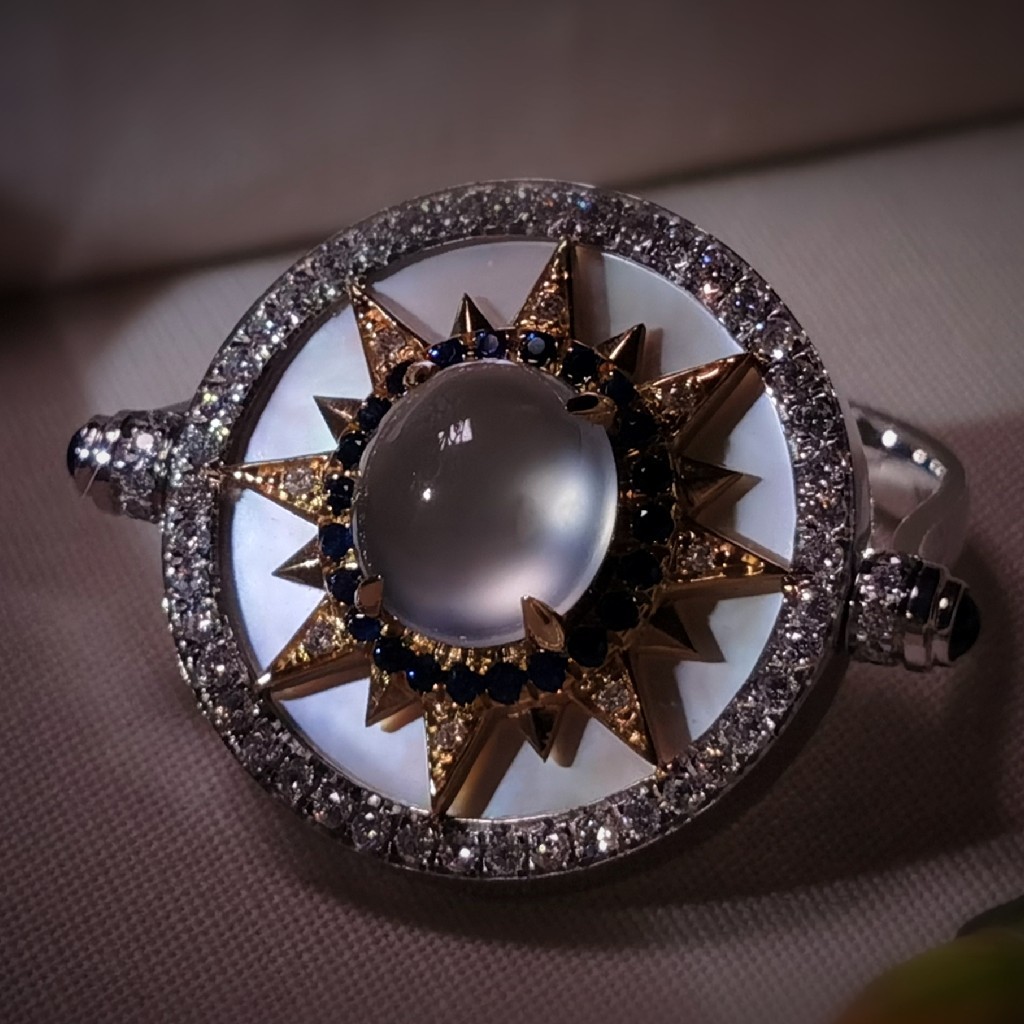用白贝母做底,外围镶一圈钻石,翡翠则围镶一圈蓝宝石突出层次,k黄金做星芒,从此星辰大海便可以戴在身上。起名【幸运星】。