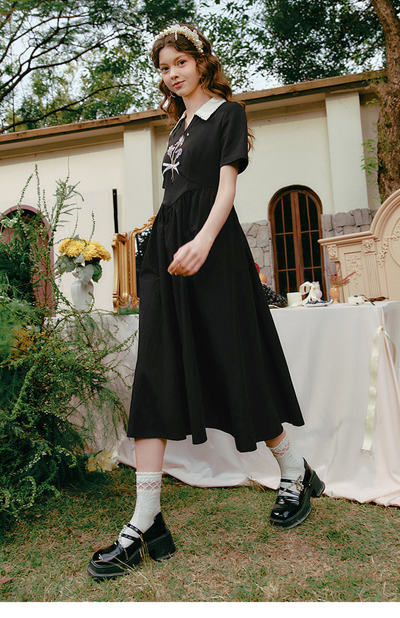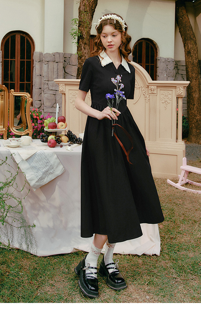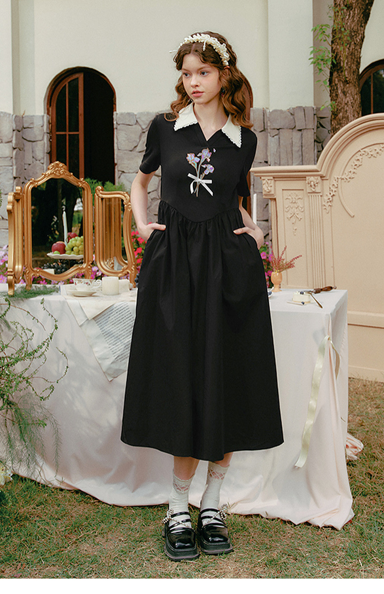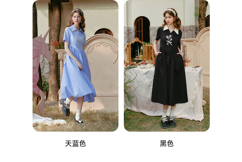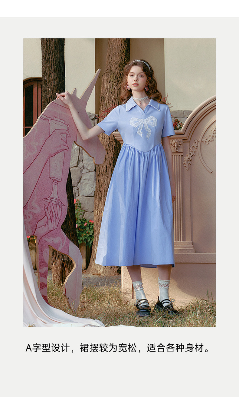 两三事 鸢蝶预言 2025春季新款复古绣花蕾丝边翻领a字连衣裙
