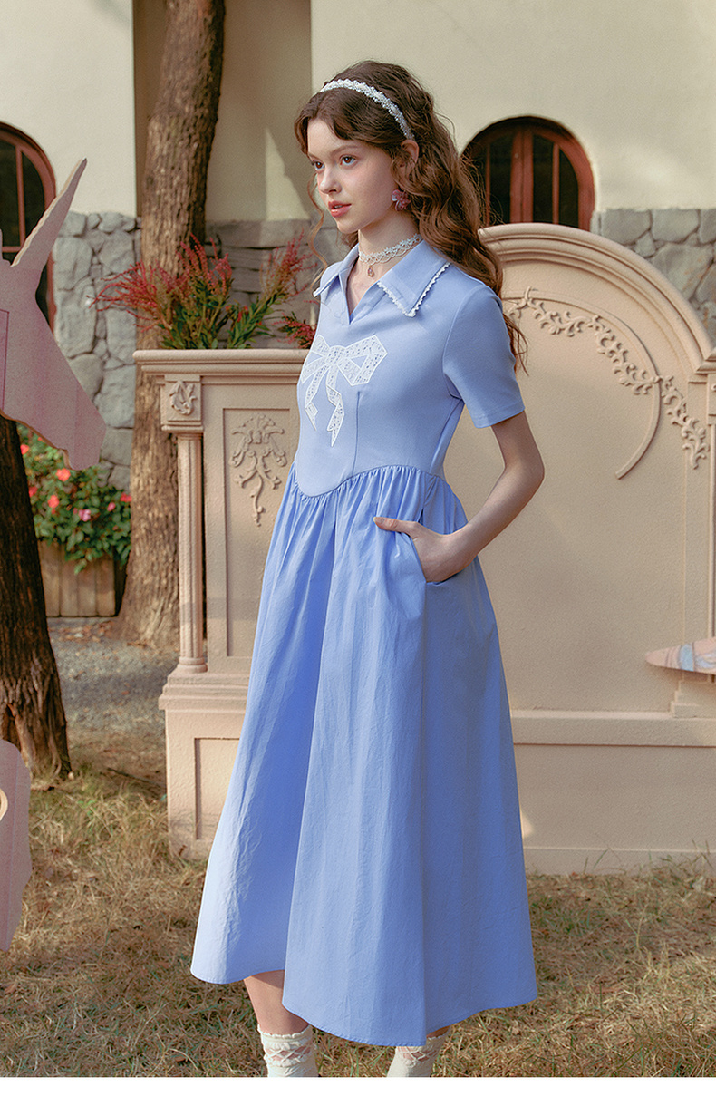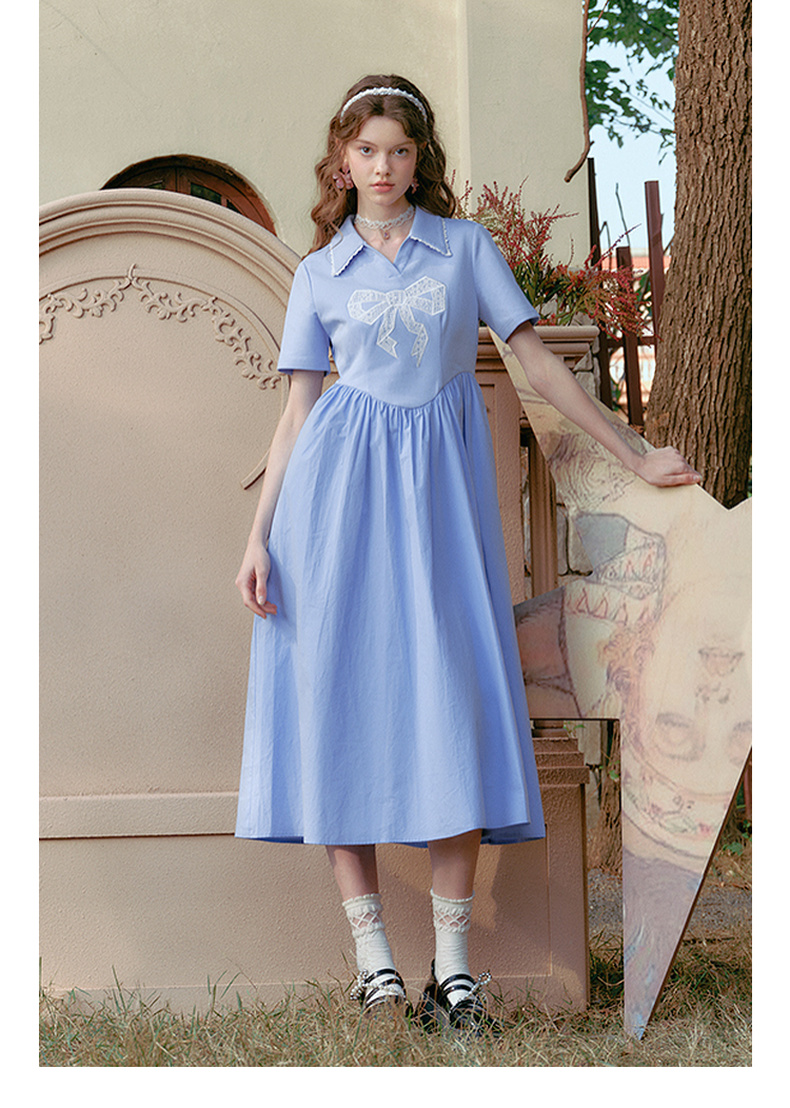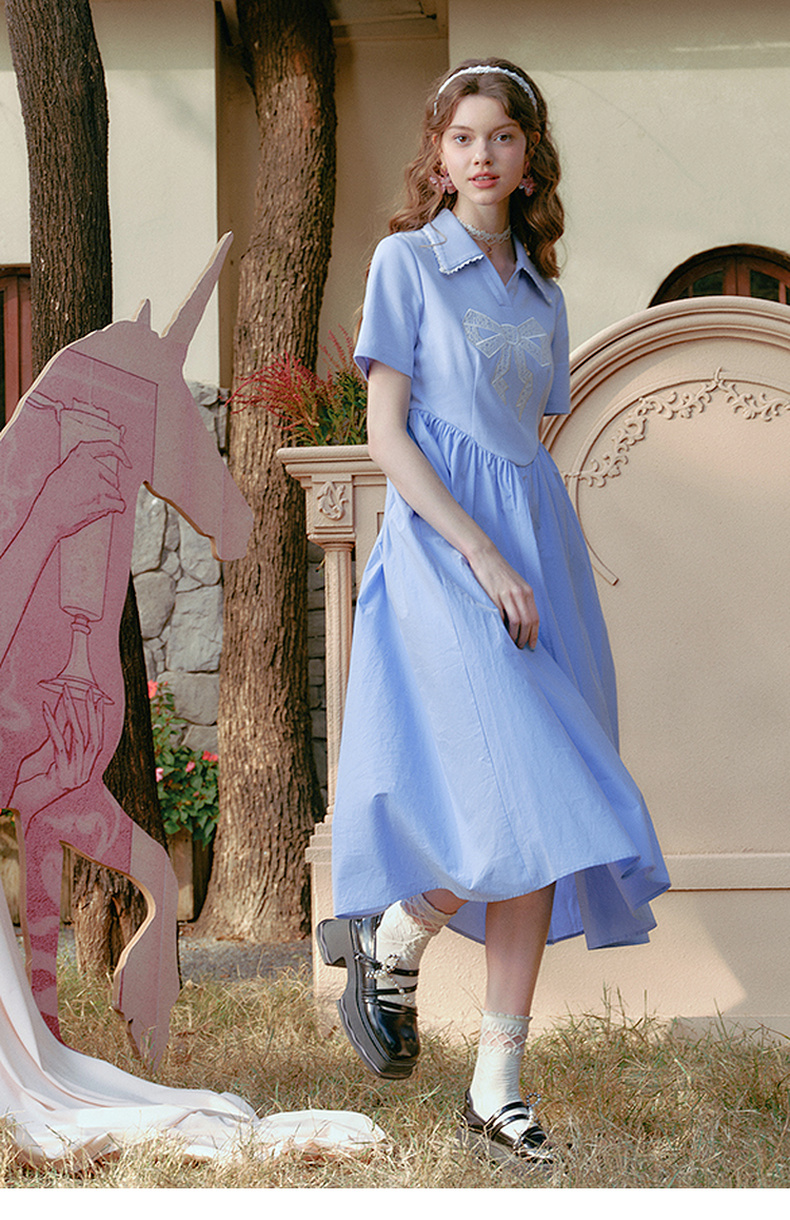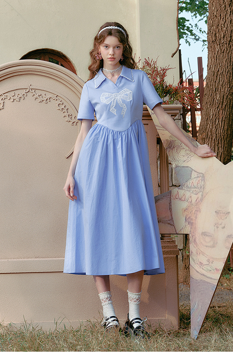 两三事 鸢蝶预言 2025春季新款复古绣花蕾丝边翻领a字连衣裙