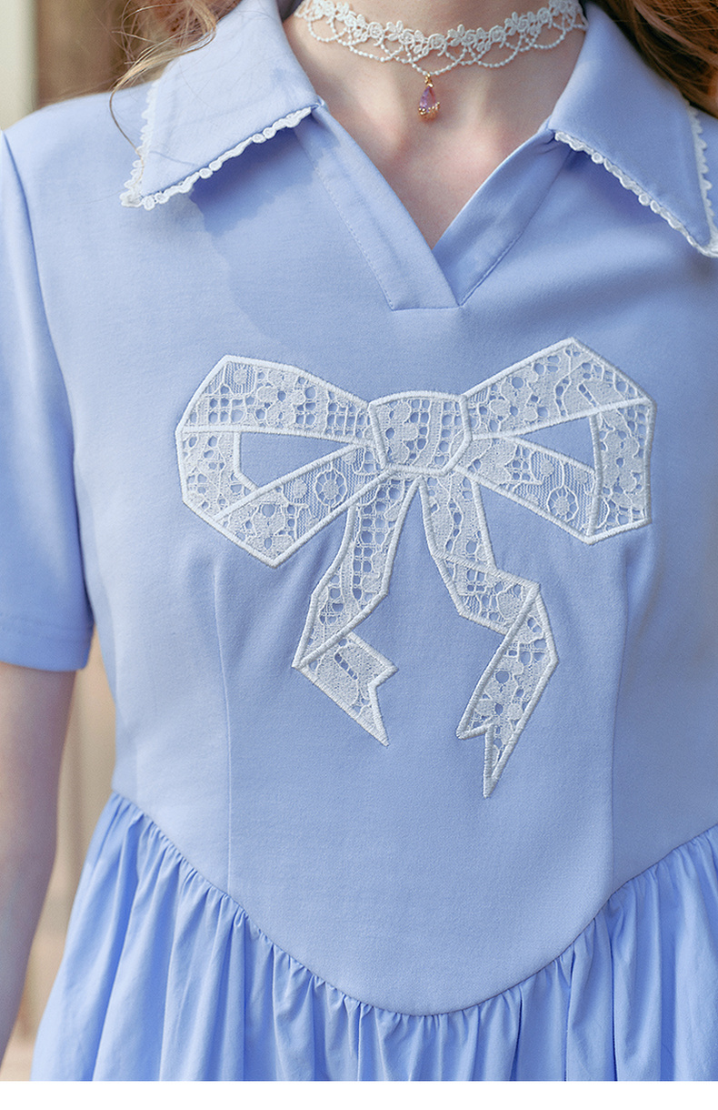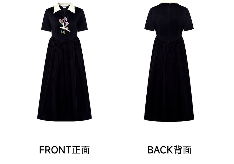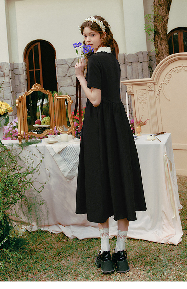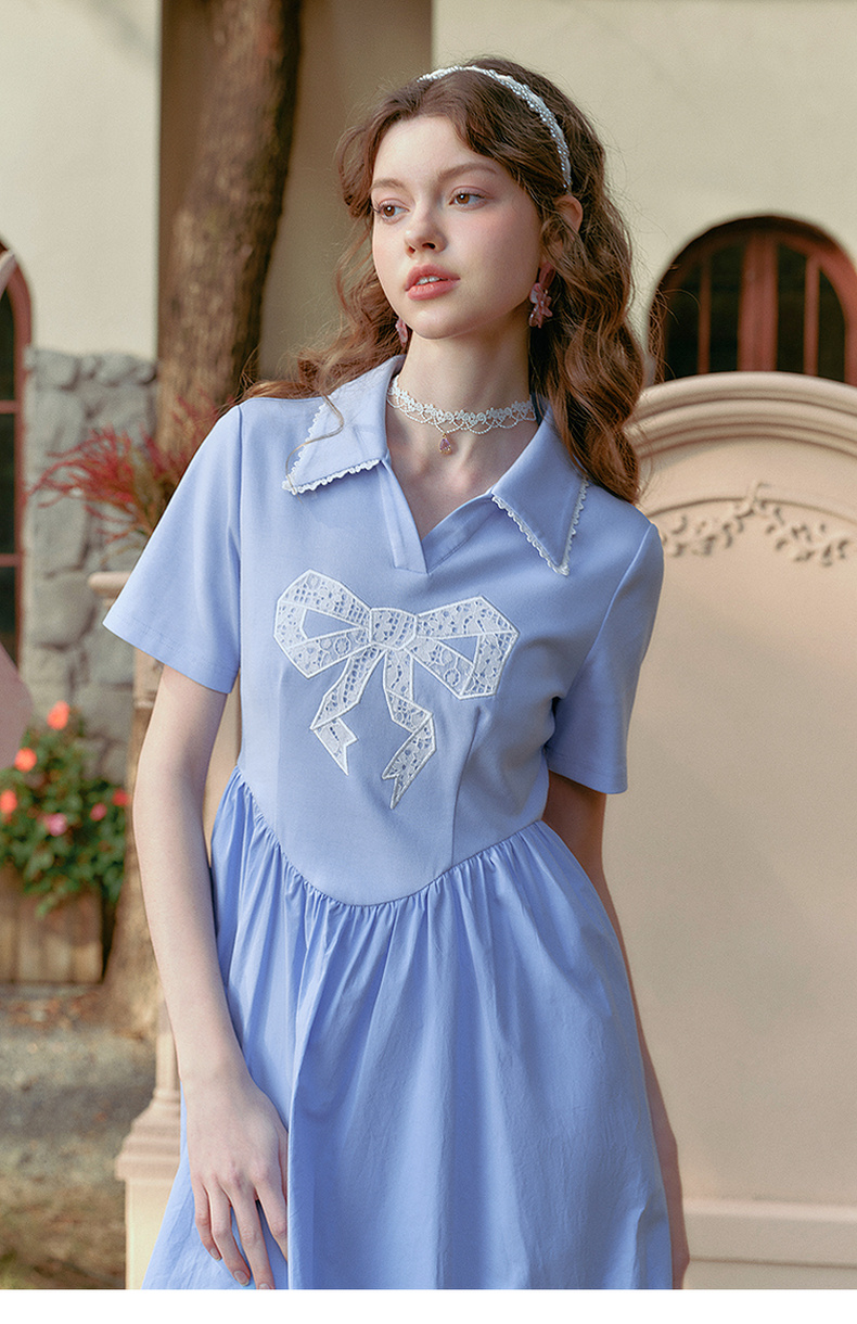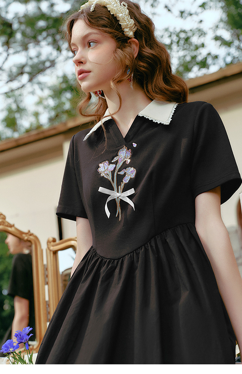 两三事 鸢蝶预言 2025春季新款复古绣花蕾丝边翻领a字连衣裙