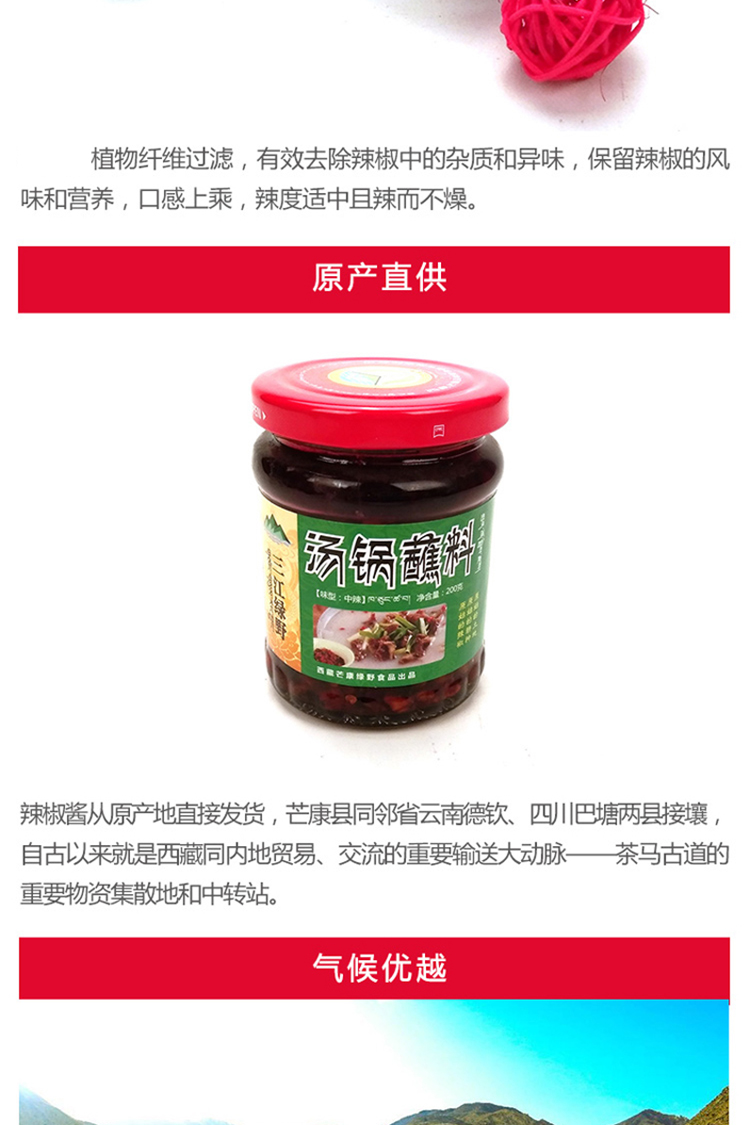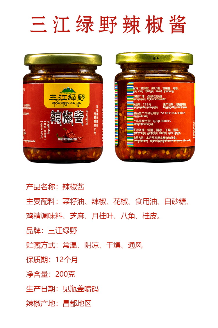 西藏特产 昌都市芒康县 辣椒酱 1瓶200g
