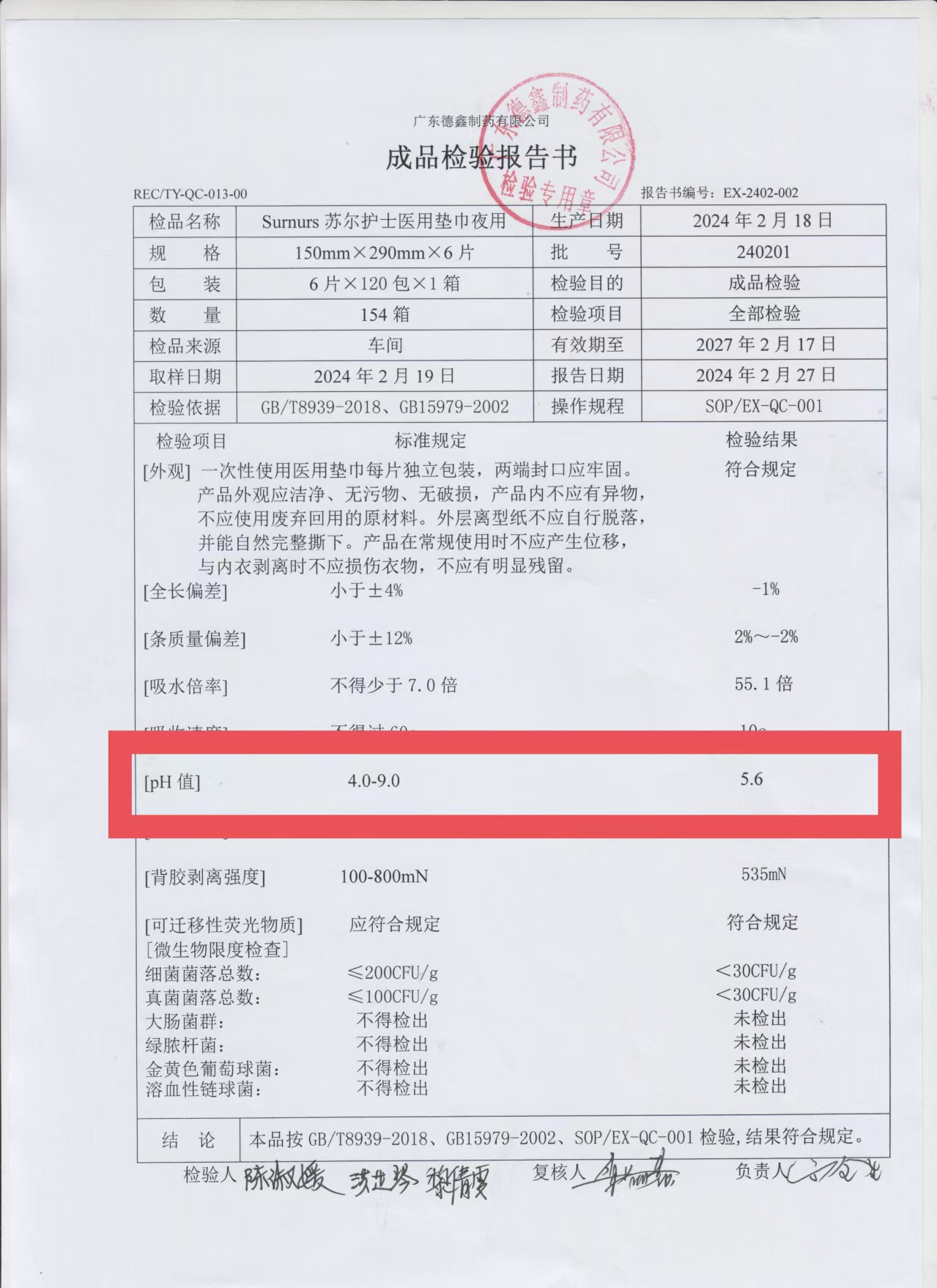苏尔护士的PH值检测为5.6-6.2之间,属于a类标准,优等品