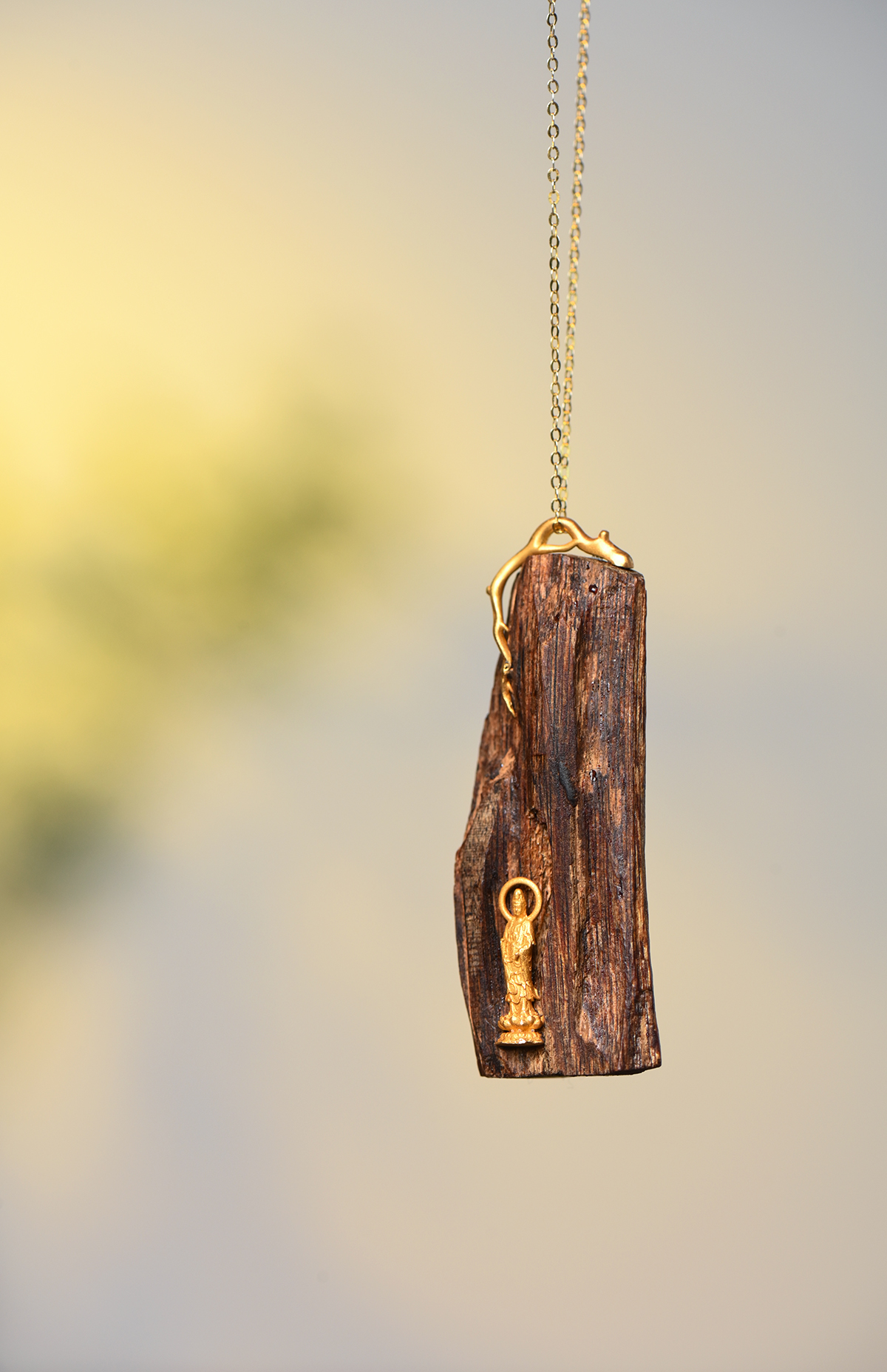 本身的造型与观音形象完美结合。观音的塑造,面相温娴慈祥,手持如意立于莲花之上,其衣纹刻画极其自然,神态表现恰如其分。