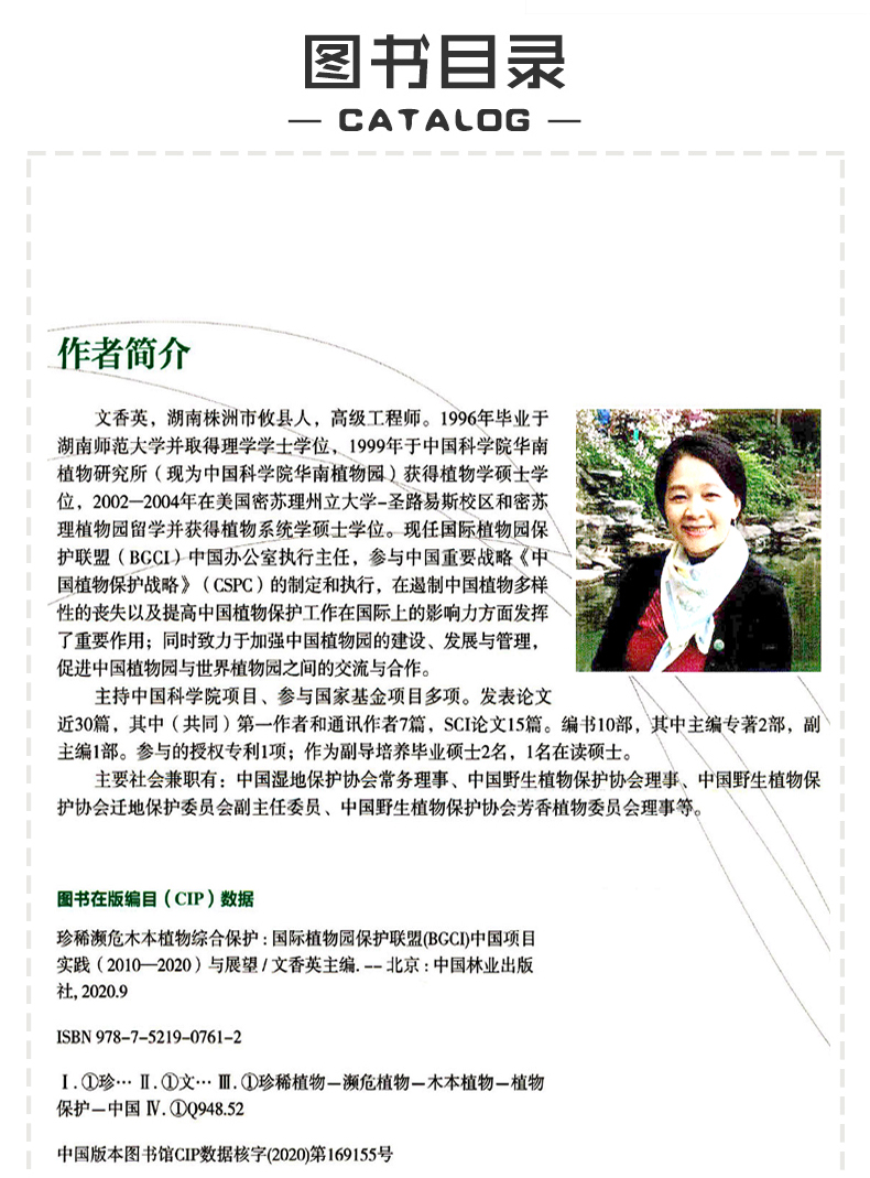 该书总结了BGCI及其诸多中国会员植物园和合作伙伴过去10年的主要工作,并收录了23个珍稀濒危木本植物综合保护和恢复典型案例。