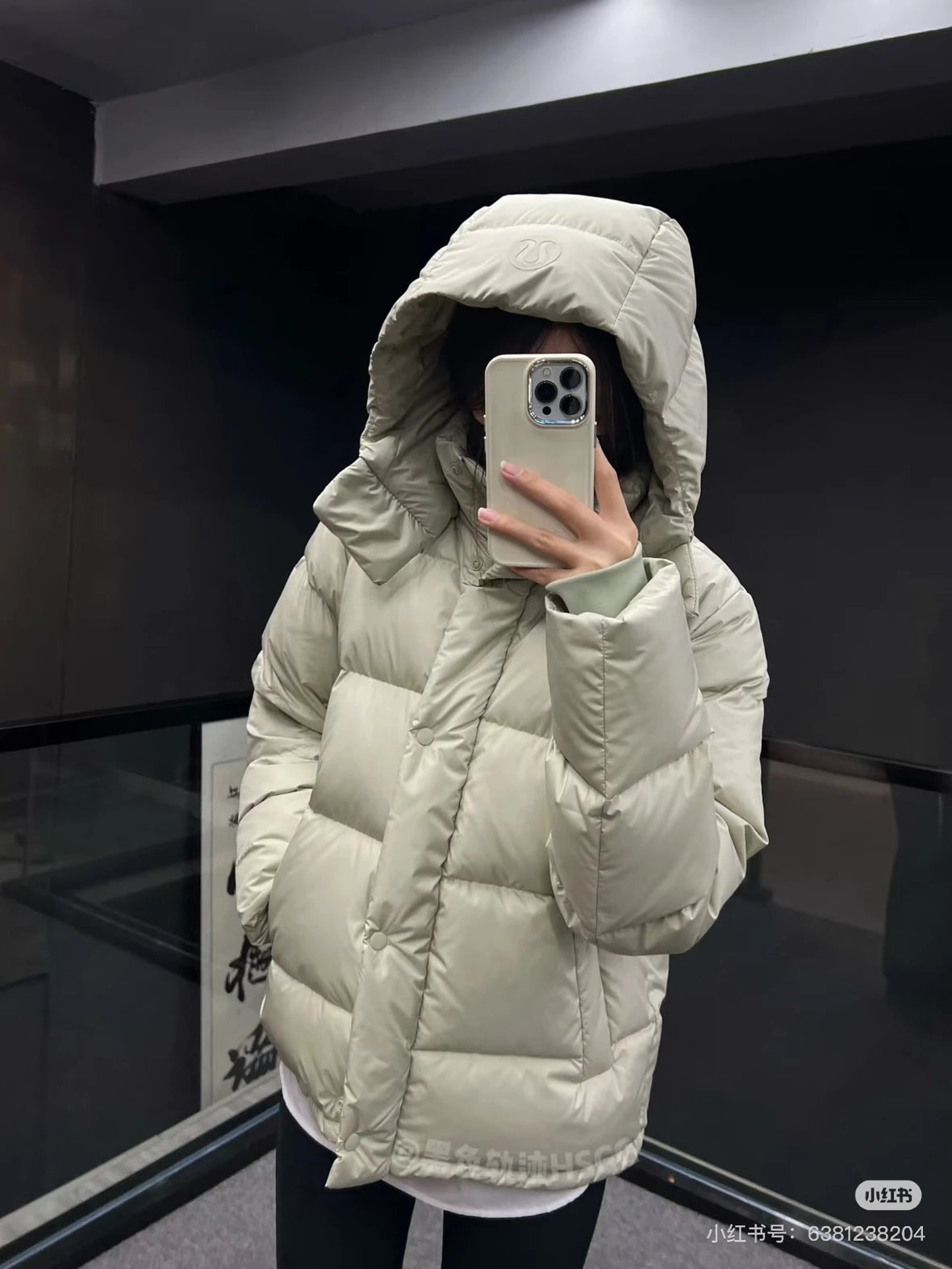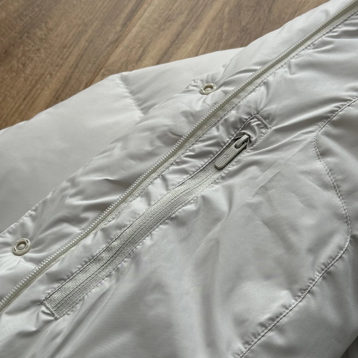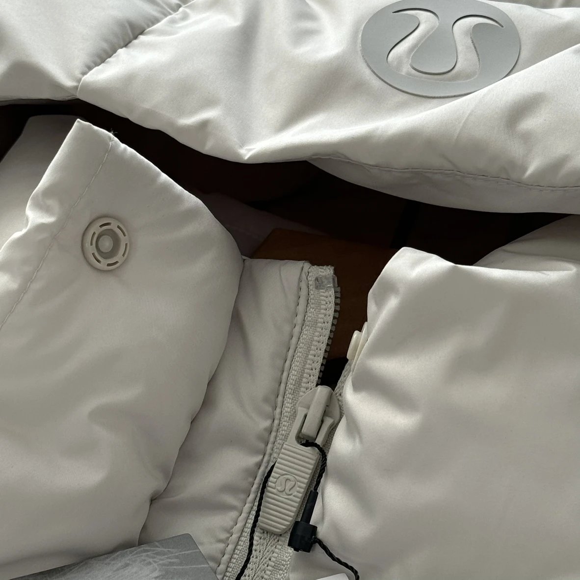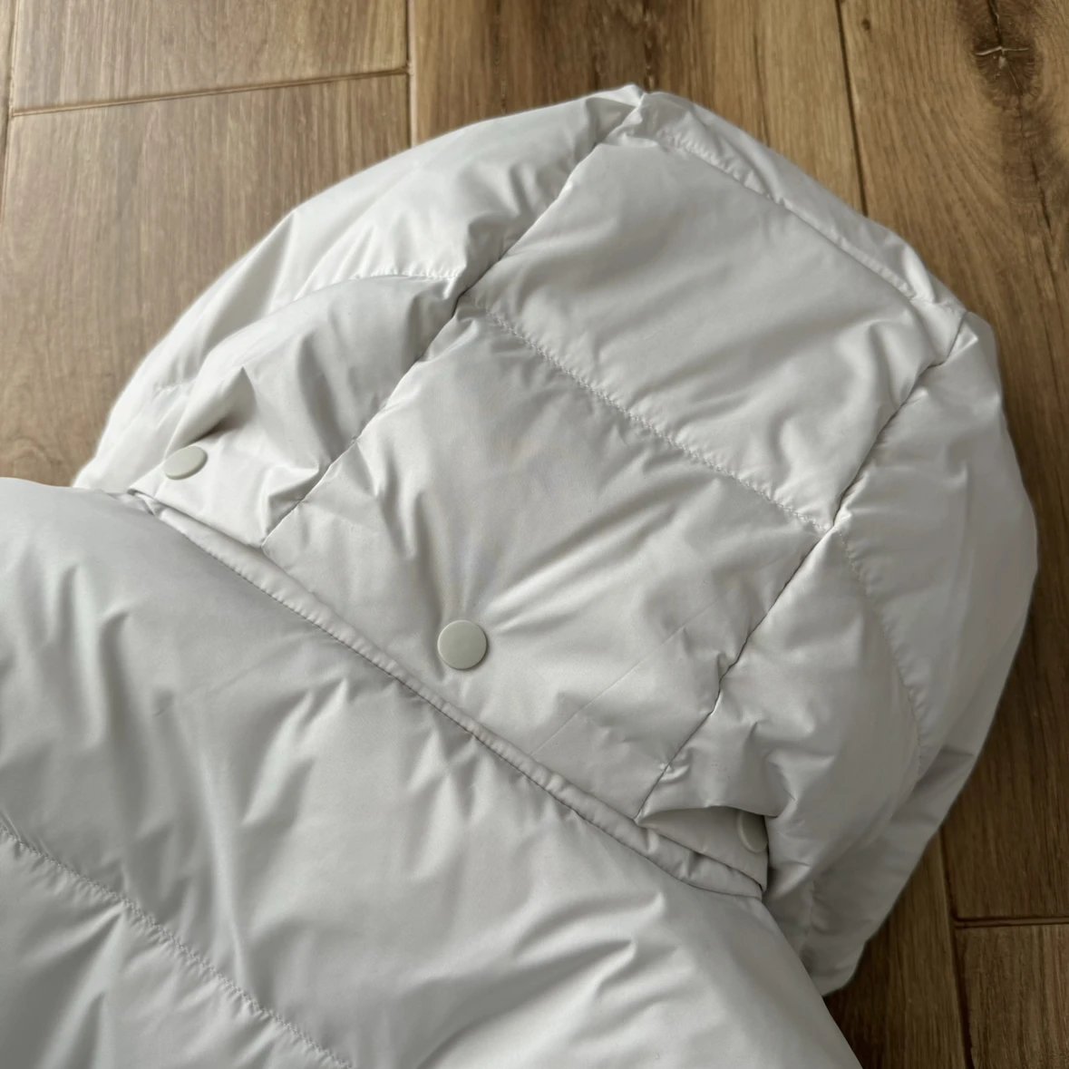 可拆卸优质保温兜帽 logo元素 采用四合按扣固定并目填充了羽绒 给头部和脖颈周围带来更大的柔软感 不喜欢戴帽子的 可以拆下来直接当羽绒夹克上身 风格多变