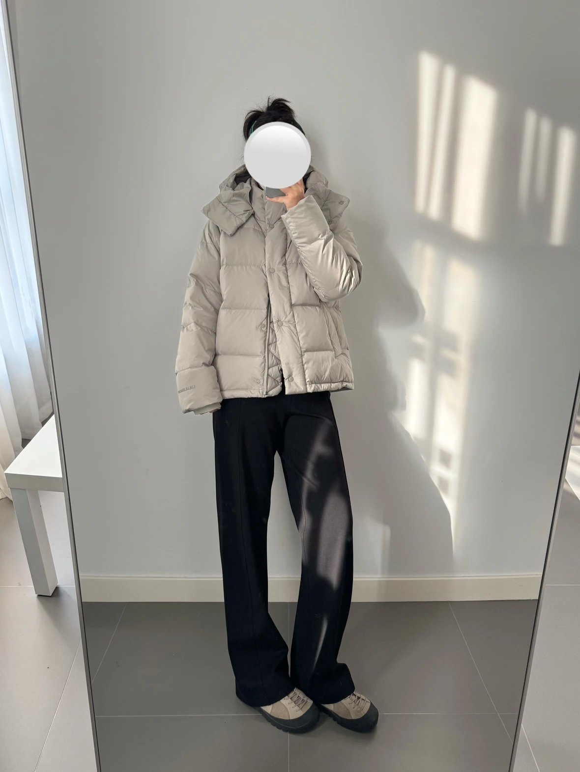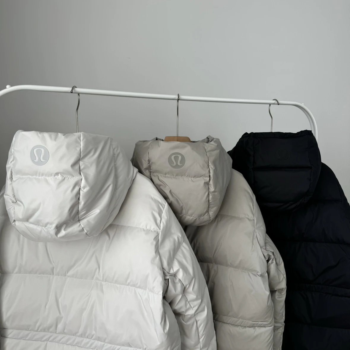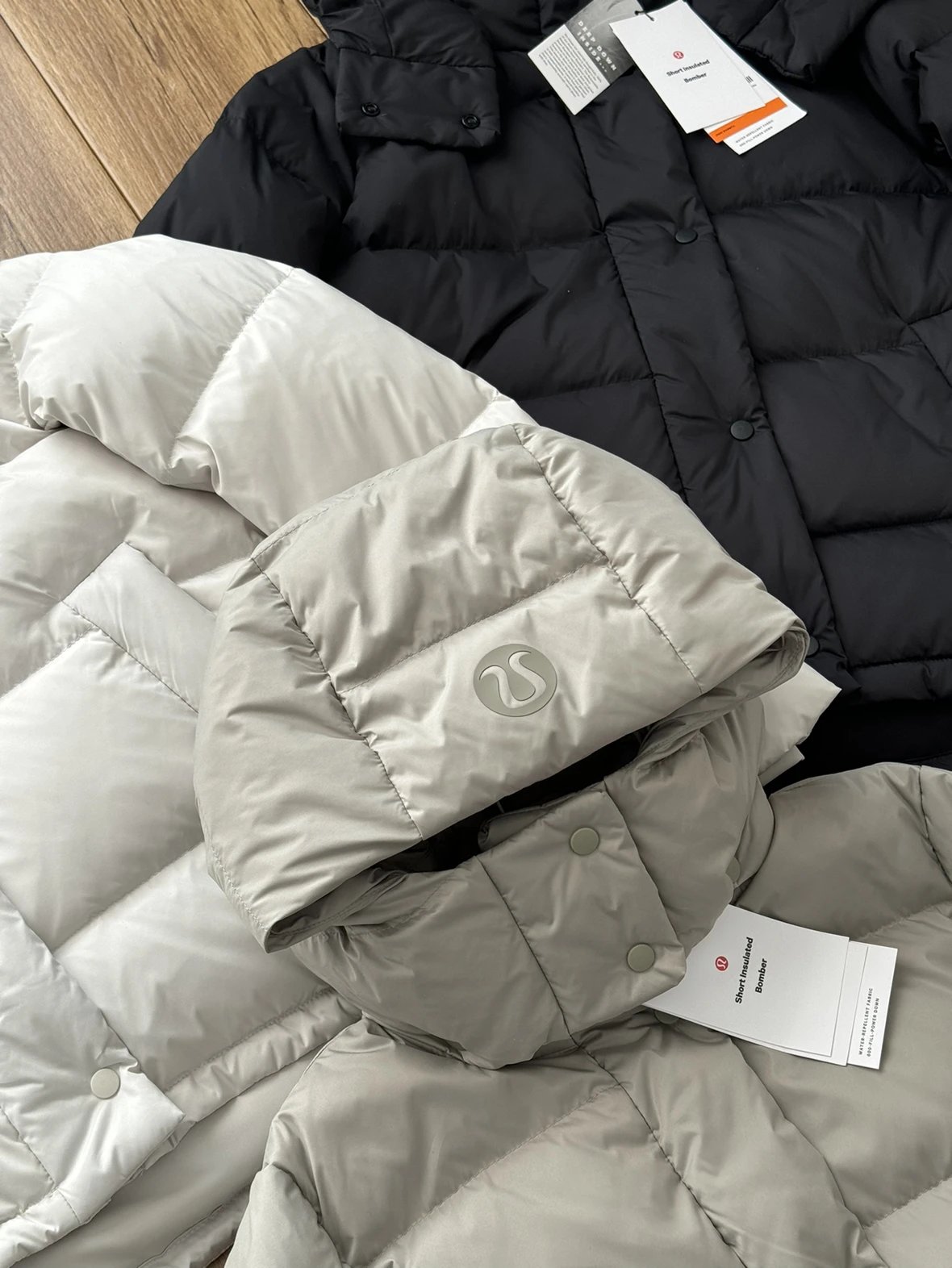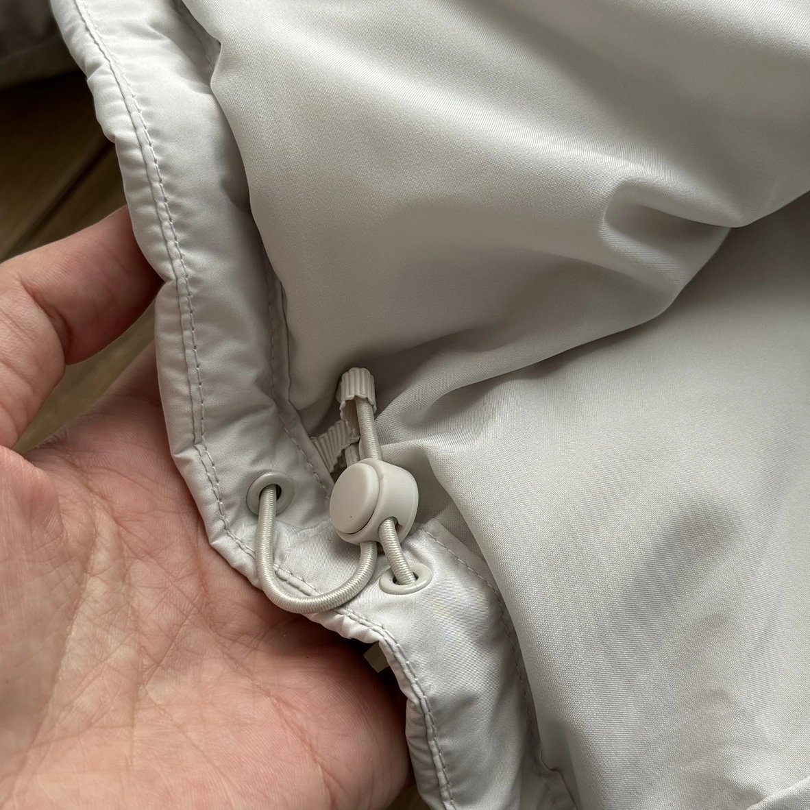 可拆卸优质保温兜帽 logo元素 采用四合按扣固定并目填充了羽绒 给头部和脖颈周围带来更大的柔软感 不喜欢戴帽子的 可以拆下来直接当羽绒夹克上身 风格多变