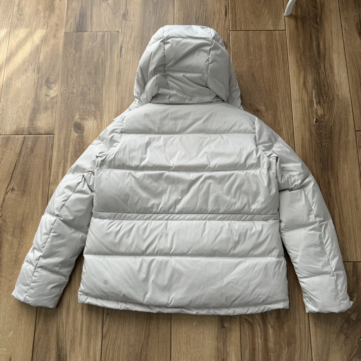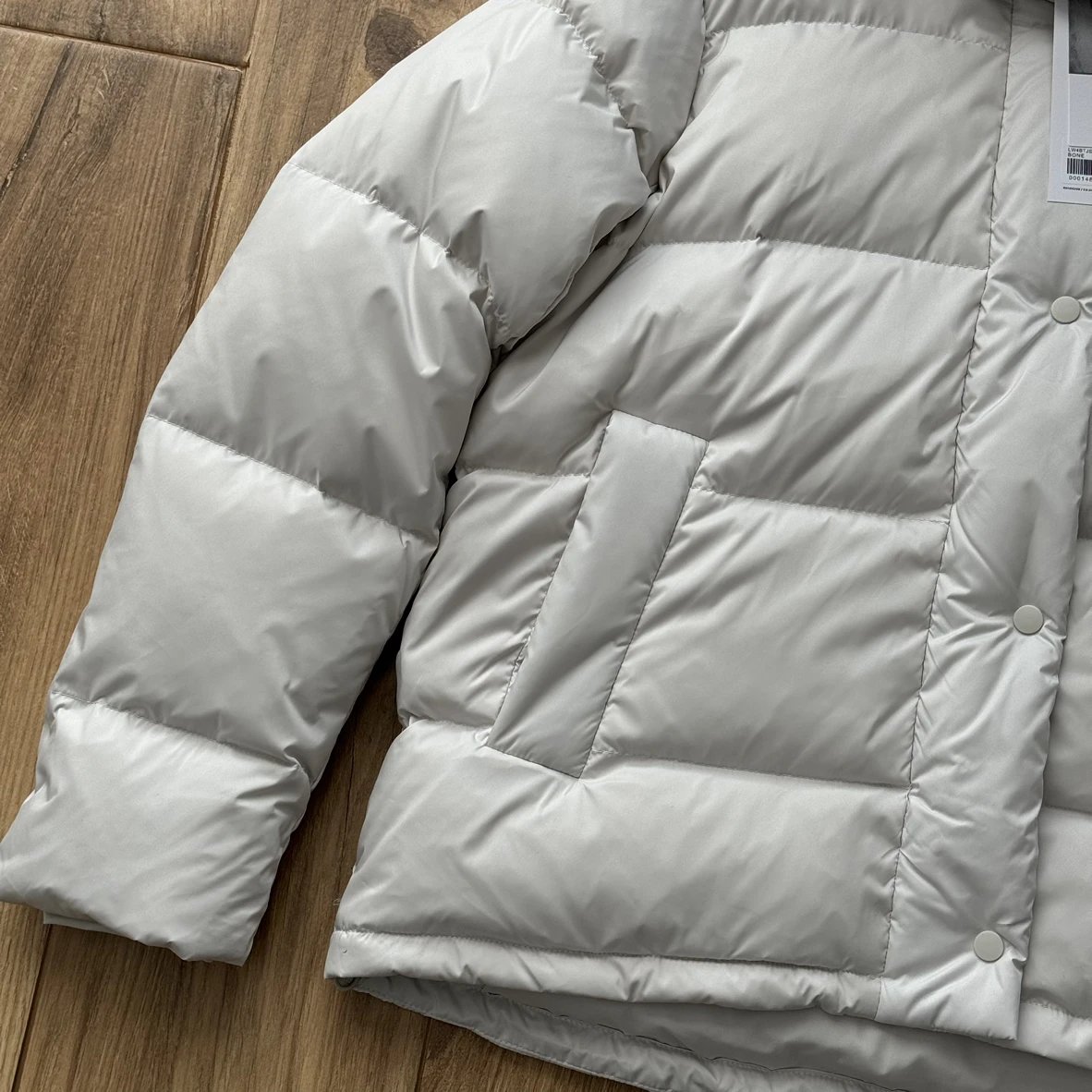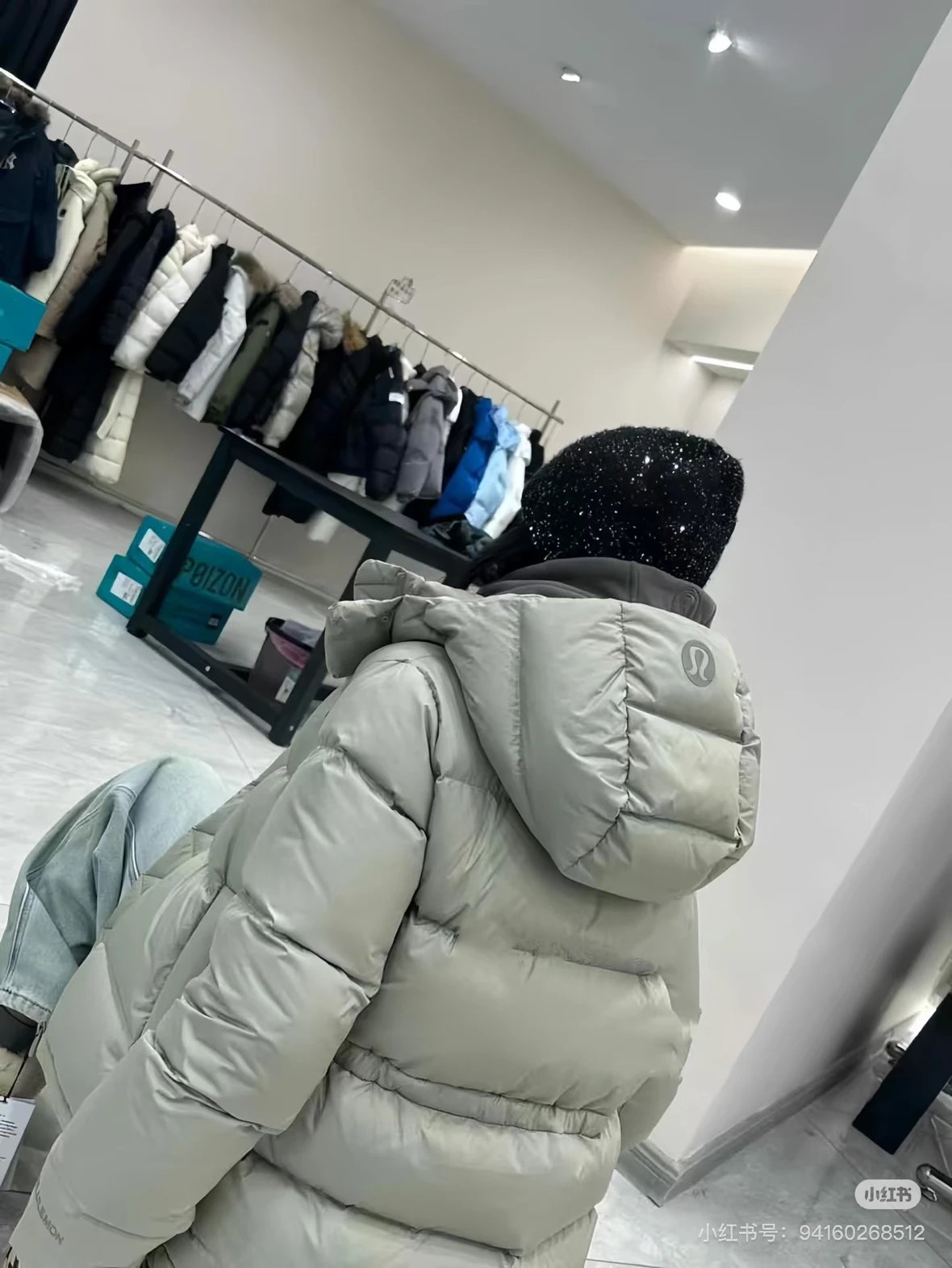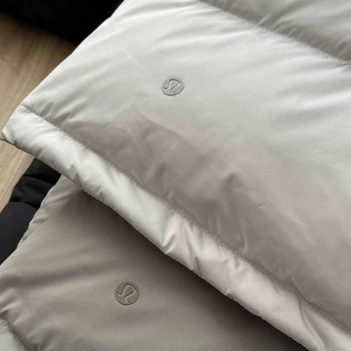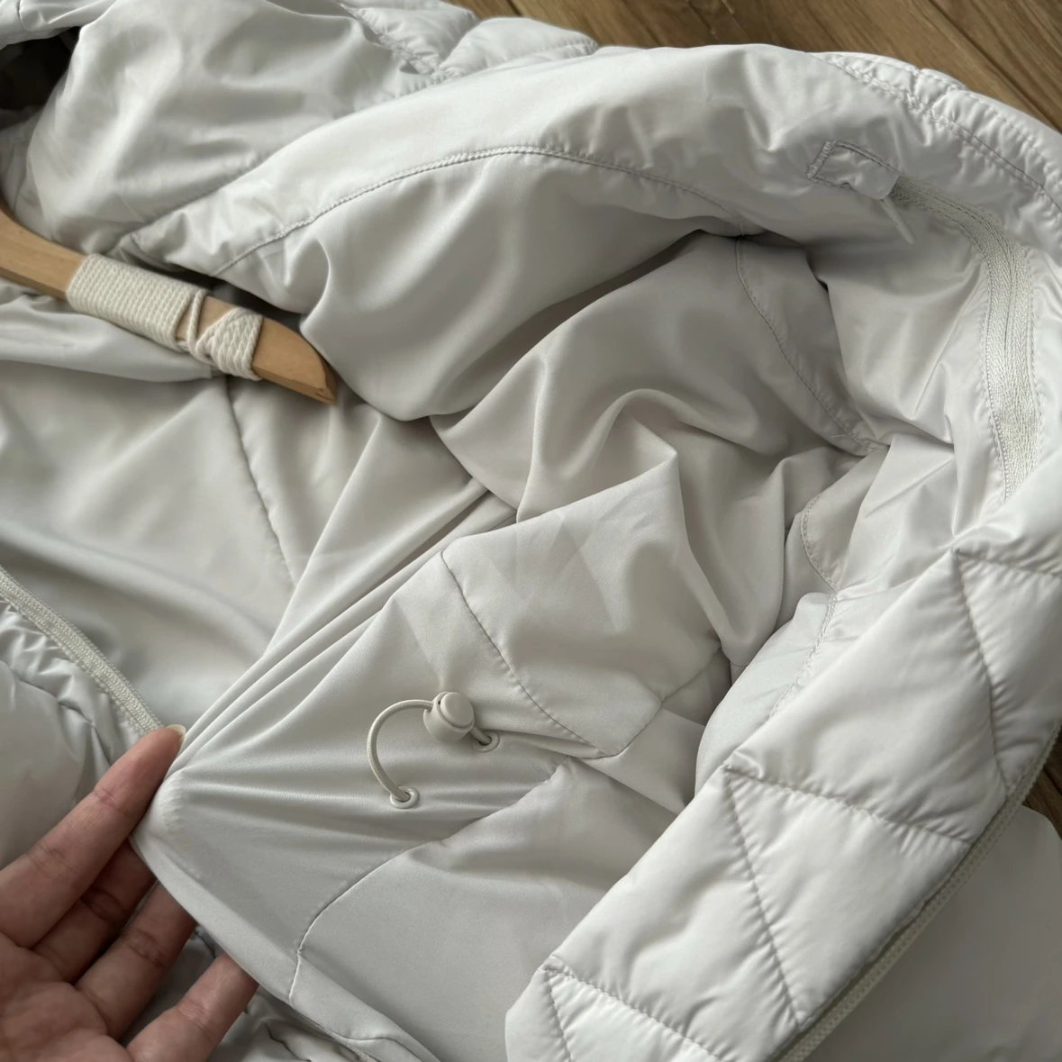 可拆卸优质保温兜帽 logo元素 采用四合按扣固定并目填充了羽绒 给头部和脖颈周围带来更大的柔软感 不喜欢戴帽子的 可以拆下来直接当羽绒夹克上身 风格多变