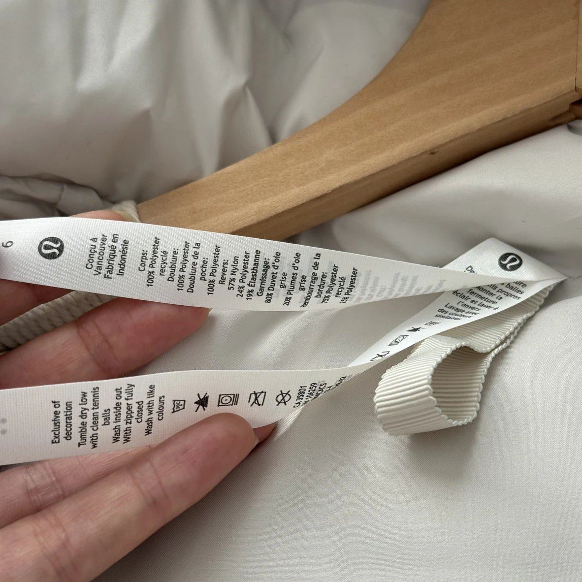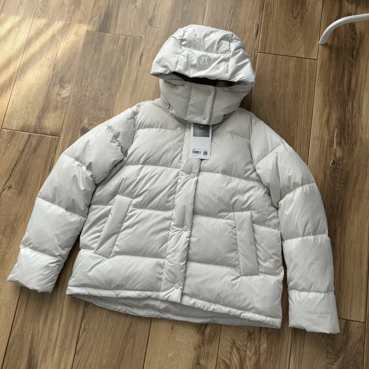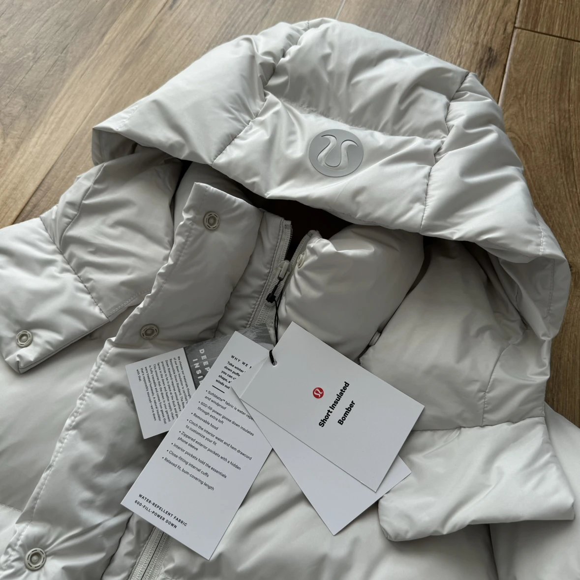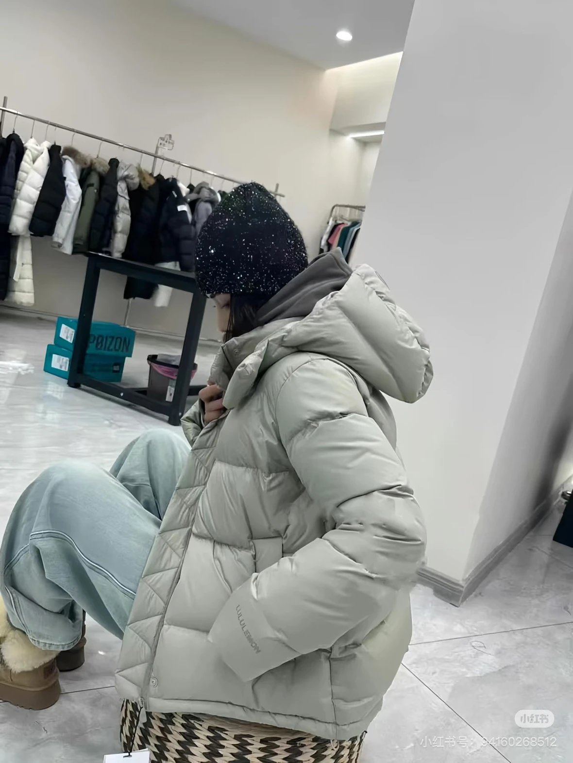 可拆卸优质保温兜帽 logo元素 采用四合按扣固定并目填充了羽绒 给头部和脖颈周围带来更大的柔软感 不喜欢戴帽子的 可以拆下来直接当羽绒夹克上身 风格多变