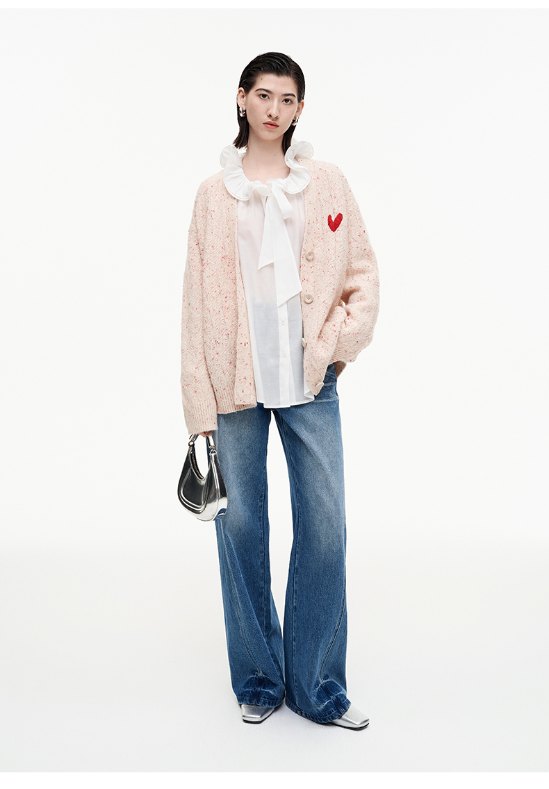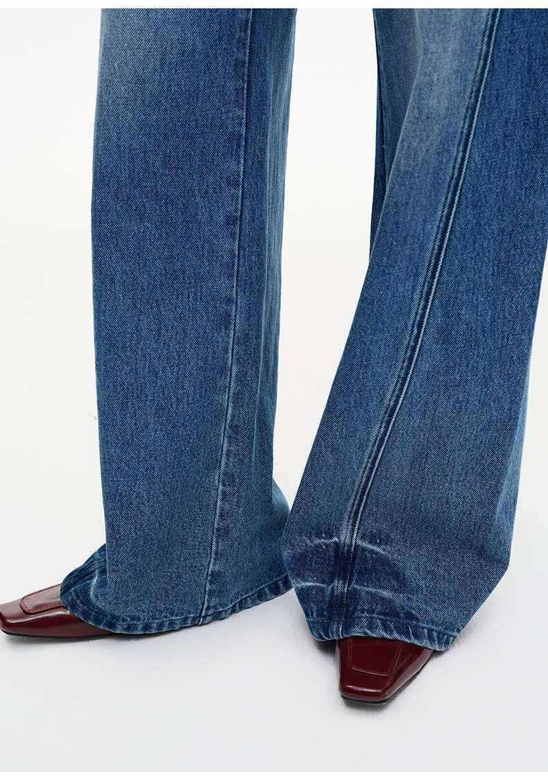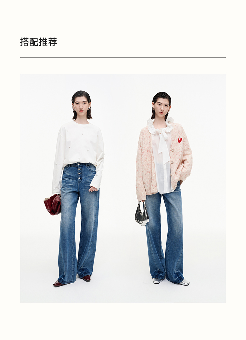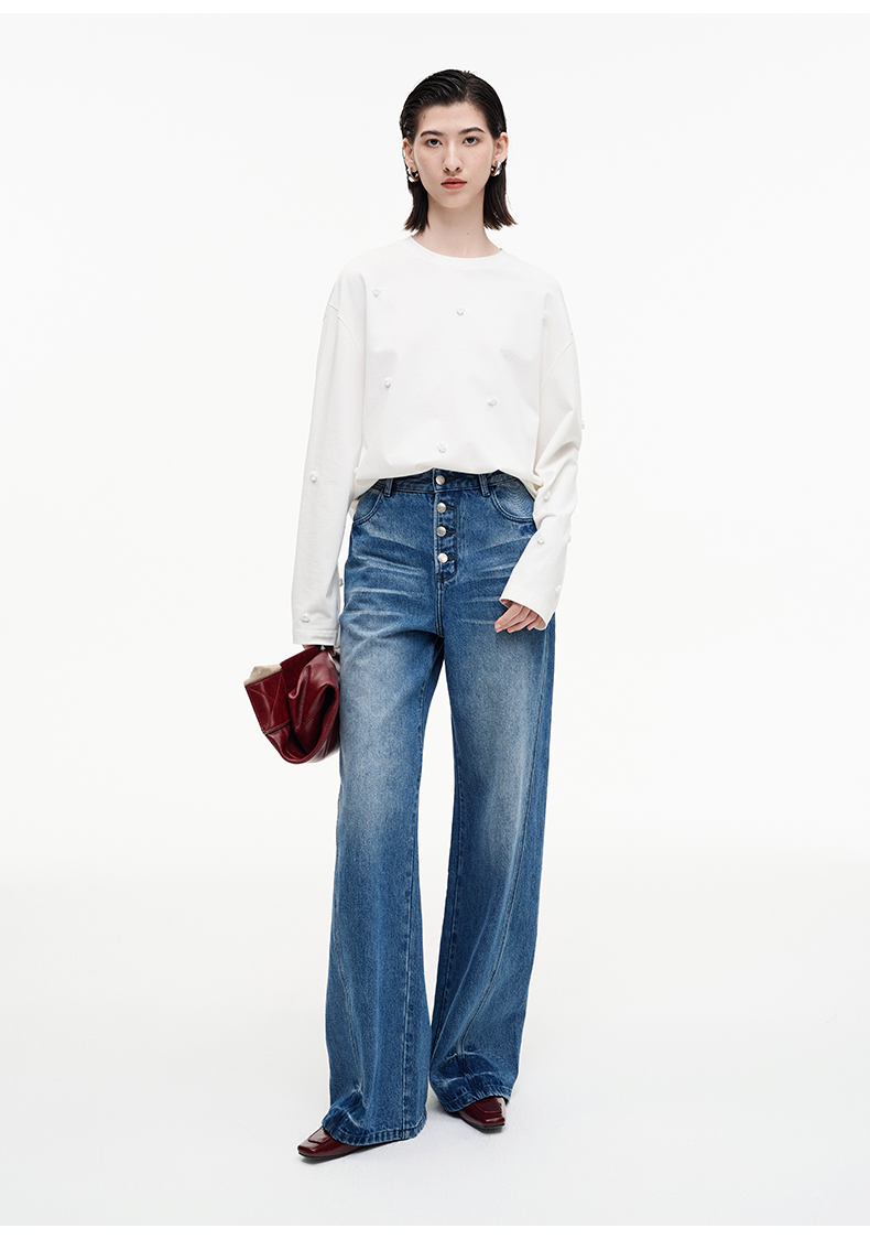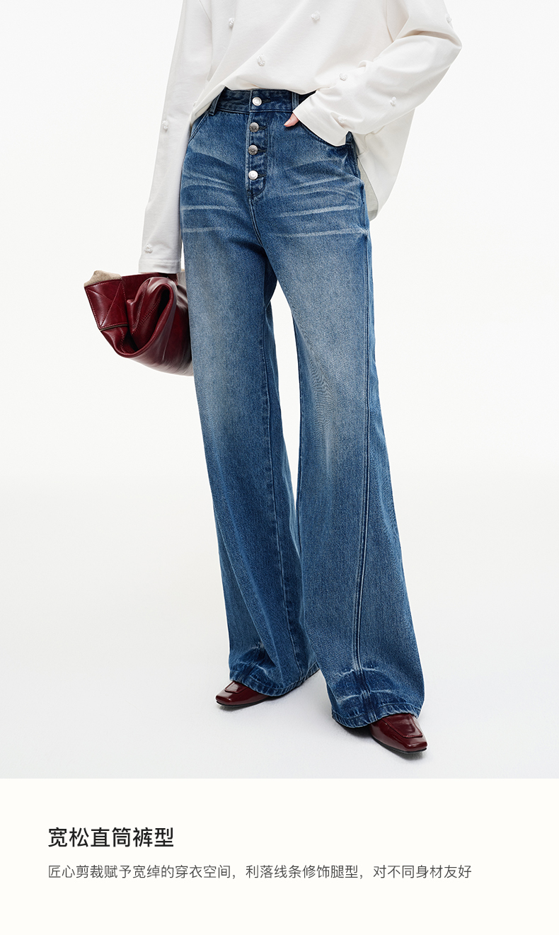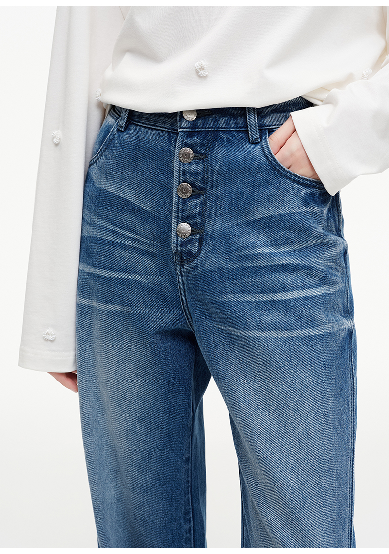SELFWHO纯棉复古猫须水洗排扣蓝色牛仔裤女2025秋新款宽松直筒裤