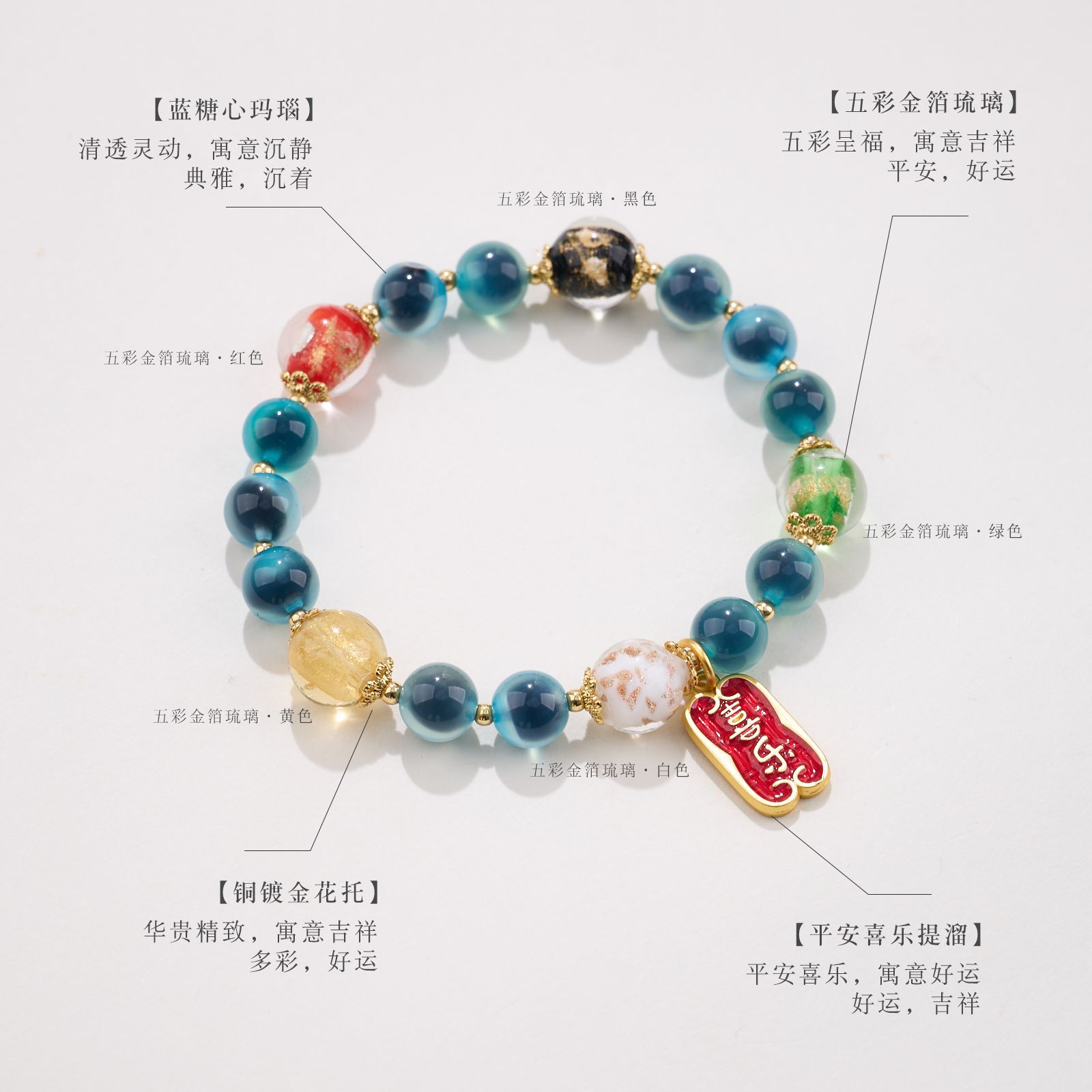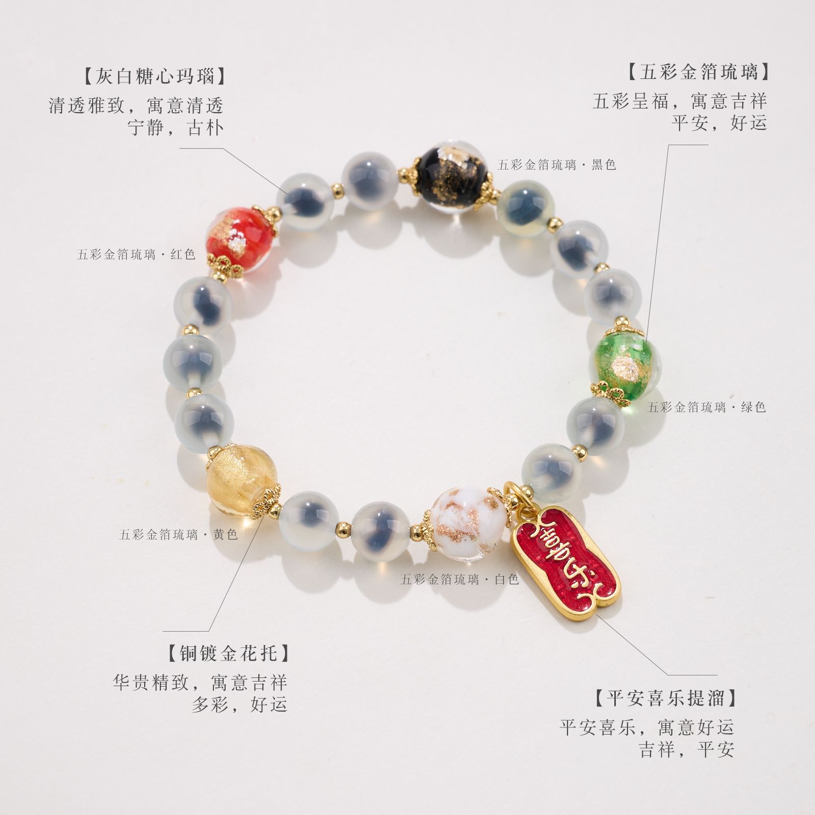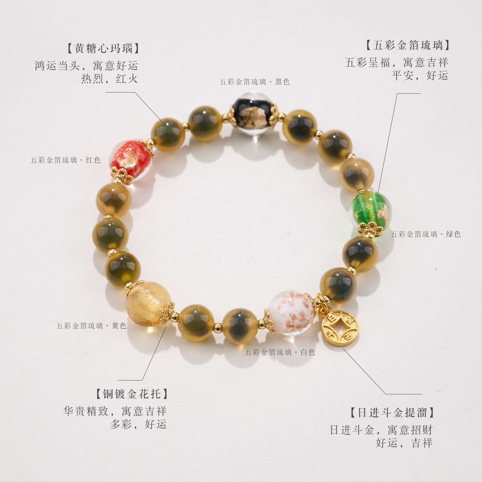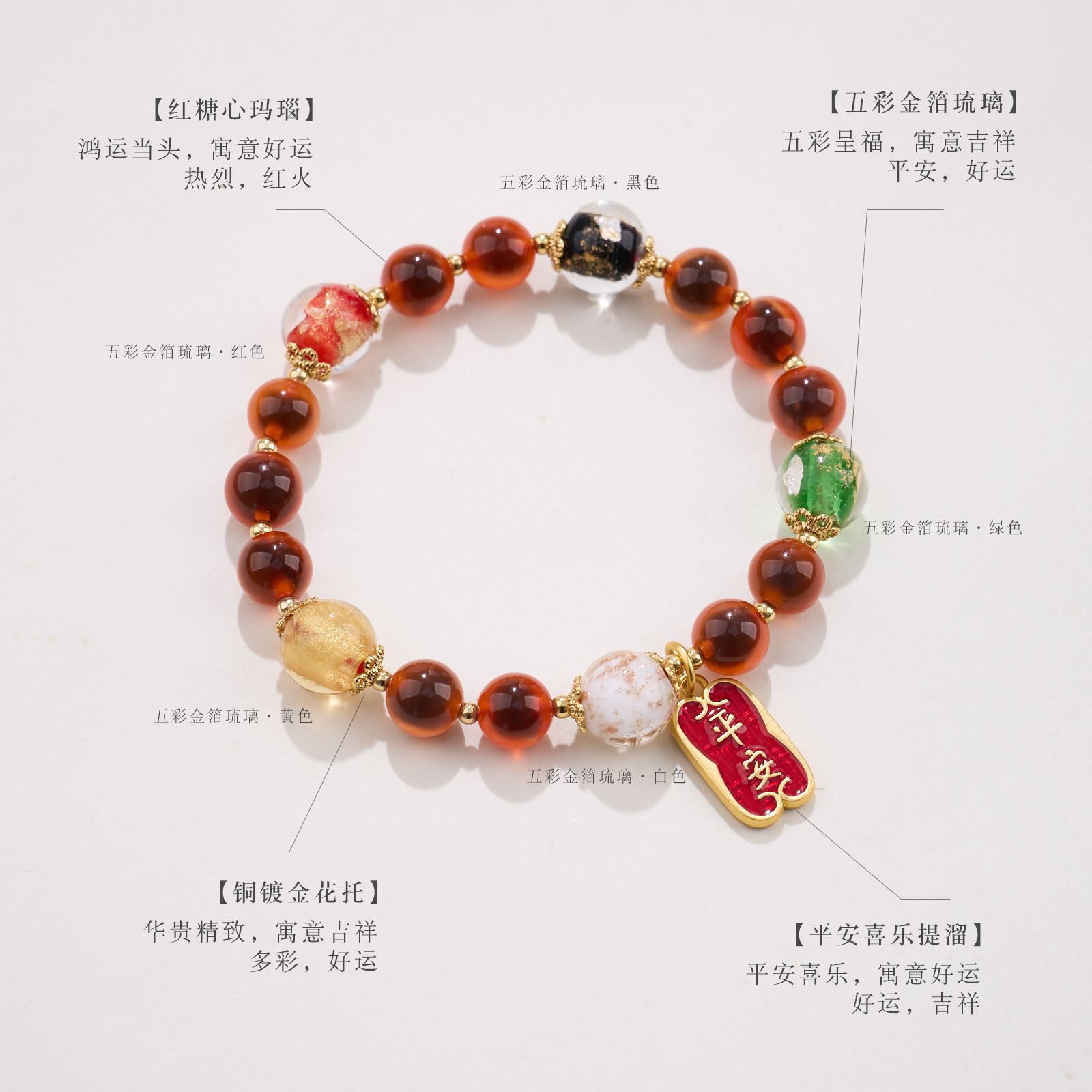 【材质】金箔琉璃、糖心玛瑙、铜镀金配件