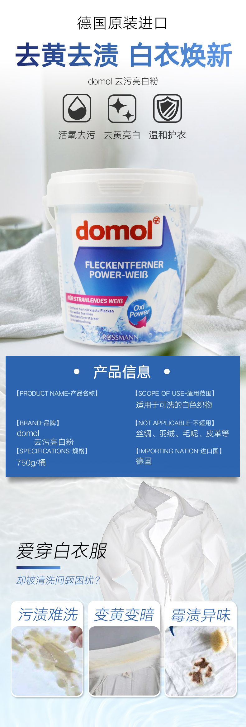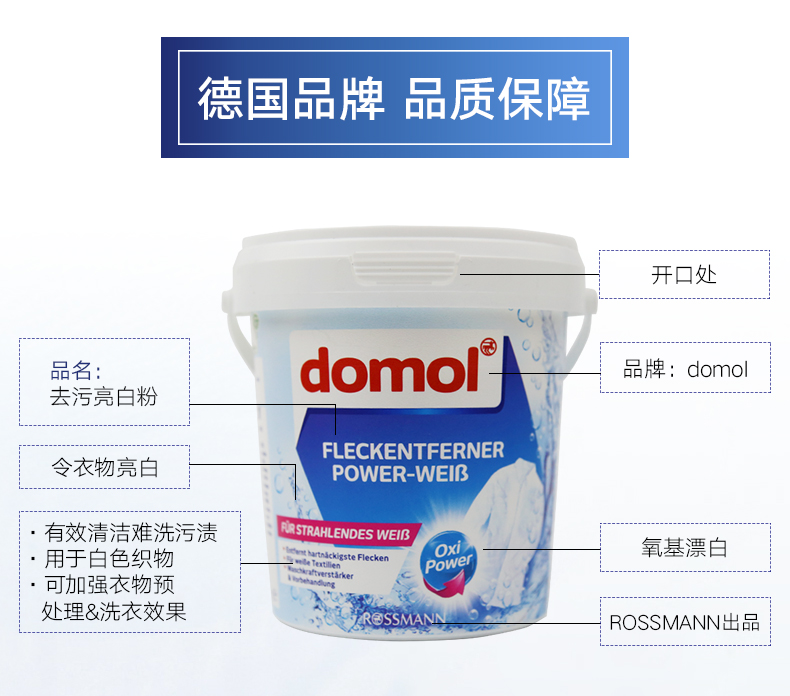 德国Domol漂白剂白衣服物去黄增白强效去渍清洁剂洗衣粉 750g/桶