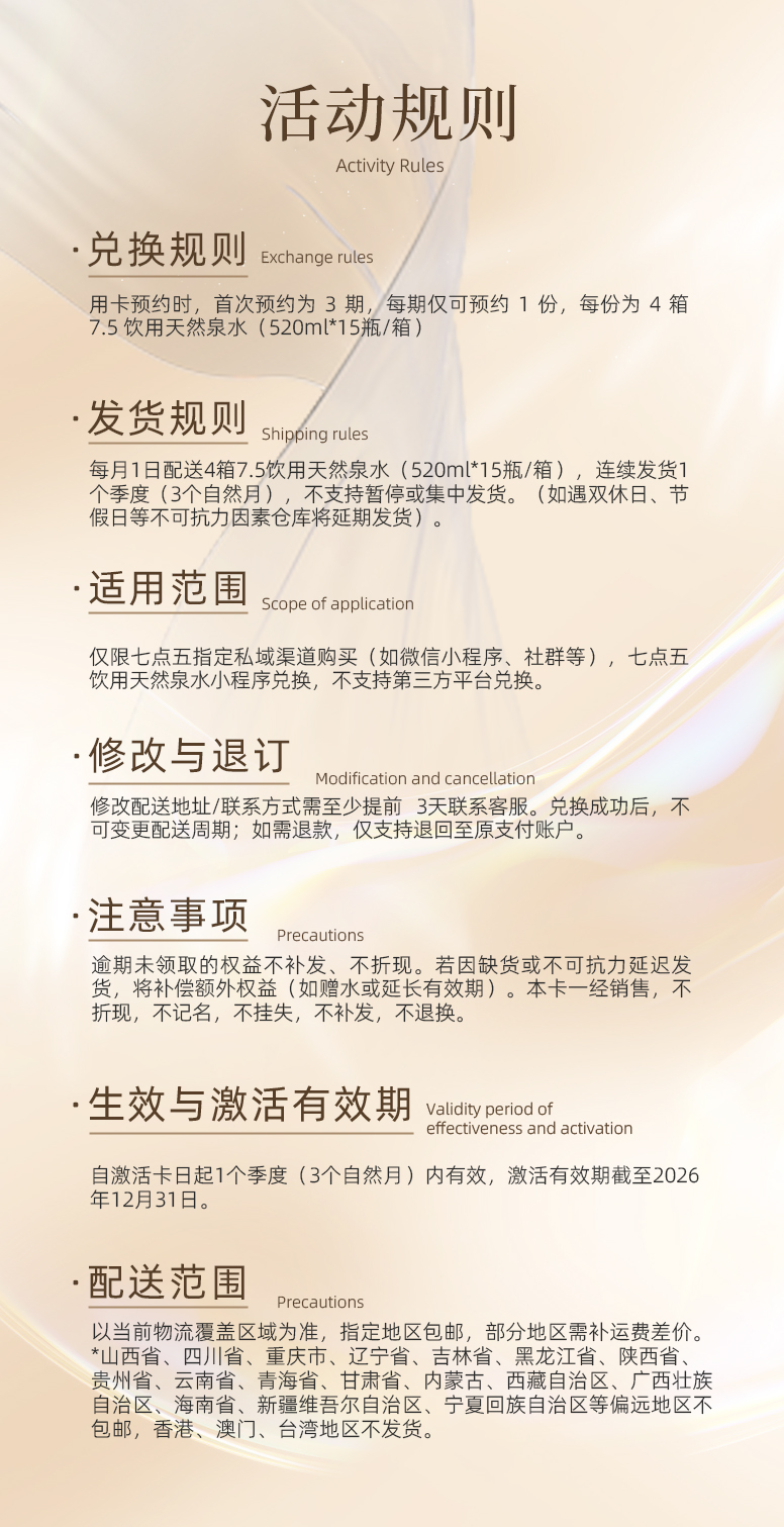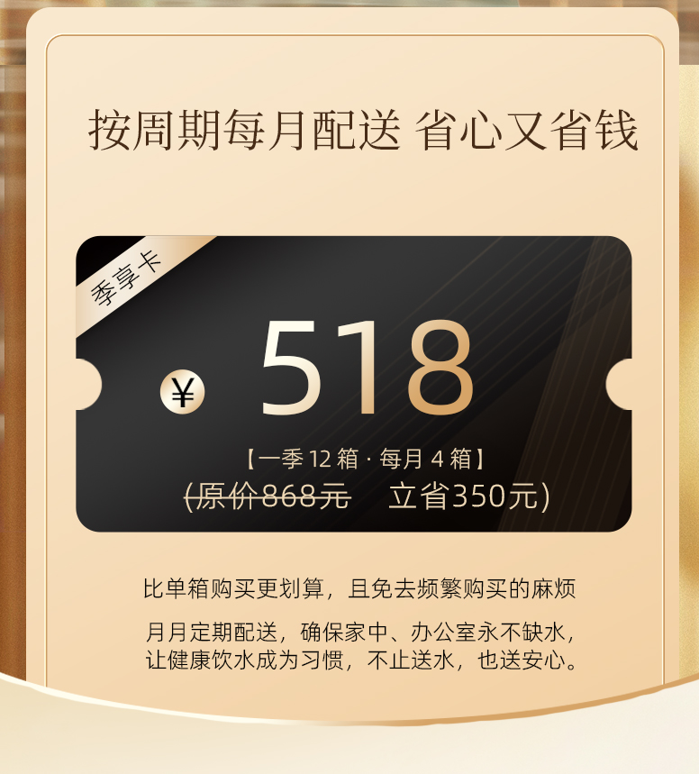 【7.5健康管家·季卡典藏计划】七点五饮用天然泉水季卡 每季12箱·每月4箱 高端弱碱饮用天然泉水 每月4箱装 520ml*15 大容量
