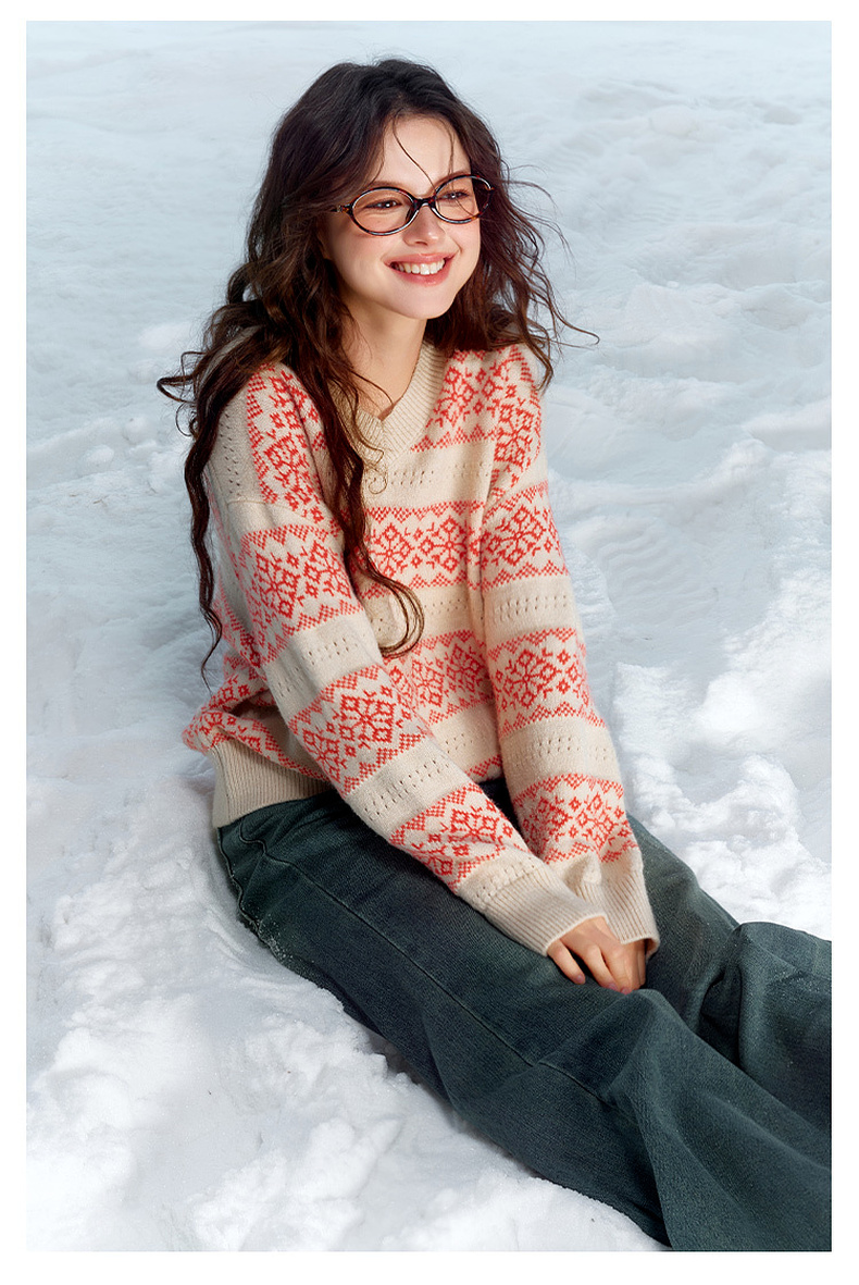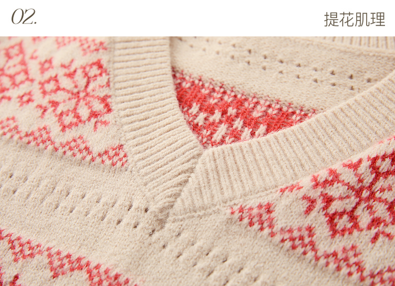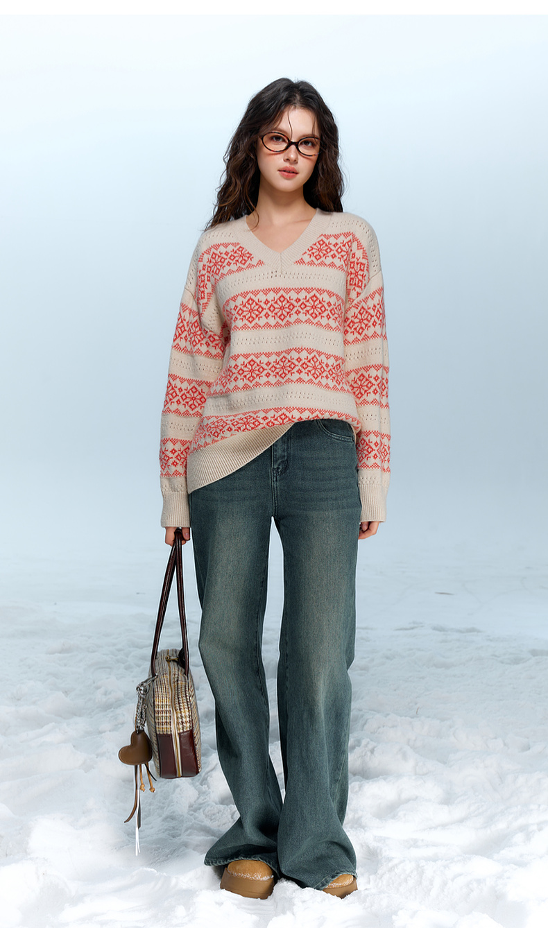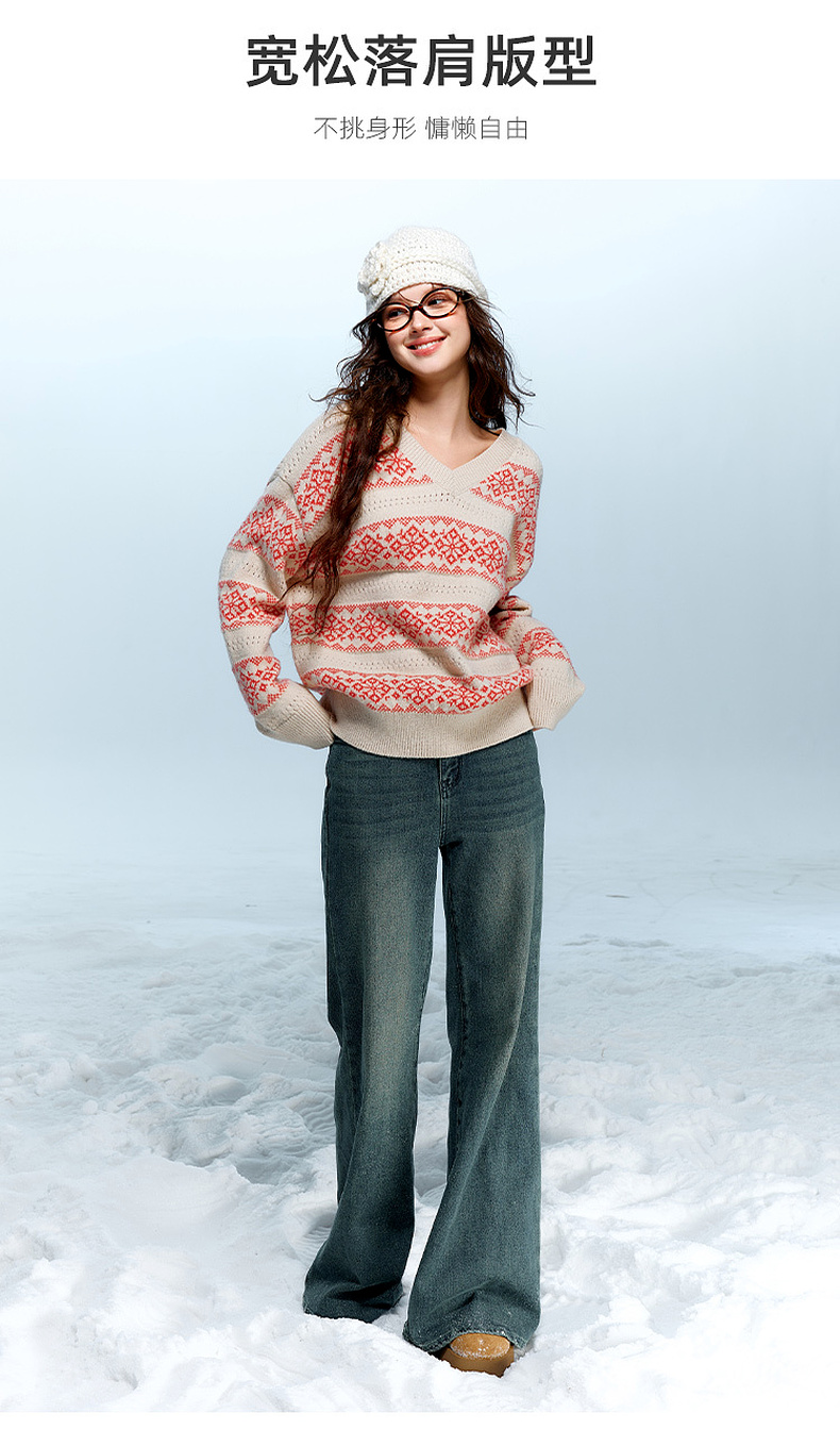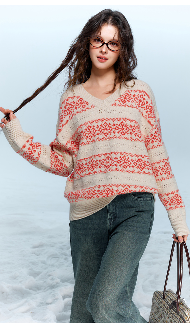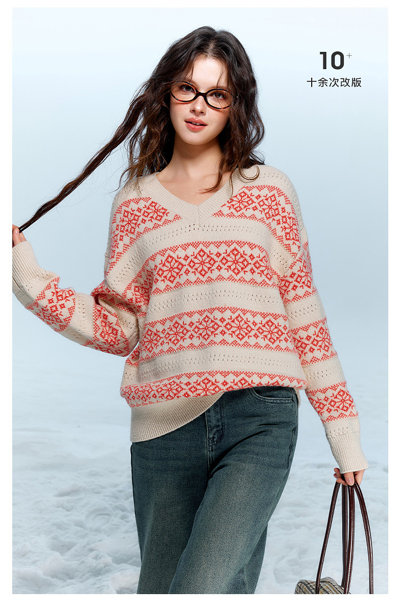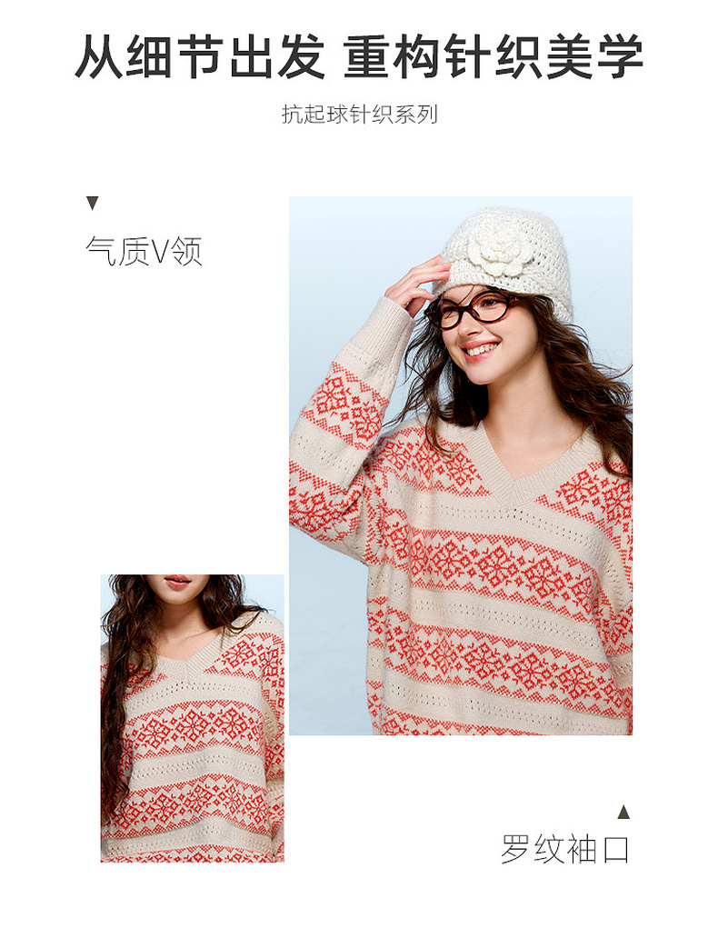 【抗起球】三彩独醒2025冬季新款V领提花针织衫长袖套头衫宽松F