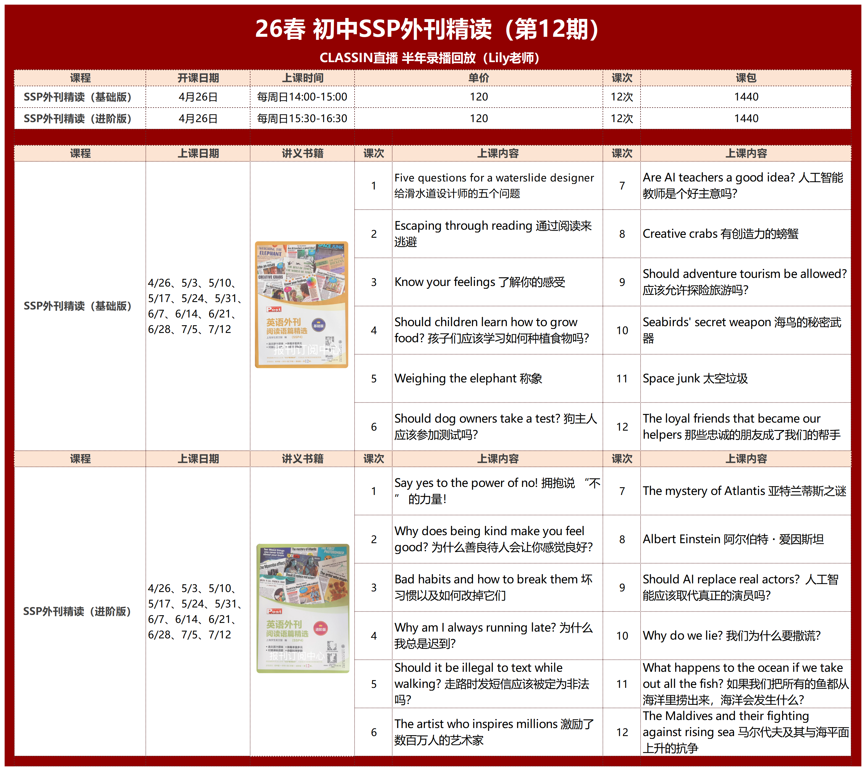 🌸《上海学生英文报》(Shanghai Students’ Post,简称 SSP),按难度分级,并配套词汇、语法、阅读理解练习,可视为一套“课外英语阅读活页教材”,是很多初中指定课外用书。