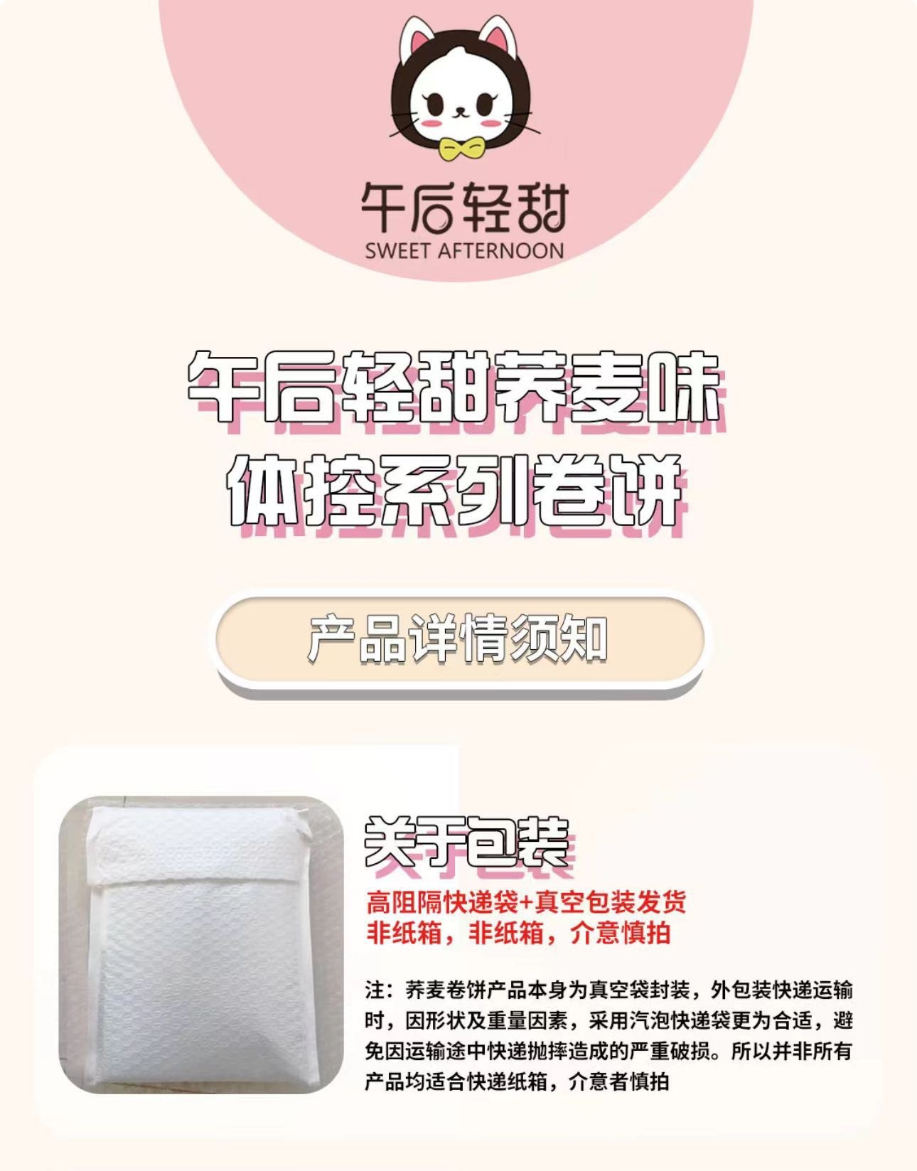 前情提要:尊敬的各位伙伴,我们做好后,真空熟制封装打包发出,收到货后,请立即放置冷冻保存,下单时请理性消费,避免浪费。接单后不退款,接单后不退款!凡是报单后不支持退款,改址,拒收,撕单!辛苦一定提前告知客户 【团品】午后轻甜粗粮控卷饼 ●上架规格A:尝鲜一斤装 净含量:500克/袋 口味:菠菜一斤装|胡萝卜一斤装 胡萝卜口味配料:胡萝卜粉,全麦粉,纯净水 波菜口味配料:菠菜粉,全麦粉,纯净水 【零售价】9.9/袋 ●上架规格B:实惠三斤装 净含量:500g/袋*3袋/组 口味:香葱味(新增)/荞麦味(原有) 香葱口味配料:全麦粉,香葱,纯净水 荞麦口味配料:荞麦粉、饮用水、食用盐 【零售价】29.9/组 ●上架规格C:超值卷饼五斤装 净含量:500g/袋*5袋/组 口味:荞麦味 荞麦口味配料:荞麦粉、饮用水、食用盐 【零售价】39.9/组 【包装信息】快递高阻隔袋➕真空袋 【贮存条件】签收后零下18度冷冻保存 【生产日期】现做现发48小时发出 【保质期】拆开真空袋零下18度冷冻保存180天 (体控卷饼现已全面升级,是完全熟制化且水分含量降标,路上运输安全)快递袋包材,真空熟制发货,非冷链,非纸箱,介意慎拍 【产地发货】山东省潍坊市/泰安市 【承运快递】极兔快递/申通快递包邮不指定快递 【不发货区域】新疆/西藏/海南不发货其他地区包邮,不接受指定快递 截单时间:当天13点,然后48小时返单号,非当天返单!接单不退! 接单现做,收到请冷冻储存 【售后标准】 ①签收24小时内,请一定打开真空袋检查,如产品在运输途中导致的变质将产品完整图及面单及产品拍照闪电售后(按单袋比例赔付) ②下单时请一定确认订单信息,收单号及时自己留意物流轨迹,因地址不详,电话错误疑难件,拒收,签收超时,不赔付;签收24小时内售后,不接受以任何个人原因晚签收,在门卫/代收点及周末不在公司/出差无法收货等理由原因造成的售后,不赔付! ③因快递暴力,运输过程中导致外袋轻微变形、内物包装是真空袋装,不影响食用,不在售后范围内,不赔付,介意者勿拍; ④因口感不喜欢、品相不好、储存不当不售后不赔付; 注:‼️🔺⚠️🔺真空漏气,这种真空只限于运输途中使用;快递的暴力运输都有可能造成真空漏气,,收到包裹后及时检查一下,如果没有问题,请及时放冰箱冷冻保存,不要冷藏,签收如漏气但未变质的不在理赔范围,请悉知‼️‼️