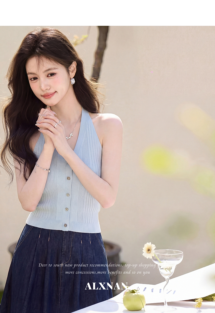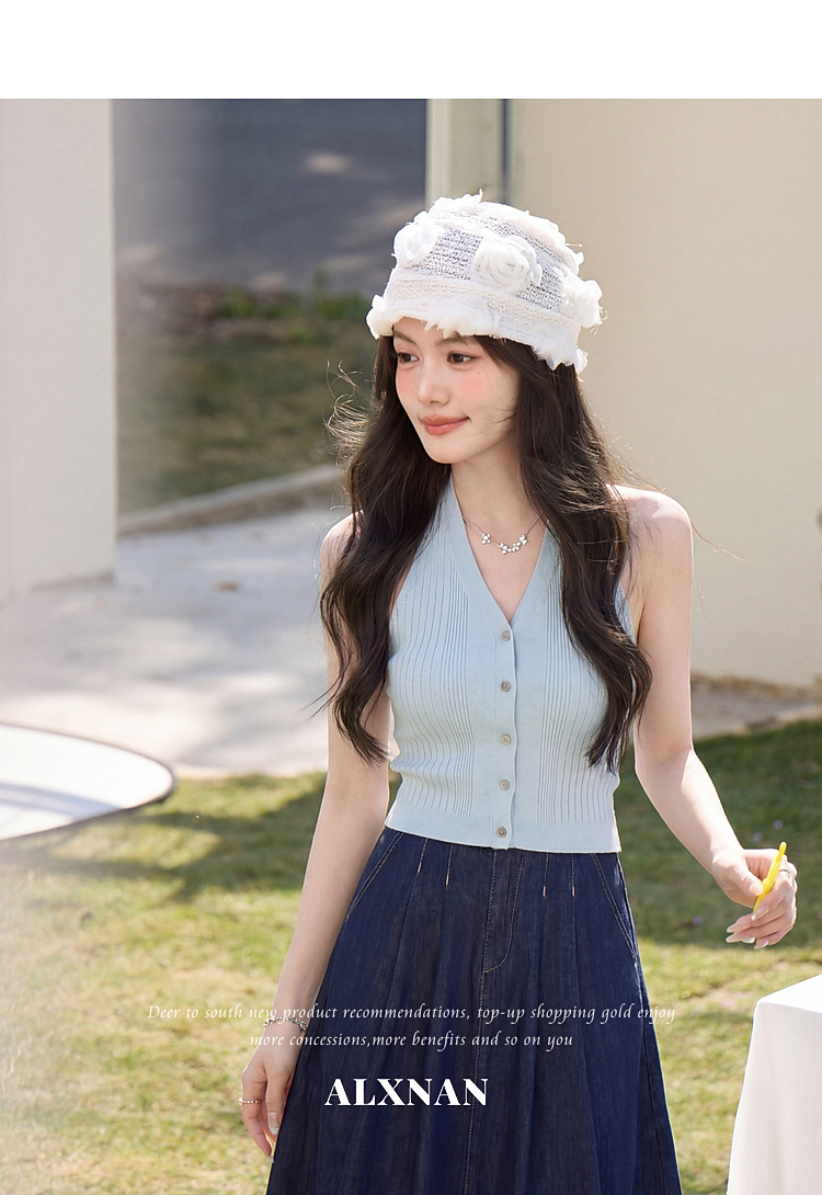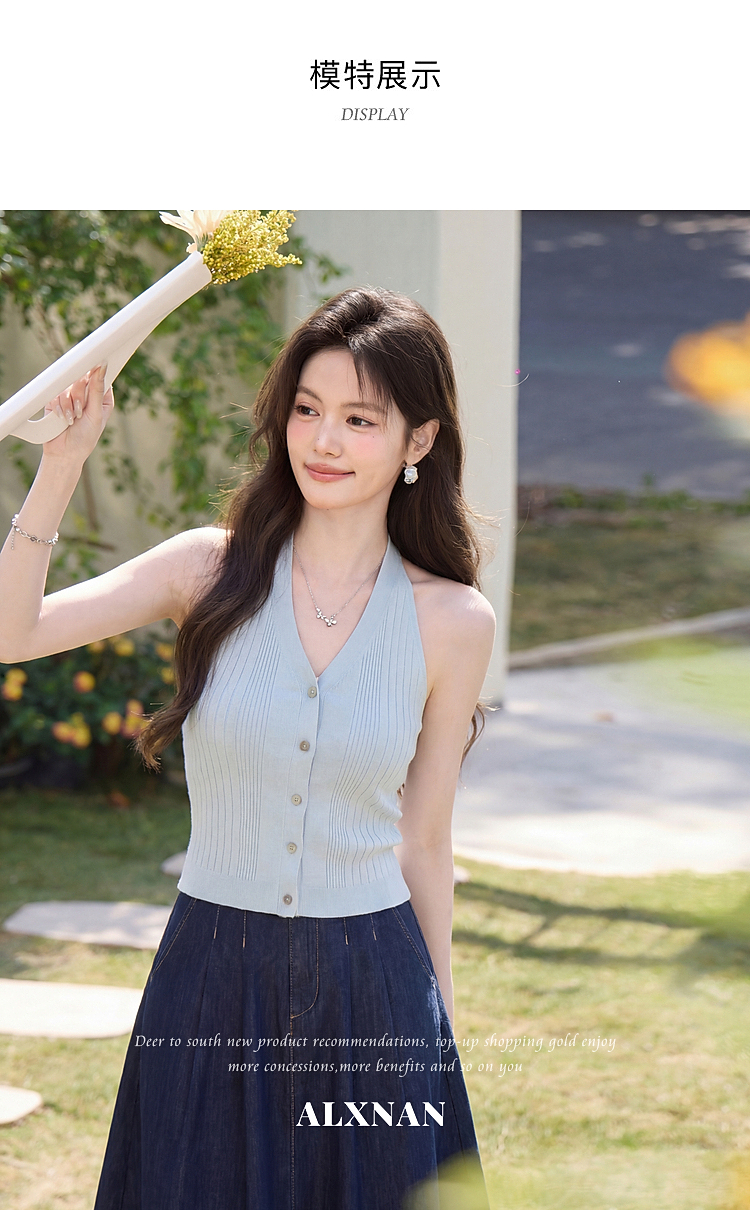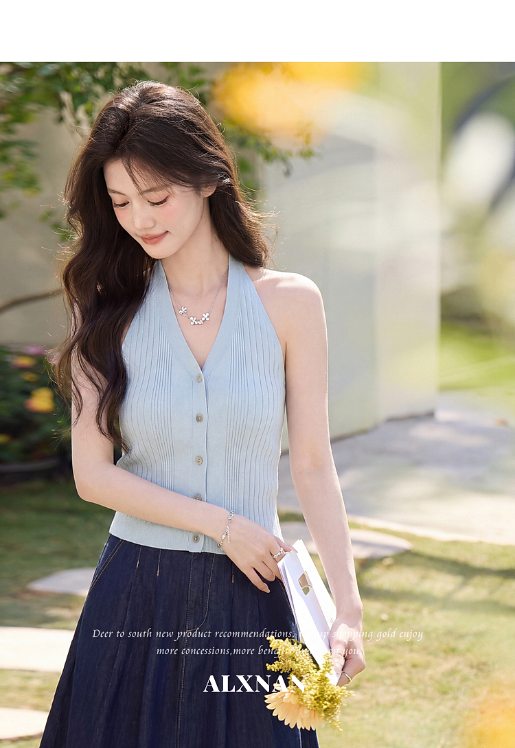 鹿向南「山野柔风」蓝色背心吊带女夏新款时尚百搭设计感无袖上衣