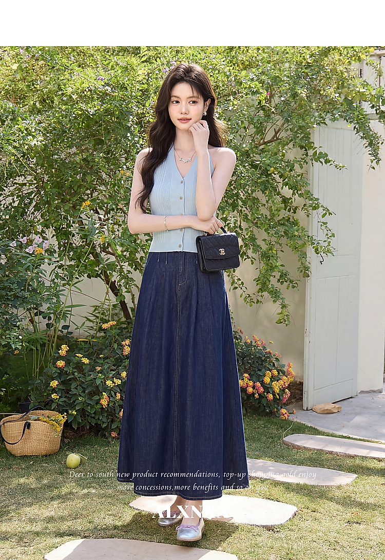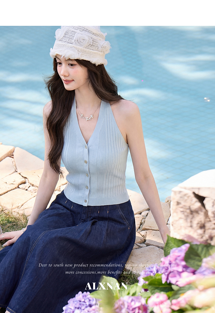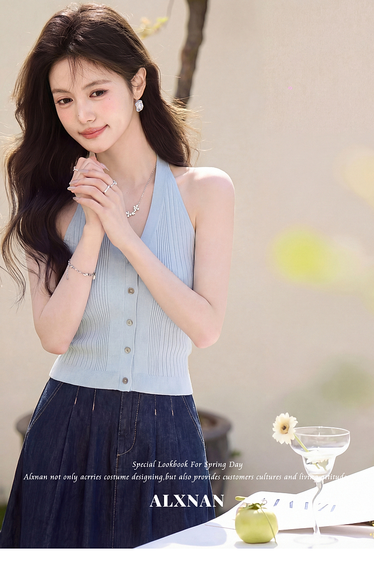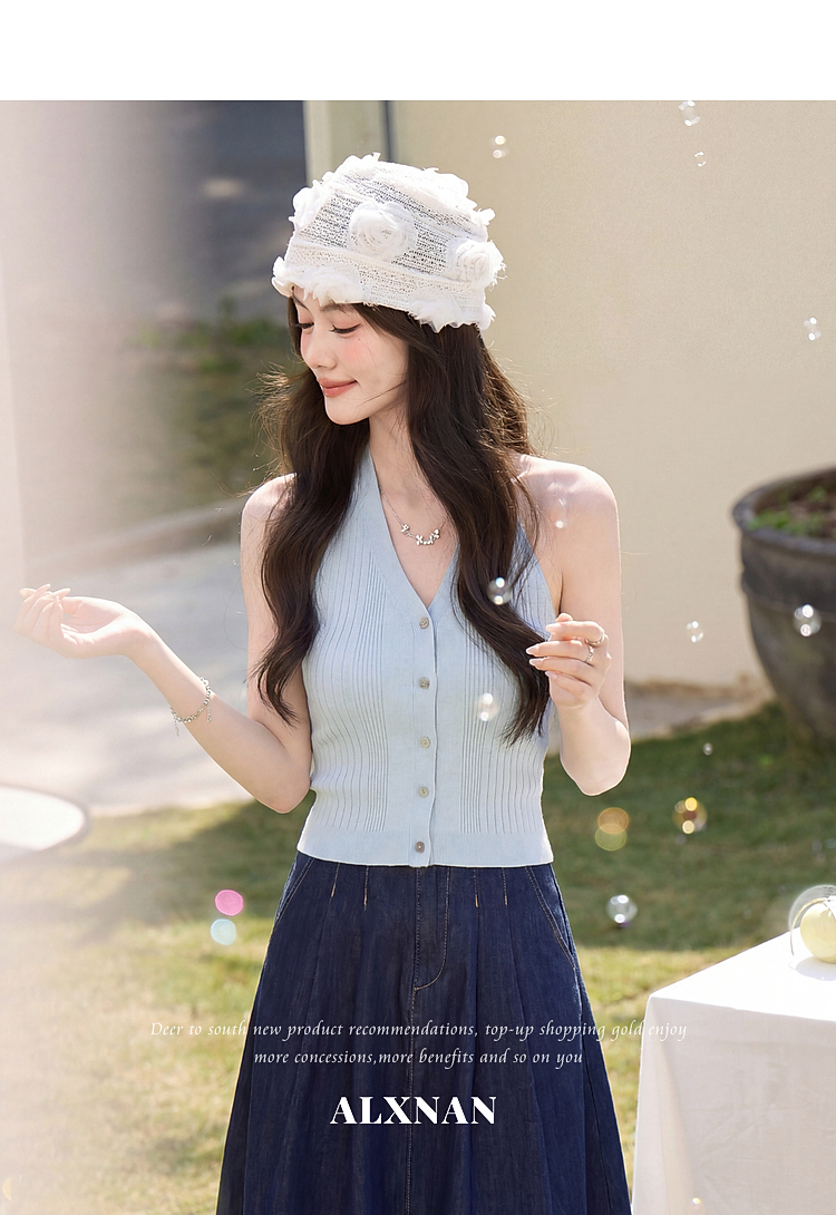鹿向南「山野柔风」蓝色背心吊带女夏新款时尚百搭设计感无袖上衣