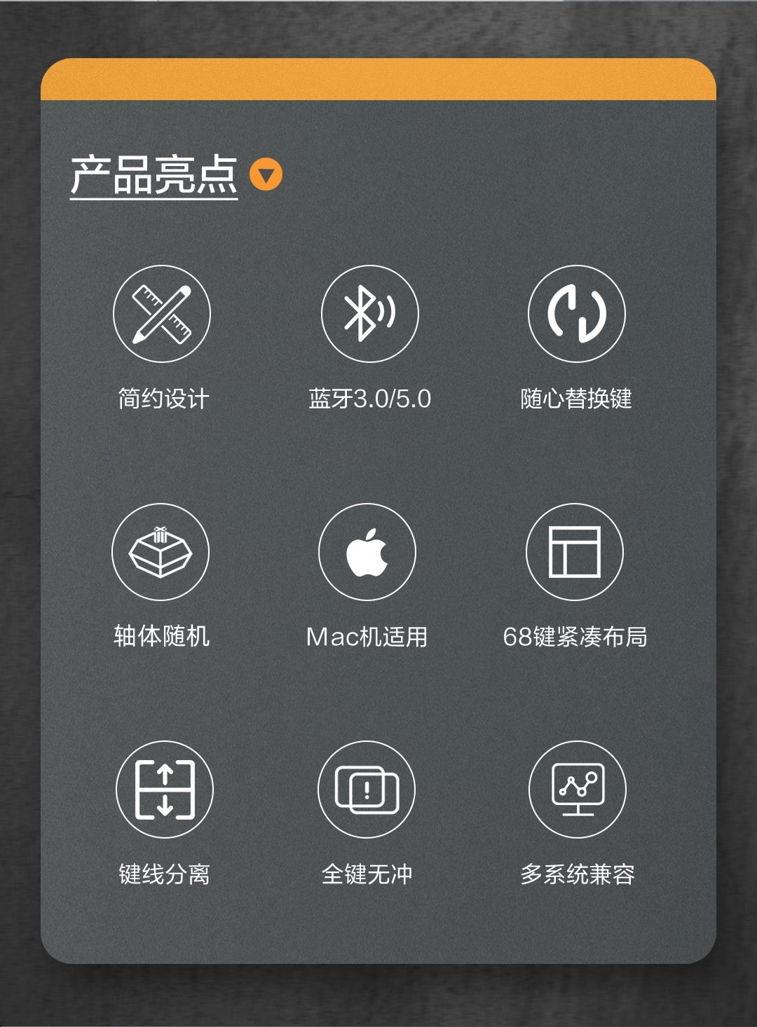 咖啡豆色,颜值很高,采用佳达隆“G黄Pro”轴体,支持热插拨,支持有线和蓝牙,充电一次可持续工作200小时